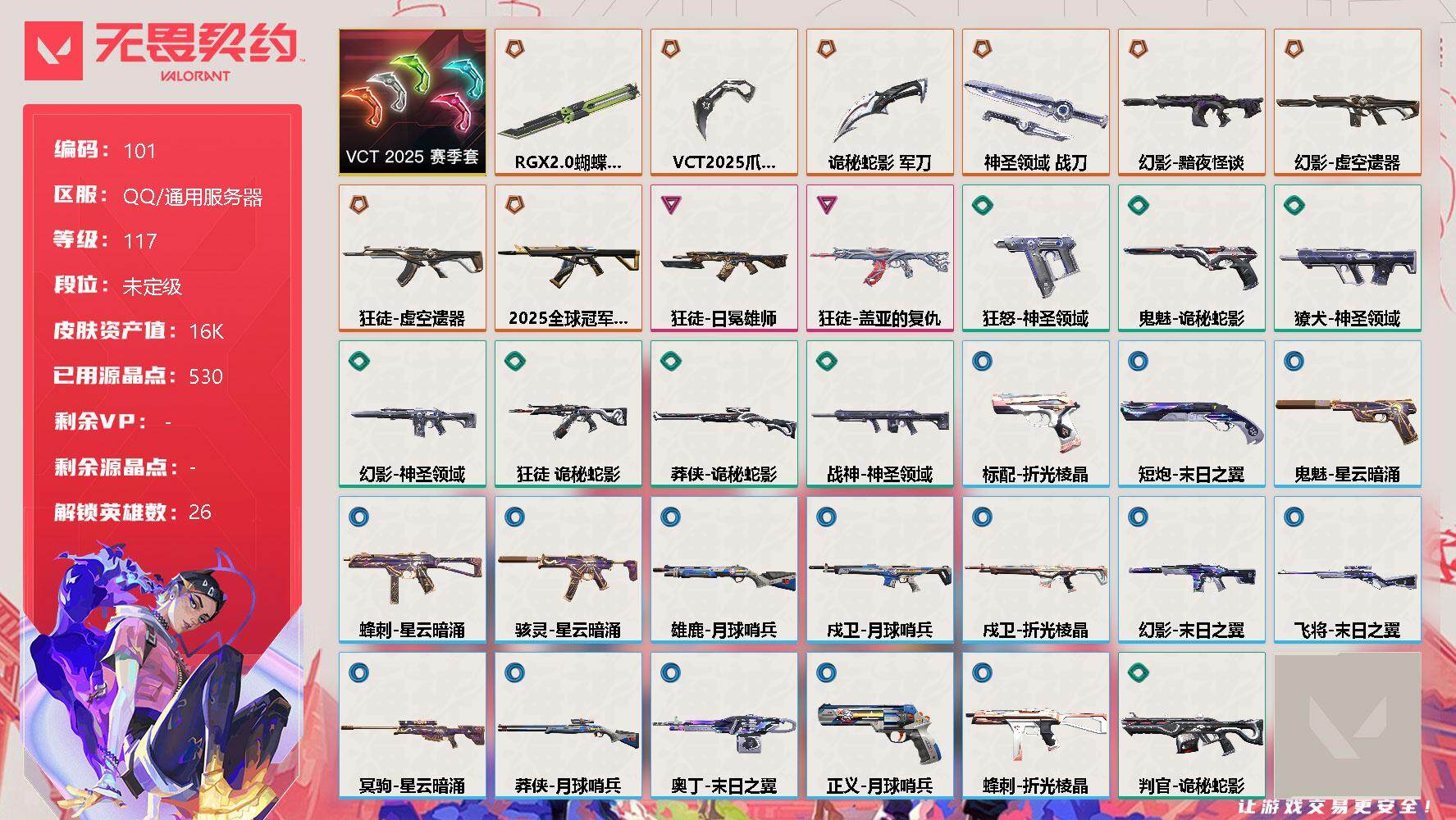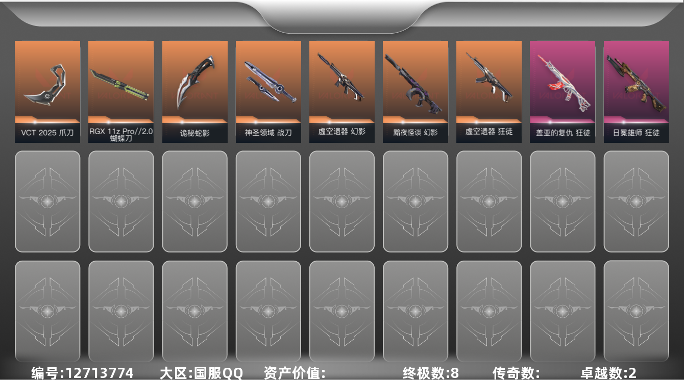 [12713774]【套装】:VCT 2025 赛季套装 【英雄】:幻棱,炼狱,维斯,暮蝶,钛狐,壹决,铁臂,捷风,雷兹,幽影,不死鸟,贤者,猎枭,蝰蛇,零,芮娜,奇乐,尚勃勒,霓虹,斯凯,夜露,K/O,海神,盖可,黑梦,钢锁 【近战 武器】:近战武器-RGX 11z Pro//2.0 蝴蝶刀,近战武器-VCT 2025 爪刀,近战武器-诡秘蛇影 军刀,近战武器-神圣领域 战刀 【狂徒】:狂徒-2025全球冠军赛,狂徒-虚空遗器,狂徒-盖亚的复仇,狂徒-日冕雄师,狂徒-诡秘蛇影 【幻影】:幻影-黯夜怪谈,幻影-虚空遗器,幻影-神圣领域,幻影-末日之翼 【戍卫】:戍卫-月球哨兵,戍卫-折光棱晶 【獠犬】:獠犬-神圣领域 【冥驹】:冥驹-星云暗涌 【飞将】:飞将-末日之翼 【莽侠】:莽侠-诡秘蛇影,莽侠-月球哨兵 【战神】:战神-神圣领域 【奥丁】:奥丁-末日之翼 【判官】:判官-诡秘蛇影 【雄鹿】:雄鹿-月球哨兵 【骇灵】:骇灵-星云暗涌 【蜂刺】:蜂刺-星云暗涌,蜂刺-折光棱晶 【标配】:标配-折光棱晶 【正义】:正义-月球哨兵 【鬼魅】:鬼魅-诡秘蛇影,鬼魅-星云暗涌 【狂怒】:狂怒-神圣领域 【短炮】:短炮-末日之翼 【卡面】:南瓜盛典 卡面,无畏契约:暮蝶 卡面,《双城之战》金克丝 卡面,逆向独行 卡面 ,代号红色 卡面,新兵报到 卡面,V契约 卡面,无畏契约 卡面 【喷漆】:伤心心 喷漆,一个人的孤岛 喷漆,买装还是存钱 喷漆,暴走萝莉 喷漆,胜利属于无畏契约 喷漆,GLHF 喷漆,无畏契约 喷漆 【挂饰】:鱼骨头 挂饰,无畏契约 纪念币 挂饰