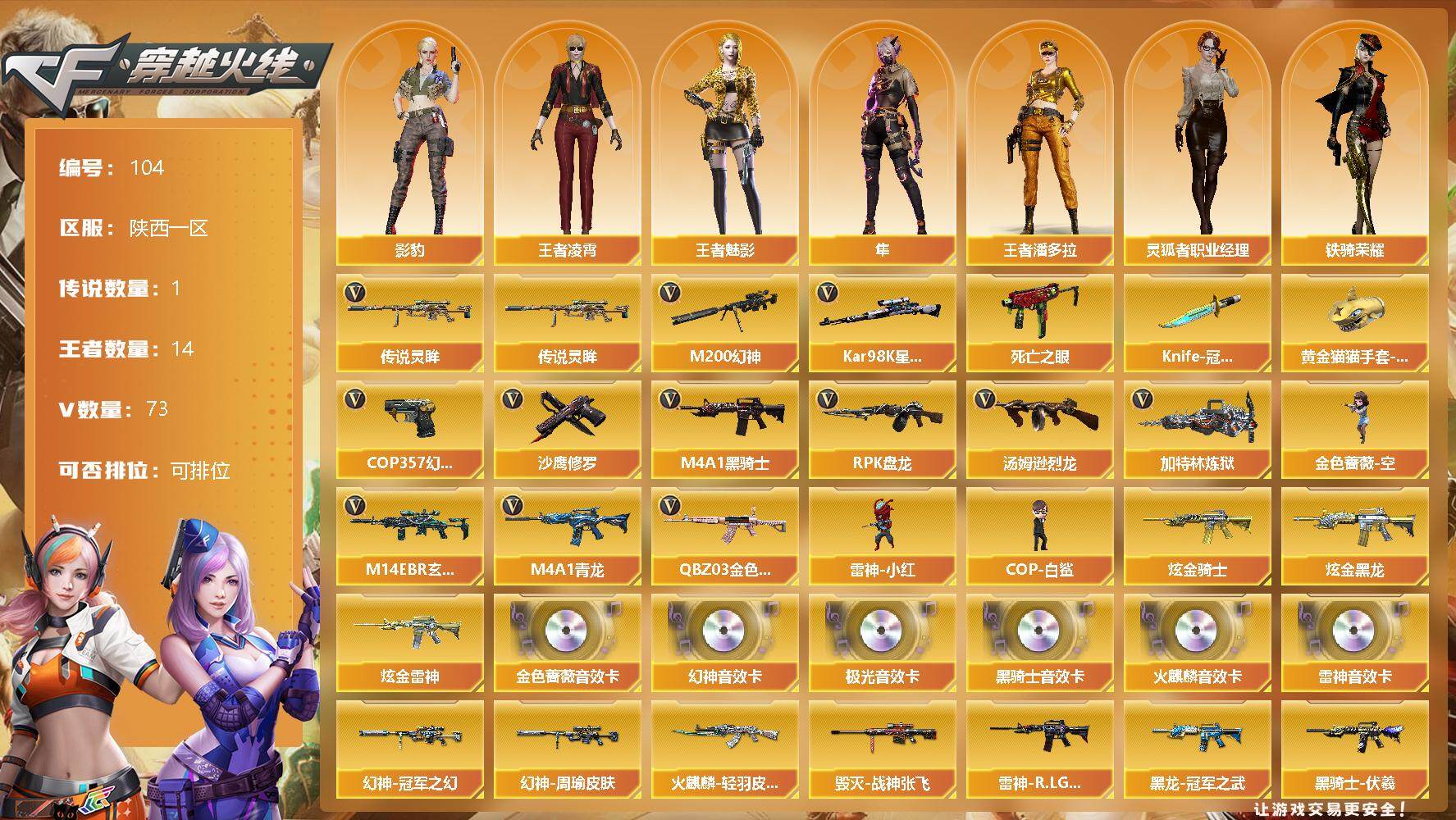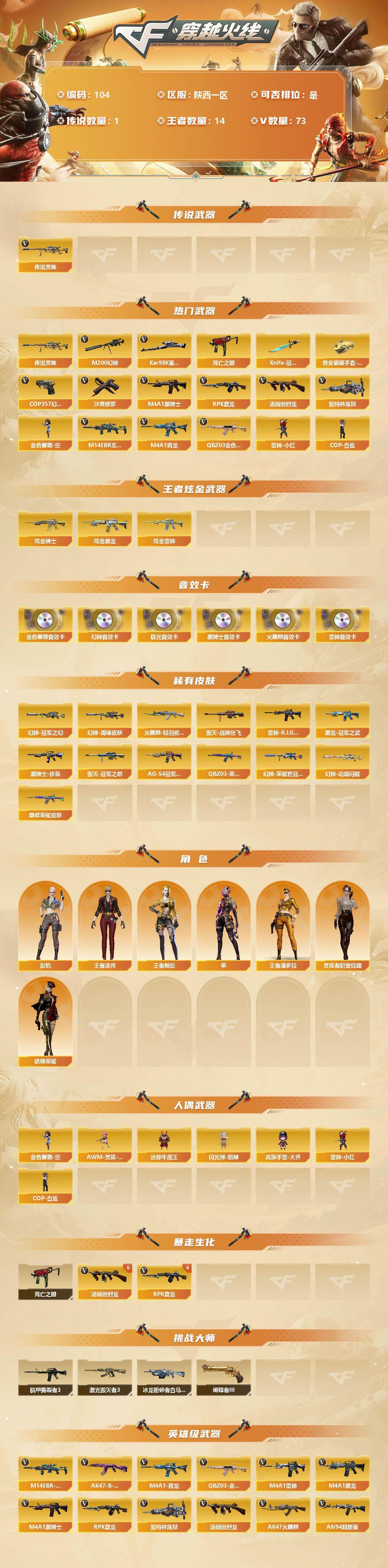 [12713884]陕西一区-73V-14王者-3炫金 【传说武器】:传说灵眸 【热门武器】:传说灵眸,QBZ03-金色蔷薇,M14EBR-玄武,M4A1-青龙,M200-幻神,死亡之眼,Kar98K-星神,M4A1-黑骑士,汤姆逊-烈龙*6,RPK-盘龙*6,加特林-炼狱,金色蔷薇-空,雷神-小红,COP-白鲨,COP 357-幻灵*2,沙鹰-修罗*2,Knife-冠军之刃,黄金猫猫手套-白鲨 【王者炫金武器】:炫金骑士,炫金黑龙,炫金雷神 【音效卡】:M200-幻神音效卡,AK47-火麒麟音效卡,M4A1-雷神音效卡,M4A1-黑骑士音效卡,Barrett-极光音效卡,QBZ03-金色蔷薇音效卡 【稀有皮肤】:幻神-周瑜皮肤,幻神-冠军之幻,M200-幻神-荣耀世冠白鲨,幻神-动感闪耀 皮肤,QBZ03-荣耀世冠白鲨,QBZ03-巅峰荣耀皮肤,雷神-R.LGD-CFPLS18冠军,火麒麟-轻羽皮肤,黑骑士-伏羲,黑骑士-AG-S4冠军典藏,黑龙-冠军之武,毁灭-冠军之怒,毁灭-战神张飞 【角色】:王者凌霄,王者-魅影,王者潘多拉,灵狐者-职业经理,影豹,隼,铁骑荣耀 【人偶武器】:雷神-小红,COP-白鲨,金色蔷薇-空,AWM-灵狐-15周年嘉年华,迷你牛魔王,闪光弹-貂蝉,高爆手雷-大乔 【暴走生化】:死亡之眼 【挑战大师】:机甲撕裂者III,阐释者III,激光毁灭者III,冰龙粉碎者-白马银枪 【英雄级武器】:COP 357-幻灵*2,幻灵之锋*4,烈火-动感闪耀,天神-动感闪耀,屠龙-动感闪耀,手雷-动感闪耀,QBZ03-金色蔷薇,M14EBR-玄武,M4A1-青龙,无影-神兵利器,M4A1-雷神,M4A1-黑龙*2,M4A1-黑骑士,RPK-盘龙*6,加特林-炼狱,汤姆逊-烈龙*6,AK47-火麒麟,AN94-超新星,AWM-天龙,Barrett-毁灭,Barrett-极光,Kar98K-星神,M200-幻神,M4A1-猎神,黑骑士-海王,AK-47-猩红传说,AK47-B-常胜将军,沙鹰-天神,沙鹰-修罗*2,麒麟刺,屠龙 【特殊枪械】:1黑骑士,6烈龙,6盘龙,1炼狱