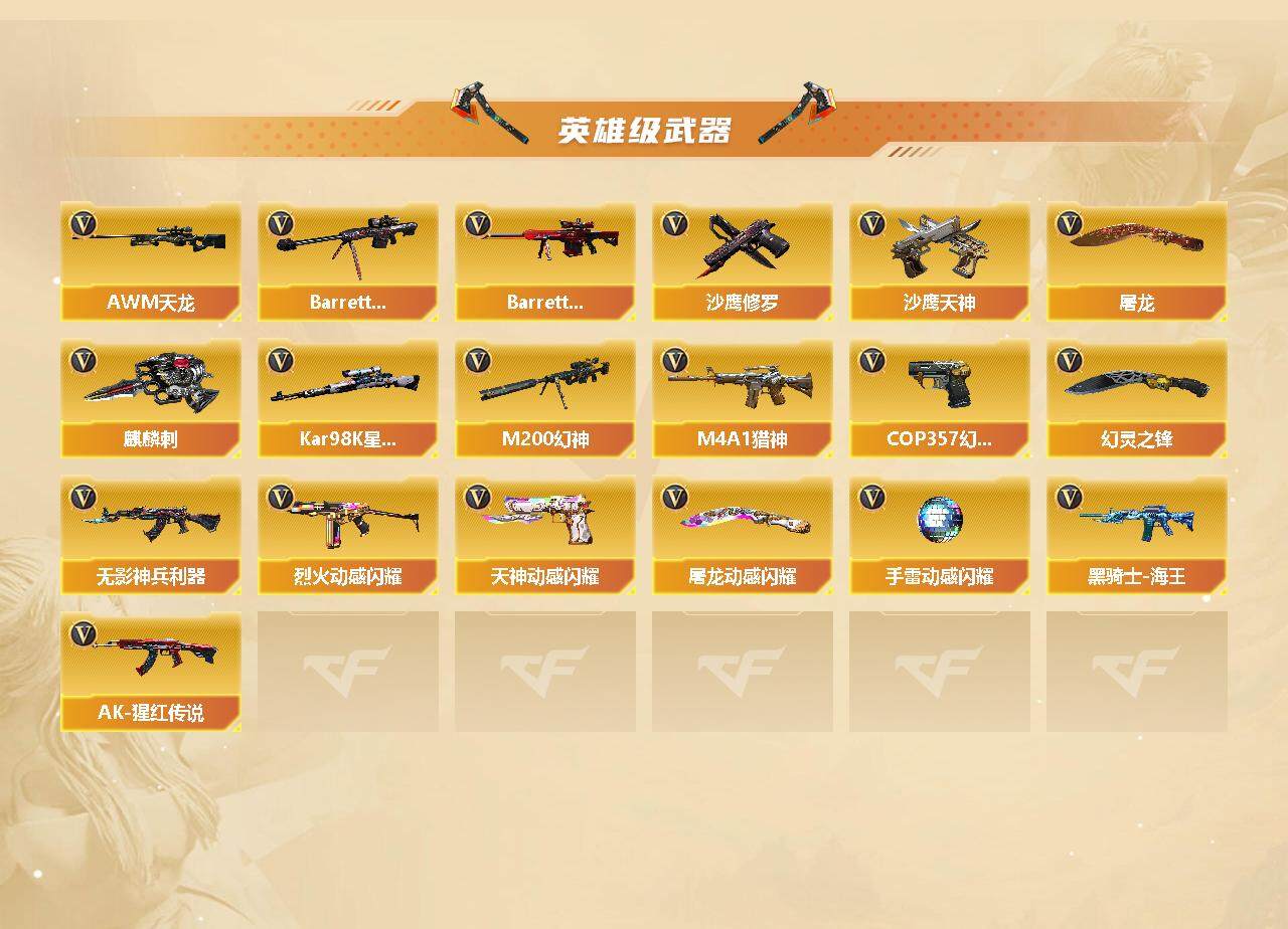 【英雄级武器】:COP 357-幻灵*2,幻灵之锋*4,烈火-动感闪耀,天神-动感闪耀,屠龙-动感闪耀,手雷-动感闪耀,QBZ03-金色蔷薇,M14EBR-玄武,M4A1-青龙,无影-神兵利器,M4A1-雷神,M4A1-黑龙*2,M4A1-黑骑士,RPK-盘龙*6,加特林-炼狱,汤姆逊-烈龙*6,AK47-火麒麟,AN94-超新星,AWM-天龙,Barrett-毁灭,Barrett-极光,Kar98K-星神,M200-幻神,M4A1-猎神,黑骑士-海王,AK-47-猩红传说,AK47-B-常胜将军,沙鹰-天神,沙鹰-修罗*2,麒麟刺,屠龙