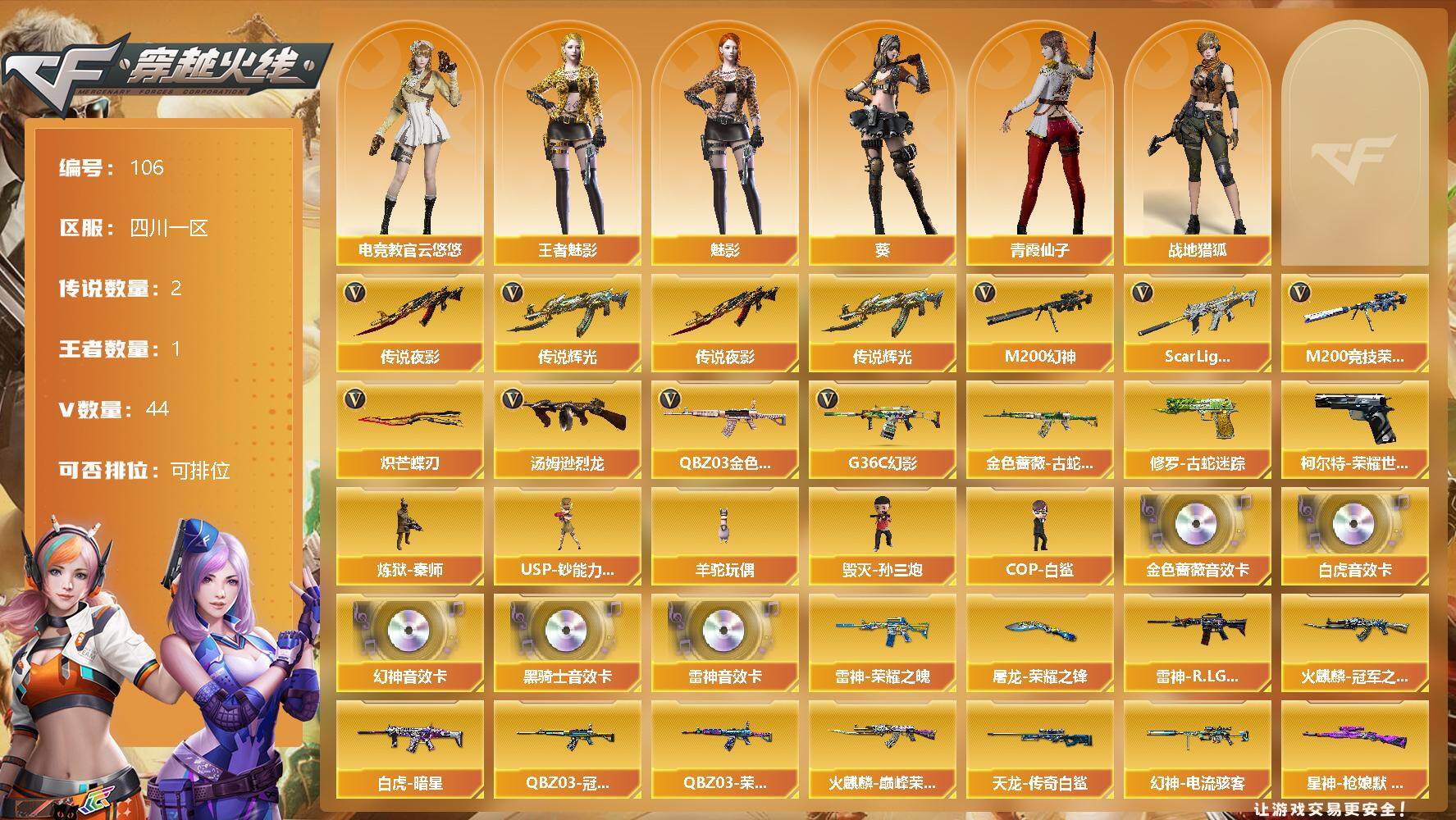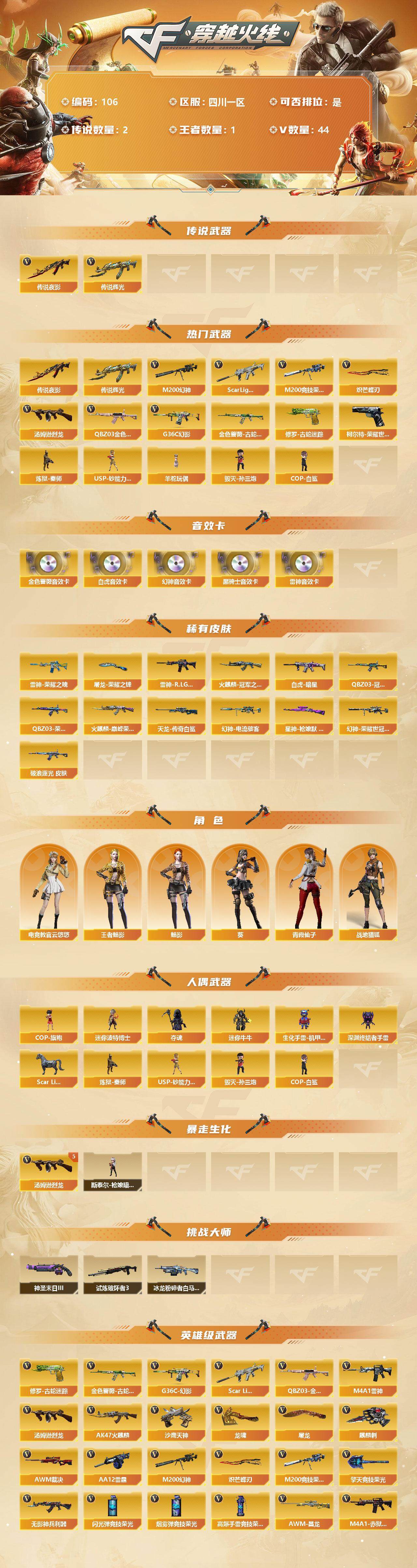 [12713967]四川一区-44V-1王者-0炫金 【传说武器】:传说夜影,传说辉光 【热门武器】:传说夜影,传说辉光,G36C-幻影,QBZ03-金色蔷薇,Scar Light-白虎,M200-幻神,柯尔特-荣耀世冠白鲨2023*2,金色蔷薇-古蛇迷踪,修罗-古蛇迷踪,M200-竞技荣光,汤姆逊-烈龙*5,炼狱-秦师,USP-钞能力灵狐,羊驼玩偶,毁灭-孙三炮,COP-白鲨,炽芒蝶刃 【音效卡】:M200-幻神音效卡,M4A1-雷神音效卡,M4A1-黑骑士音效卡,QBZ03-金色蔷薇音效卡,Scar Light-白虎音效卡 【稀有皮肤】:幻神-电流骇客 皮肤,幻神-荣耀世冠白鲨2023 皮肤,星神-枪娘默 皮肤,Scar Light-白虎-暗星*2,QBZ03-冠军之薇,QBZ03-荣耀世冠白鲨,金色蔷薇-破浪逐光 皮肤,雷神-荣耀之魄,雷神-R.LGD-CFPLS18冠军,火麒麟-冠军之心,火麒麟-巅峰荣耀,AWM-天龙-传奇白鲨,屠龙-荣耀之锋 【角色】:王者-魅影,葵,魅影,电竞教官-云悠悠,战地猎狐,青霞仙子 【人偶武器】:USP-钞能力灵狐,炼狱-秦师,COP-白鲨,毁灭-孙三炮,COP-旗袍,Scar Light-马枪,迷你波特博士,夺魂,迷你牛牛,生化手雷-机甲核心*3,深渊终结者手雷 【暴走生化】:斯泰尔-枪娘暗刃 【挑战大师】:神圣爆裂者-末日III*2,试炼破坏者III,冰龙粉碎者-白马银枪*2 【英雄级武器】:M200-竞技荣光,擎天-竞技荣光,高爆手雷-竞技荣光*3,烟雾弹-竞技荣光*2,闪光弹-竞技荣光*2,G36C-幻影,QBZ03-金色蔷薇,Scar Light-白虎,金色蔷薇-古蛇迷踪,无影-神兵利器,M4A1-雷神,汤姆逊-烈龙*5,AK47-火麒麟,AWM-裁决,AA-12-雷霆,M200-幻神,AWM-昌龙,M4A1-赤狱骑士,修罗-古蛇迷踪,沙鹰-天神*4,炽芒蝶刃,麒麟刺,龙啸,屠龙 【特殊枪械】:1白虎,5烈龙