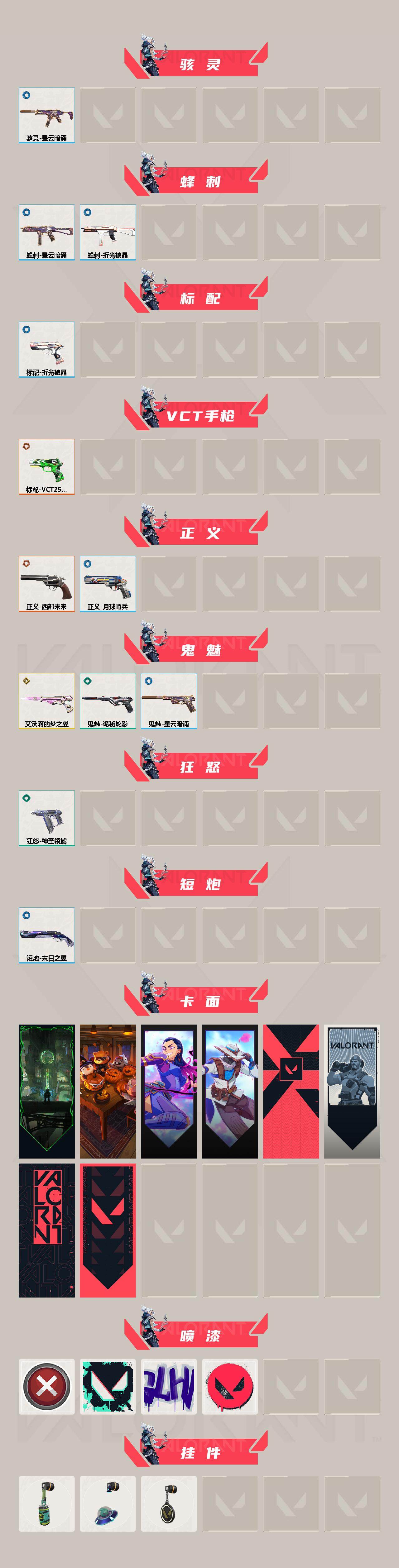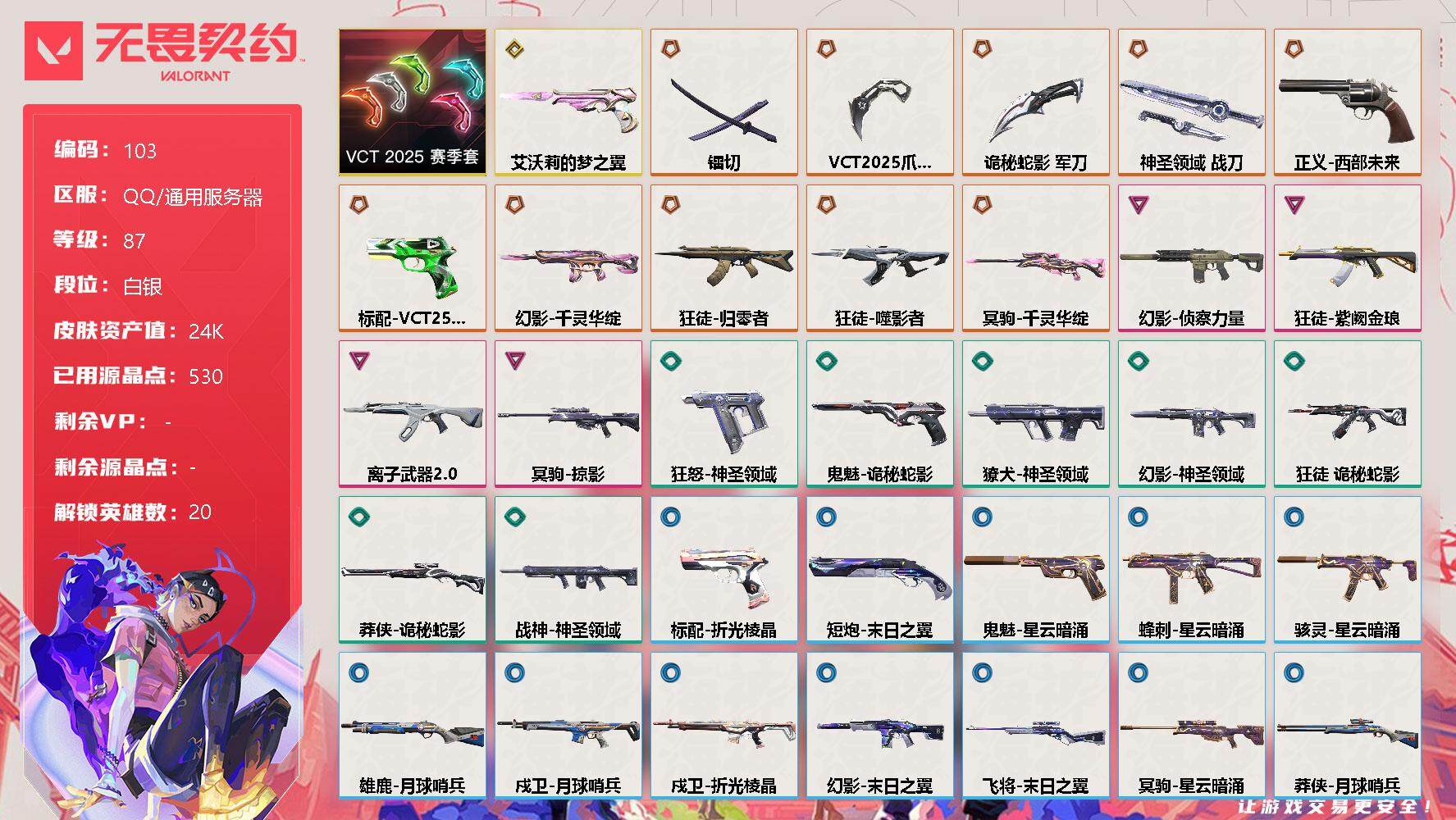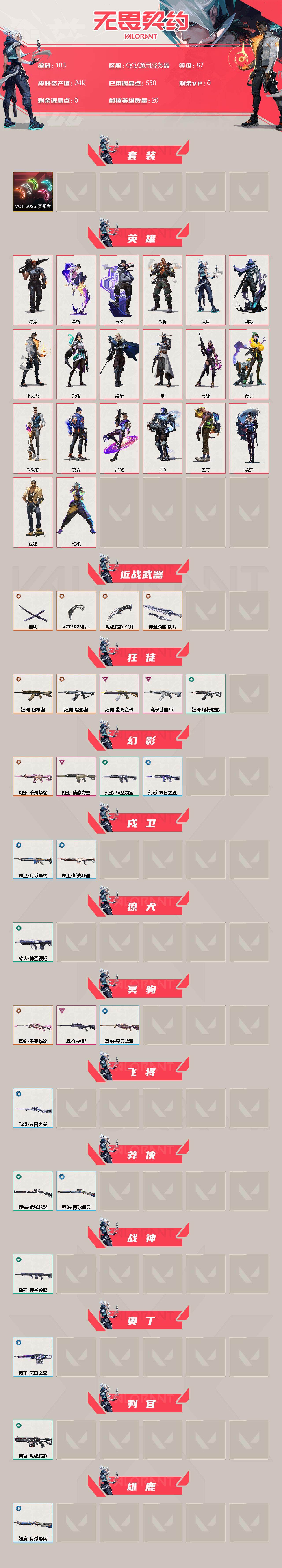 [12713986]【套装】:VCT 2025 赛季套装 【英雄】:幻棱,炼狱,暮蝶,钛狐,壹决,铁臂,捷风,幽影,不死鸟,贤者,猎枭,零,芮娜,奇乐,尚勃勒,夜露,星礈,K/O,盖可,黑梦 【近战 武器】:近战武器-VCT 2025 爪刀,近战武器-镭切,近战武器-诡秘蛇影 军刀,近战武器-神圣领域 战刀 【狂徒】:狂徒-归零者,狂徒-噬影者,狂徒-紫阙金琅,狂徒-离子武器//2.0,狂徒-诡秘蛇影 【幻影】:幻影-千灵华绽,幻影-侦察力量,幻影-神圣领域,幻影-末日之翼 【戍卫】:戍卫-月球哨兵,戍卫-折光棱晶 【獠犬】:獠犬-神圣领域 【冥驹】:冥驹-千灵华绽,冥驹-掠影,冥驹-星云暗涌 【飞将】:飞将-末日之翼 【莽侠】:莽侠-诡秘蛇影,莽侠-月球哨兵 【战神】:战神-神圣领域 【奥丁】:奥丁-末日之翼 【判官】:判官-诡秘蛇影 【雄鹿】:雄鹿-月球哨兵 【骇灵】:骇灵-星云暗涌 【蜂刺】:蜂刺-星云暗涌,蜂刺-折光棱晶 【标配】:标配-折光棱晶 【VCT手枪】:标配-VCT25 x LOUD 【正义】:正义-西部未来,正义-月球哨兵 【鬼魅】:鬼魅-艾沃莉的梦之翼,鬼魅-诡秘蛇影,鬼魅-星云暗涌 【狂怒】:狂怒-神圣领域 【短炮】:短炮-末日之翼 【卡面】:欢迎来到底城 卡面,南瓜盛典 卡面,无畏契约GO!第一卷:芮娜 卡面,无畏契约GO!第一卷:零 卡面,代号红色 卡面,新兵报到 卡面,V契约 卡面,无畏契约 卡面 【喷漆】:买装还是存钱 喷漆,胜利属于无畏契约 喷漆,GLHF 喷漆,无畏契约 喷漆 【挂饰】:Z世代特饮 挂饰,天外飞客 挂饰,无畏契约 纪念币 挂饰