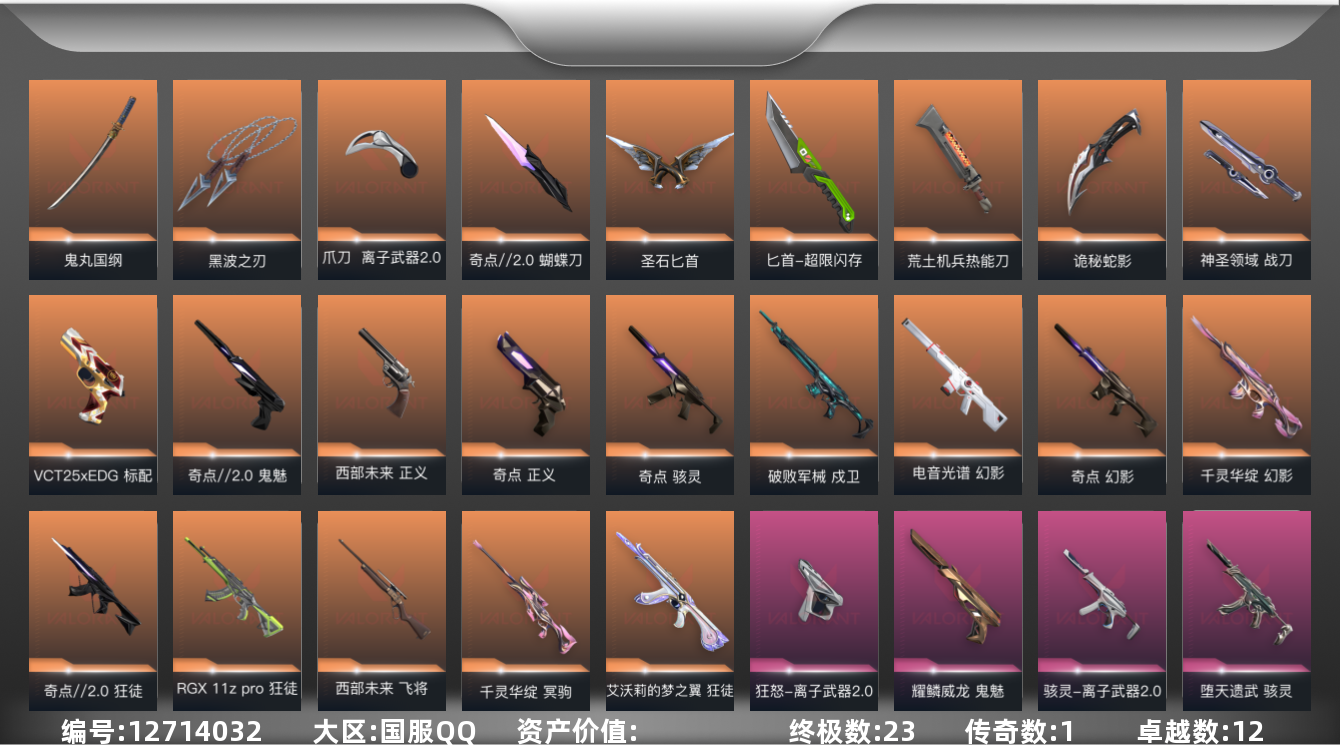 [12714032]【套装】:奇点//2.0套装,回火礼包:奇点套装,离子武器//2.0套装 【英雄】:幻棱,炼狱,维斯,暮蝶,钛狐,壹决,铁臂,捷风,雷兹,幽影,不死鸟,贤者,猎枭,蝰蛇,零,芮娜,奇乐,尚勃勒,霓虹,斯凯,夜露,星礈,K/O,海神,盖可,黑梦,钢锁 【近战 武器】:近战武器-奇点//2.0 蝴蝶刀,近战武器-黑波之刃,近战武器-鬼丸国纲,近战武器-离子武器//2.0 爪刀,近战武器-超限闪存 匕首,近战武器-荒土机兵 热能刀,近战武器-圣石匕首,近战武器-诡秘蛇影 军刀,近战武器-神圣领域 战刀 【狂徒】:狂徒-艾沃莉的梦之翼,狂徒-奇点//2.0,狂徒-RGX 11z Pro,狂徒-掠影,狂徒-盖世英雄,狂徒-海洋之星,狂徒-耀鳞威龙,狂徒-离子武器//2.0,狂徒-荒土机兵,狂徒-流星兵团,狂徒-诡秘蛇影 【幻影】:幻影-奇点,幻影-千灵华绽,幻影-电音光谱,幻影-般若假面,幻影-侦察力量,幻影-超限闪存,幻影-神圣领域,幻影-纳米打击,幻影-末日之翼,幻影-电音光谱 【戍卫】:戍卫-破败军械,戍卫-浮光跃金,戍卫-逆冲蛮牛,戍卫-战术熊与伙伴们,戍卫-月球哨兵,戍卫-折光棱晶 【獠犬】:獠犬-神圣领域,獠犬-模拟赫兹,獠犬-逆冲蛮牛 【冥驹】:冥驹-千灵华绽,冥驹-荒土机兵,冥驹-模拟赫兹,冥驹-星云暗涌 【飞将】:飞将-西部未来,飞将-战术熊与伙伴们,飞将-末日之翼 【莽侠】:莽侠-超限闪存,莽侠-诡秘蛇影,莽侠-纤云弄巧,莽侠-月球哨兵 【战神】:战神-离子武器//2.0,战神-神圣领域,战神-浮光跃金 【奥丁】:奥丁-流星兵团,奥丁-纳米打击,奥丁-末日之翼 【判官】:判官-诡秘蛇影,判官-纳米打击x 【雄鹿】:雄鹿-模拟赫兹,雄鹿-逆冲蛮牛,雄鹿-月球哨兵 【骇灵】:骇灵-奇点,骇灵-堕天遗武,骇灵-离子武器//2.0,骇灵-荒土机兵,骇灵-流星兵团,骇灵-浮光跃金,骇灵-星云暗涌 【蜂刺】:蜂刺-超限闪存,蜂刺-纤云弄巧,蜂刺-星云暗涌,蜂刺-折光棱晶 【标配】:标配-荒土机兵,标配-浮光跃金,标配-战术熊与伙伴们,标配-折光棱晶 【VCT手枪】:标配-VCT25 x EDG 【正义】:正义-奇点,正义-西部未来,正义-超限闪存,正义-复古浪潮,正义-纳米打击,正义-纤云弄巧,正义-月球哨兵 【鬼魅】:鬼魅-奇点//2.0,鬼魅-耀鳞威龙,鬼魅-诡
