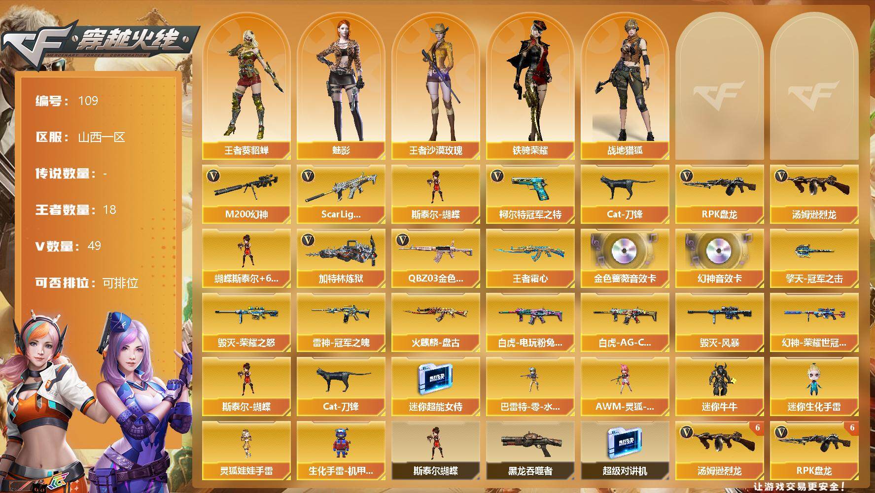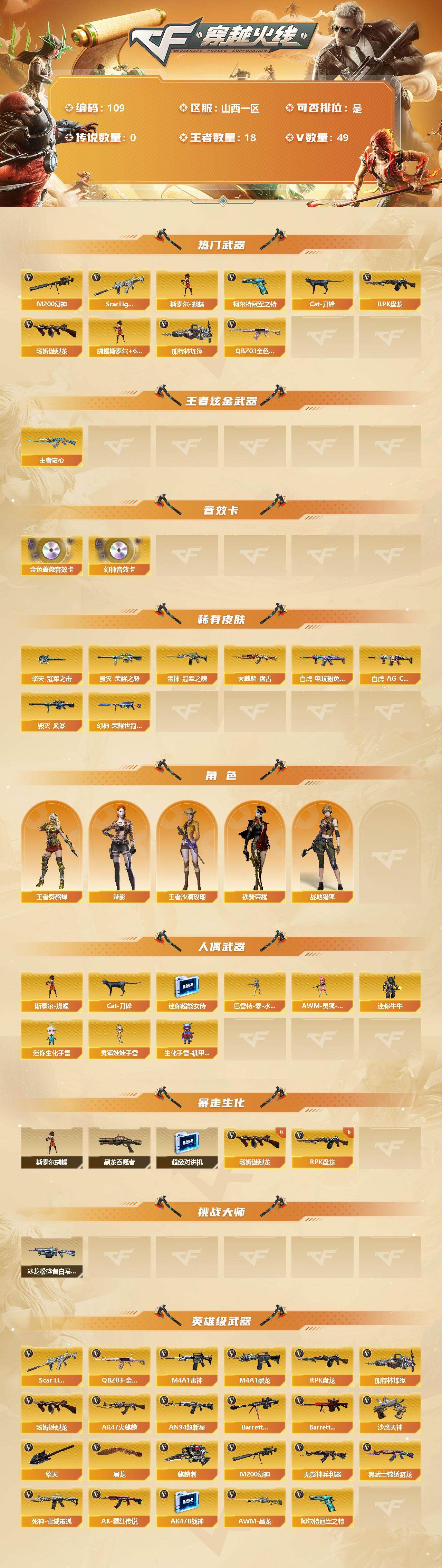 [12714128]山西一区-49V-18王者-0炫金 【热门武器】:QBZ03-金色蔷薇,Scar Light-白虎,M200-幻神,柯尔特-冠军之特*2,Cat-刀锋,汤姆逊-烈龙*6,RPK-盘龙*6,加特林-炼狱,斯泰尔-蝴蝶 【王者炫金武器】:王者霜心 【音效卡】:M200-幻神音效卡,QBZ03-金色蔷薇音效卡 【稀有皮肤】:M200-幻神-荣耀世冠白鲨,白虎-AG-CFPLS20冠军,白虎-电玩粉兔皮肤,雷神-冠军之魄,火麒麟-盘古,毁灭-荣耀之怒,毁灭-风暴,擎天-冠军之击 【角色】:王者-葵-貂蝉,王者沙漠玫瑰,魅影,战地猎狐,铁骑荣耀 【人偶武器】:斯泰尔-蝴蝶,巴雷特-零-水下丽影,AWM-灵狐-15周年嘉年华*2,Cat-刀锋,迷你超能女侍,迷你牛牛,迷你生化手雷,灵狐娃娃手雷,生化手雷-机甲核心*3 【暴走生化】:斯泰尔-蝴蝶,黑龙吞噬者,超级对讲机 【挑战大师】:冰龙粉碎者-白马银枪 【英雄级武器】:QBZ03-金色蔷薇,Scar Light-白虎,无影-神兵利器,M4A1-雷神*2,M4A1-黑龙,RPK-盘龙*6,加特林-炼狱,汤姆逊-烈龙*6,AK47-火麒麟,AN94-超新星,Barrett-毁灭,Barrett-极光,M200-幻神,黑武士-锦绣游龙,死神-雪域霜狐,AK-47-猩红传说,AK47-B-战神,AWM-昌龙,柯尔特-冠军之特*2,沙鹰-天神*5,麒麟刺*2,擎天*2,屠龙*2 【特殊枪械】:蝴蝶斯泰尔+6烈龙,1白虎,6烈龙,6盘龙,1炼狱,1蝴蝶斯泰尔