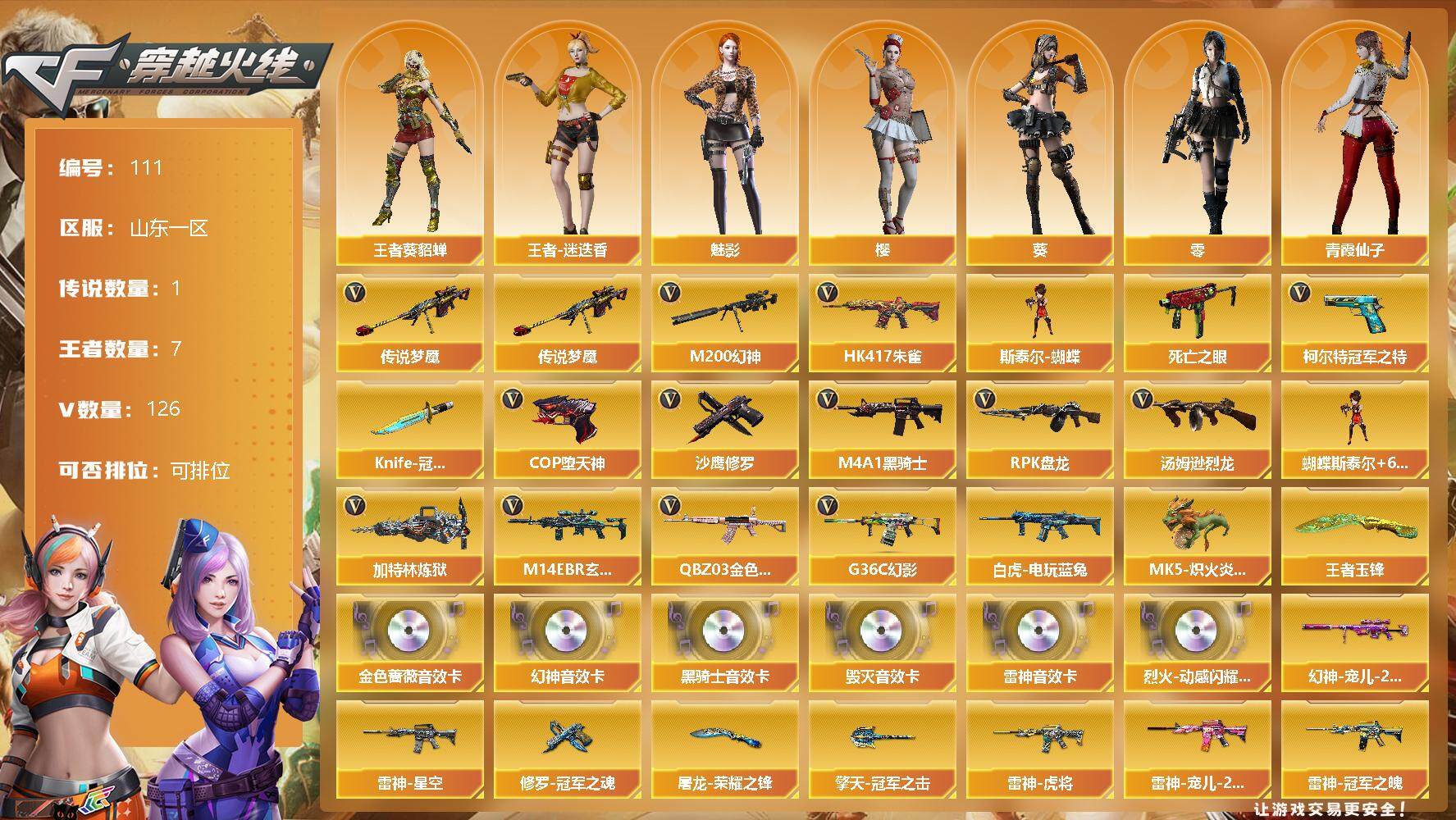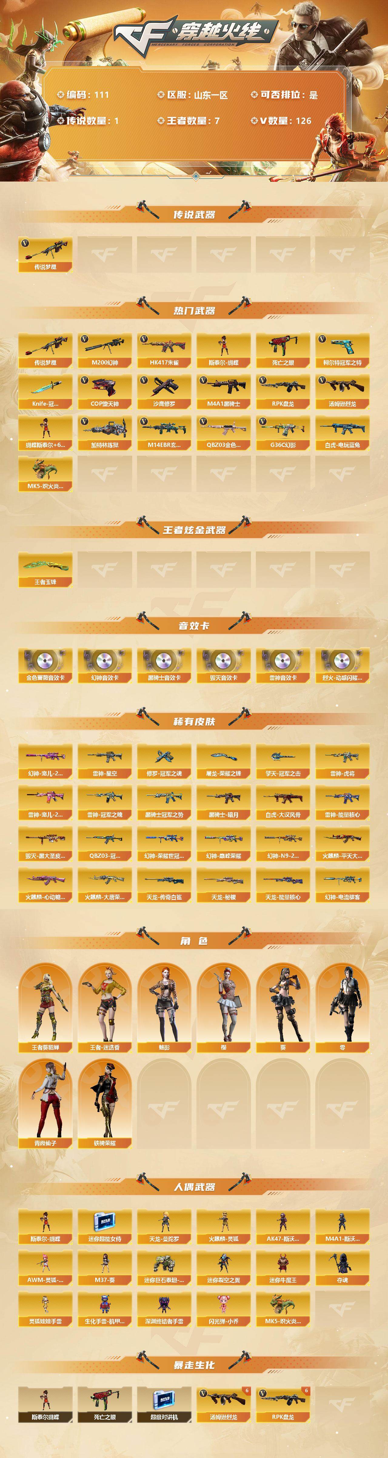 [12714204]山东一区-126V-7王者-0炫金 【传说武器】:传说梦魇 【热门武器】:传说梦魇,G36C-幻影,QBZ03-金色蔷薇,M14EBR-玄武,HK417-朱雀,M200-幻神,死亡之眼,白虎-电玩蓝兔,柯尔特-冠军之特,M4A1-黑骑士*2,汤姆逊-烈龙*6,RPK-盘龙*6,加特林-炼狱*2,斯泰尔-蝴蝶,MK5-炽火炎龙,COP-堕天神,沙鹰-修罗*2,Knife-冠军之刃 【王者炫金武器】:王者玉锋 【音效卡】:烈火-动感闪耀 音效卡,M200-幻神音效卡,M4A1-雷神音效卡,M4A1-黑骑士音效卡,Barrett-毁灭音效卡,QBZ03-金色蔷薇音效卡 【稀有皮肤】:幻神-宠儿-2021MVP,幻神-巅峰荣耀,M200-幻神-荣耀世冠白鲨,M200-幻神-N9-2022MVP,幻神-电流骇客 皮肤,白虎-大汉风骨,QBZ03-冠军之薇,雷神-能量核心,雷神-星空*2,雷神-虎将,雷神-冠军之魄,雷神-宠儿-2019MVP,火麒麟-平天大圣,火麒麟-大唐荣光,火麒麟-心动糖果,黑骑士-暗月*2,黑骑士-冠军之势,毁灭-黑大圣皮肤,天龙-秘银,天龙-能量核心,AWM-天龙-传奇白鲨,修罗-冠军之魂,屠龙-荣耀之锋,擎天-冠军之击 【角色】:王者-葵-貂蝉,王者-迷迭香,零,葵,樱,魅影,铁骑荣耀,青霞仙子 【人偶武器】:MK5-炽火炎龙,斯泰尔-蝴蝶,天龙-曼陀罗,火麒麟-灵狐,AK47-斯沃特,M4A1-斯沃特,AWM-灵狐-15周年嘉年华,M37-葵,迷你超能女侍,迷你巨石泰坦-魔花研究所,迷你裂空之翼,迷你牛魔王,夺魂,灵狐娃娃手雷,生化手雷-机甲核心,深渊终结者手雷,闪光弹-小乔 【暴走生化】:斯泰尔-蝴蝶,死亡之眼,超级对讲机 【挑战大师】:神圣爆裂者III,神圣爆裂者-末日III,激光毁灭者III,VEPR-12-金魔,激光毁灭者III-白马银枪,冰龙粉碎者-白马银枪 【英雄级武器】:M4A1-神工天巧,USP-神工天巧*2,唐刀-神工天巧,柯尔特-电竞装甲,马来剑-夜魔,COP-堕天神,麒麟刺-堕天神,斩神刀-雷暴,M4A1-武圣,烈火-动感闪耀,天神-动感闪耀,屠龙-动感闪耀,手雷-动感闪耀,G36C-幻影,QBZ03-金色蔷薇,M14EBR-玄武,HK417-朱雀,白虎-电玩蓝兔,无影-神兵利器,M4A1-雷神*4,M4A1-黑龙,M4A1