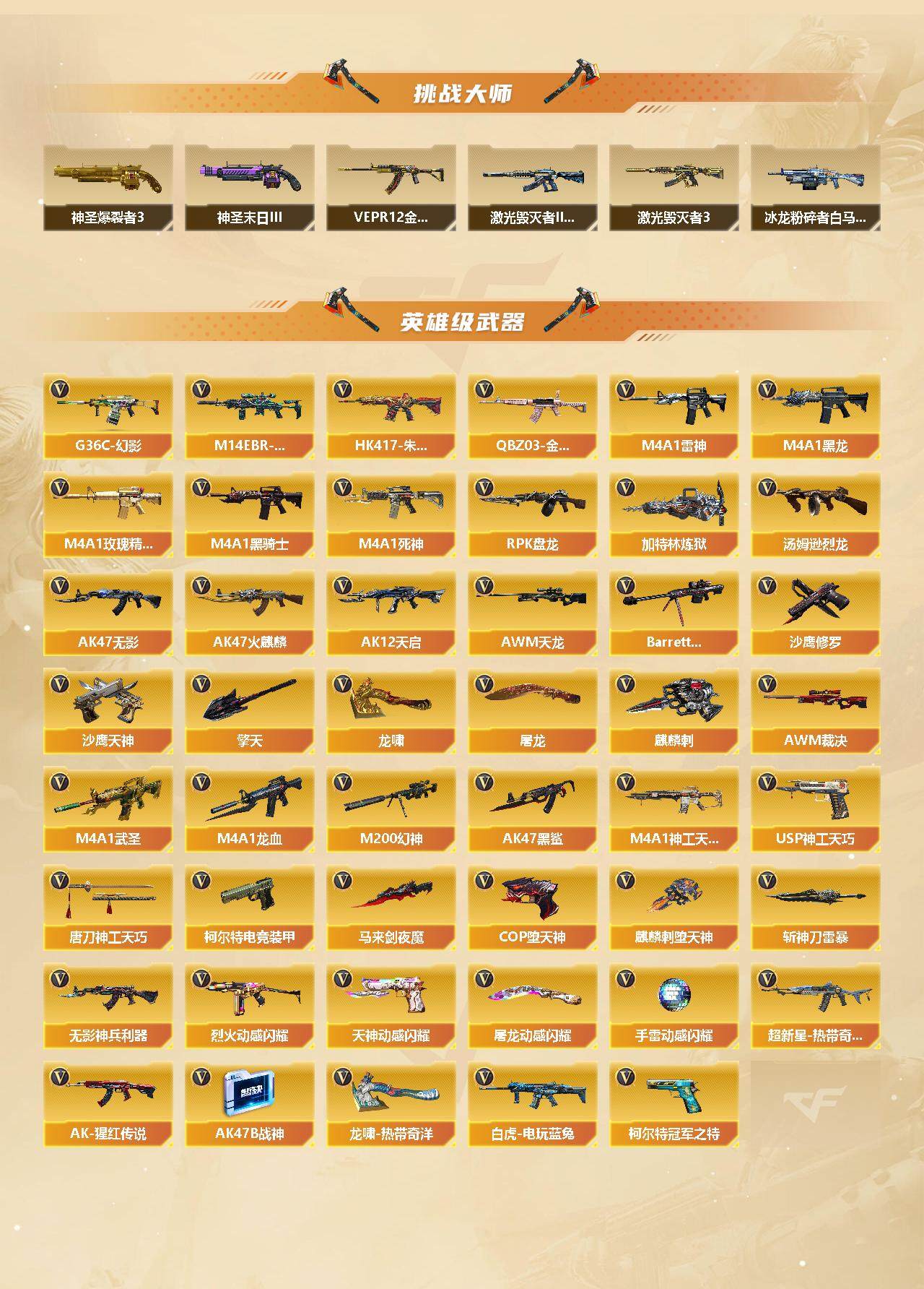 【英雄级武器】:M4A1-神工天巧,USP-神工天巧*2,唐刀-神工天巧,柯尔特-电竞装甲,马来剑-夜魔,COP-堕天神,麒麟刺-堕天神,斩神刀-雷暴,M4A1-武圣,烈火-动感闪耀,天神-动感闪耀,屠龙-动感闪耀,手雷-动感闪耀,G36C-幻影,QBZ03-金色蔷薇,M14EBR-玄武,HK417-朱雀,白虎-电玩蓝兔,无影-神兵利器,M4A1-雷神*4,M4A1-黑龙,M4A1