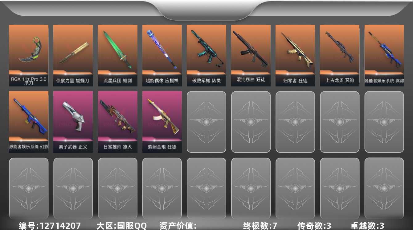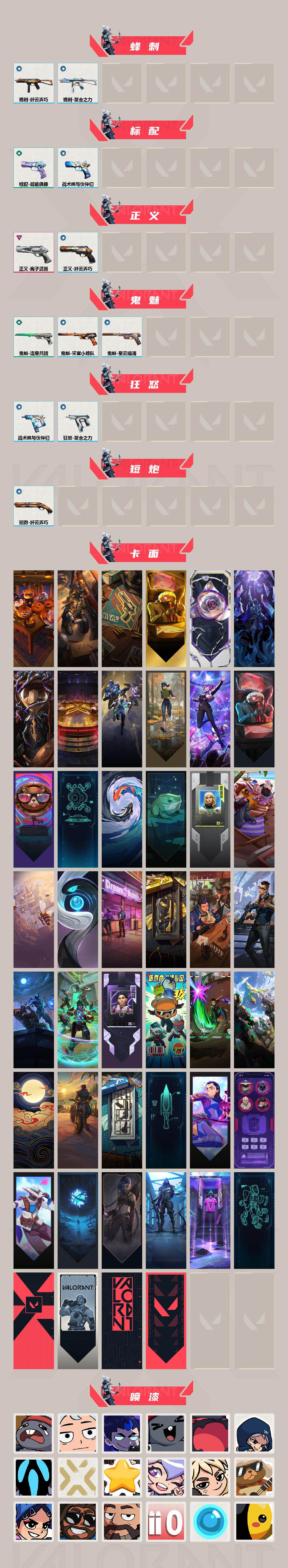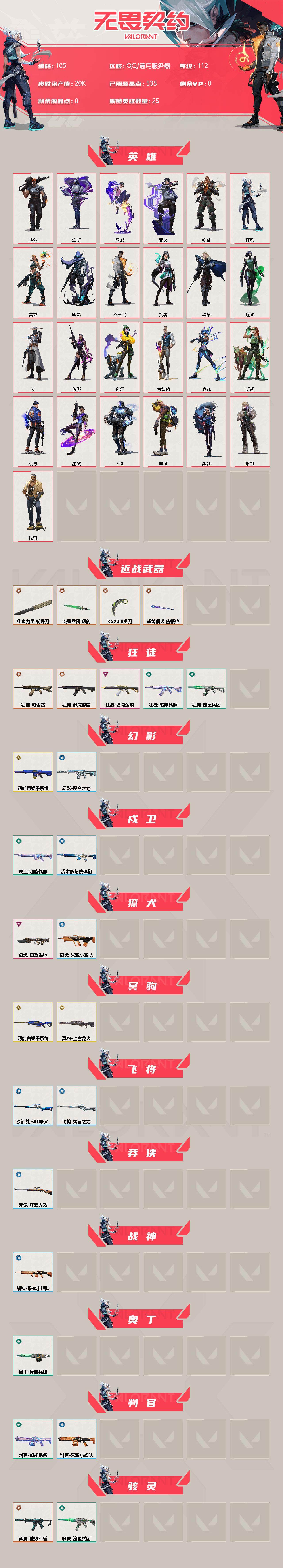 [12714207]【英雄】:炼狱,维斯,暮蝶,钛狐,壹决,铁臂,捷风,雷兹,幽影,不死鸟,贤者,猎枭,蝰蛇,零,芮娜,奇乐,尚勃勒,霓虹,斯凯,夜露,星礈,K/O,盖可,黑梦,钢锁 【近战 武器】:近战武器-侦察力量 蝴蝶刀,近战武器-RGX 11z Pro//3.0 爪刀,近战武器-流星兵团 短剑,近战武器-超能偶像 应援棒 【狂徒】:狂徒-归零者,狂徒-混沌序曲,狂徒-紫阙金琅,狂徒-超能偶像,狂徒-流星兵团 【幻影】:幻影-源能者娱乐系统,幻影-聚合之力 【戍卫】:戍卫-超能偶像,戍卫-战术熊与伙伴们 【獠犬】:獠犬-日冕雄师,獠犬-采蜜小蜂队 【冥驹】:冥驹-源能者娱乐系统,冥驹-上古龙炎 【飞将】:飞将-聚合之力,飞将-战术熊与伙伴们 【莽侠】:莽侠-纤云弄巧 【战神】:战神-采蜜小蜂队 【奥丁】:奥丁-流星兵团 【判官】:判官-超能偶像,判官-采蜜小蜂队 【骇灵】:骇灵-破败军械,骇灵-流星兵团 【蜂刺】:蜂刺-聚合之力,蜂刺-纤云弄巧 【标配】:标配-超能偶像,标配-战术熊与伙伴们 【正义】:正义-离子武器,正义-纤云弄巧 【鬼魅】:鬼魅-流星兵团,鬼魅-采蜜小蜂队,鬼魅-星云暗涌 【狂怒】:狂怒-聚合之力,狂怒-战术熊与伙伴们 【短炮】:短炮-纤云弄巧 【卡面】:南瓜盛典 卡面,修车达人 卡面,正义的化身 卡面,终章:生意人麦宝 卡面,铁之华 卡面,失而复得 卡面,时间到 卡面,最高舞台 卡面,复活专家 卡面,归乡 // 蝰蛇 卡面,超能偶像 卡面,生意人麦宝 卡面,音熊登场 卡面,声感陷阱设计图 卡面,红鳞松叶 卡面,霓帧牛蛙 卡面,钢锁工牌 卡面,战术小伙伴的夏日 卡面,采蜜小蜂队 卡面,聚合之力 卡面,梦幻奶茶 卡面,终章:打造专属狂徒 卡面,趁热吃 卡面,西装暴徒 卡面,失控边缘 卡面,哨卫者之领域 卡面,暮蝶工牌 卡面,战术熊与伙伴们 卡面,源能反应 卡面,流星兵团 卡面,纤云弄巧 卡面,暂别喧嚣 卡面,打造专属狂徒 卡面,零点嗅探设计图 卡面,无畏契约GO!第一卷:芮娜 卡面,清除名单 卡面,无畏契约GO!第一卷:零 卡面,无垠星环 卡面,《双城之战》金克丝 卡面,暗枪 卡面,"Luie" 卡面,铁臂设计图 卡面,代号红色 卡面,新兵报到 卡面,V契约 卡面,无畏契约 卡面 【喷漆】:熊抱 喷漆,又被闪了 喷漆,终极羞辱 喷漆,超级粉丝 喷漆,黯兽卖萌