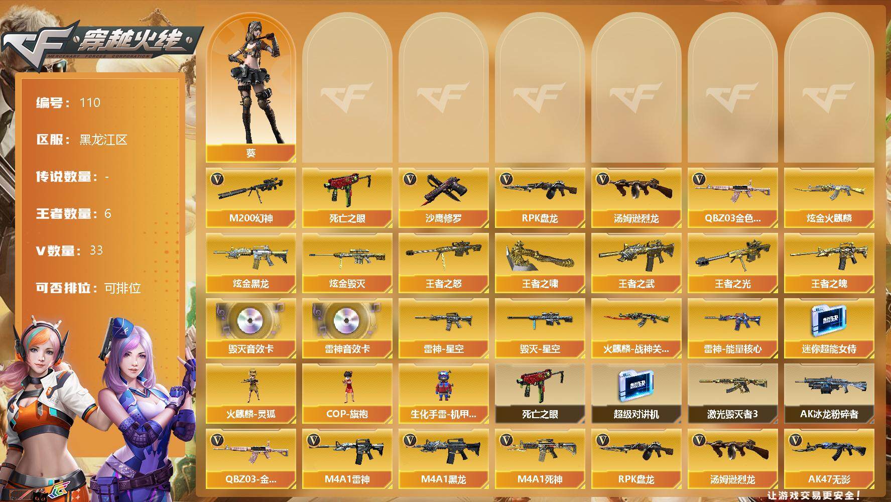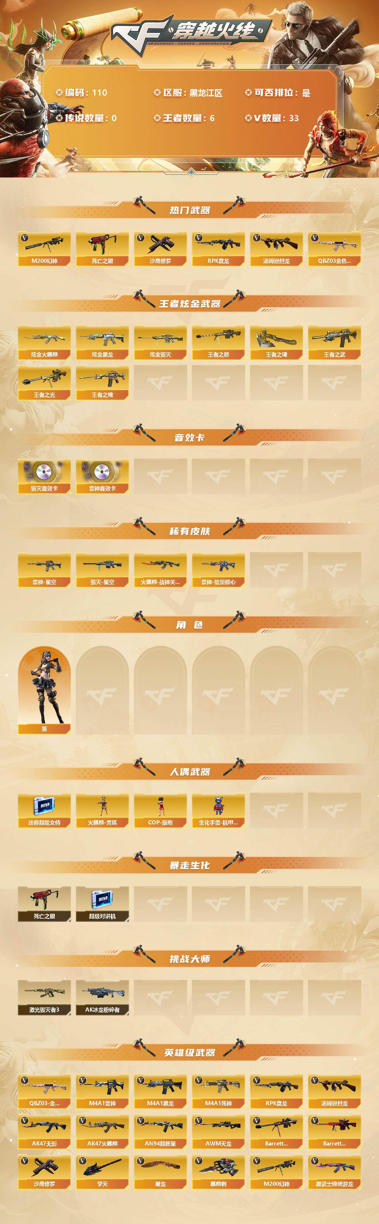 [12714158]黑龙江区-33V-6王者-5炫金 【热门武器】:QBZ03-金色蔷薇,M200-幻神,死亡之眼,汤姆逊-烈龙,RPK-盘龙,沙鹰-修罗 【王者炫金武器】:炫金火麒麟,炫金黑龙,炫金毁灭*3,王者之武,王者之光,王者之怒,王者之魄,王者之啸 【音效卡】:M4A1-雷神音效卡,Barrett-毁灭音效卡 【稀有皮肤】:雷神-能量核心,雷神-星空,火麒麟-战神关羽,毁灭-星空 【角色】:葵 【人偶武器】:火麒麟-灵狐,COP-旗袍,迷你超能女侍,生化手雷-机甲核心 【暴走生化】:死亡之眼,超级对讲机 【挑战大师】:激光毁灭者III,AK47-冰龙粉碎者 【英雄级武器】:QBZ03-金色蔷薇,M4A1-雷神*2,M4A1-黑龙,M4A1-死神*3,RPK-盘龙,汤姆逊-烈龙,AK47-无影,AK47-火麒麟,AN94-超新星,AWM-天龙*2,Barrett-毁灭*4,Barrett-极光,M200-幻神,黑武士-锦绣游龙,沙鹰-修罗,麒麟刺*3,擎天,屠龙*5 【特殊枪械】:1烈龙,1盘龙