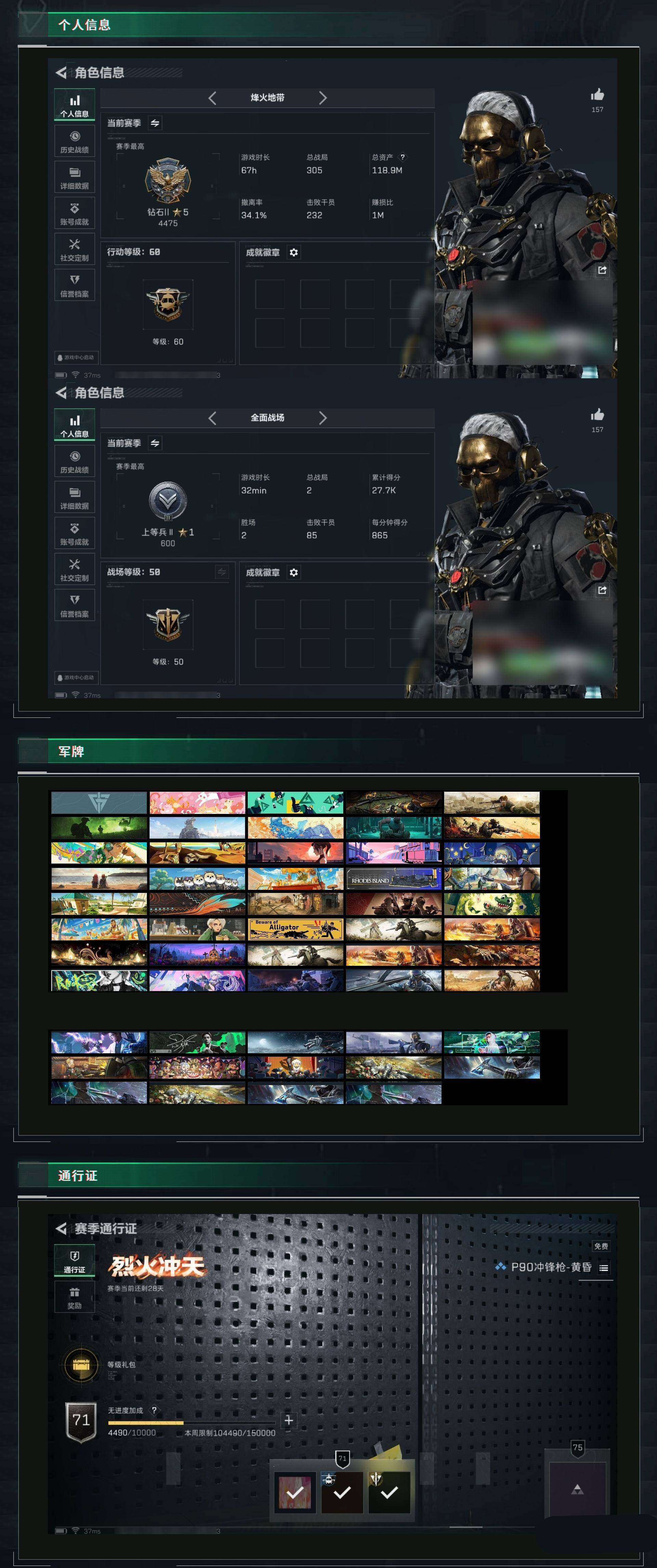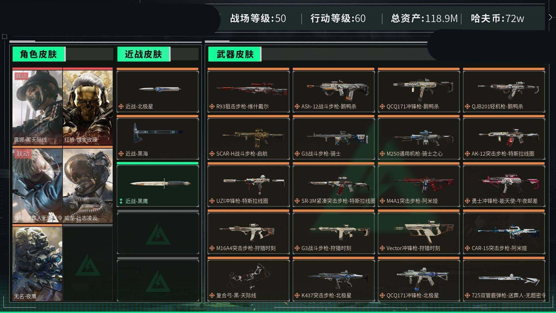 [12714243]汤21652 总资产118M,哈夫币72w,近战-北极星/近战-黑海,露娜-黑天际线/红狼-蚀金玫瑰/蜂医-送葬人无题密令/威龙-壮志凌云/无名-夜鹰,枪皮数量259,战场等级:50 上等兵,行动等级:60 钻石,安全箱等时效性道具请以游戏内数据为准;详情请看【个人信息】战场等级:50 上等兵,行动等级:60 钻石【哈夫币】72w【总资产】118M【货币】37三角币/0曼德尔币/16三角券【安全箱】基础安全箱2(1x2)/S6高级安全箱6(2x3)【通行证】三角洲全模式版【特勤处】制药台Lv.3/工作台Lv.3/仓库Lv.8/防具台Lv.3/训练中心Lv.7/靶场Lv.6/技术中心Lv.3/指挥中心Lv.5/潜水中心Lv.0/收藏室Lv.0【角色皮肤】露娜-黑天际线/红狼-蚀金玫瑰/威龙-壮志凌云/无名-夜鹰/蜂医-送葬人无题密令/【已拥有捆绑包】黑海捆绑包/北极星捆绑包/狩猎时刻捆绑包/特斯拉线圈捆绑包/【近战皮肤】近战-黑鹰/近战-黑海/近战-北极星/【步枪皮肤】M4A1突击步枪-蚀金玫瑰/QBZ95-1突击步枪-曙光/SCAR-H战斗步枪-铁艺苍穹/QBZ95-1突击步枪-ACE/AUG突击步枪-蝮蛇/G3战斗步枪-战场英杰/AUG突击步枪-特勤执行/M4A1突击步枪-特勤执行/PTR-32突击步枪-ACE/AK-12突击步枪-夜鹰/SG552突击步枪-深海恐惧/SG552突击步枪-尖端治疗/AS Val突击步枪-尖端治疗/ASh-12战斗步枪-守夜人/AKM突击步枪-林中猎手/PTR-32突击步枪-英雄/K437突击步枪-北极星/AS Val突击步枪-典狱官/腾龙突击步枪-无垢/SCAR-H战斗步枪-囚徒/M16A4突击步枪-竞赛选手/SR-3M紧凑突击步枪-荒野求生/CAR-15突击步枪-阿米娅/M4A1突击步枪-阿米娅/G3战斗步枪-狩猎时刻/M16A4突击步枪-狩猎时刻/AK-12突击步枪-特斯拉线圈/SR-3M紧凑突击步枪-特斯拉线圈/腾龙突击步枪-猎鳄行动/ASh-12战斗步枪-无极限/G3战斗步枪-骑士/ASh-12战斗步枪-鹅鸭杀/SCAR-H战斗步枪-启航/SR-3M紧凑突击步枪-战术竞备/【冲锋枪皮肤】Vector冲锋枪-狩猎时刻/UZI冲锋枪-特斯拉线圈/Vector冲锋枪-红色彗星/MP5冲锋枪-黑海/MP5冲锋枪-深海恐惧/勇士冲锋