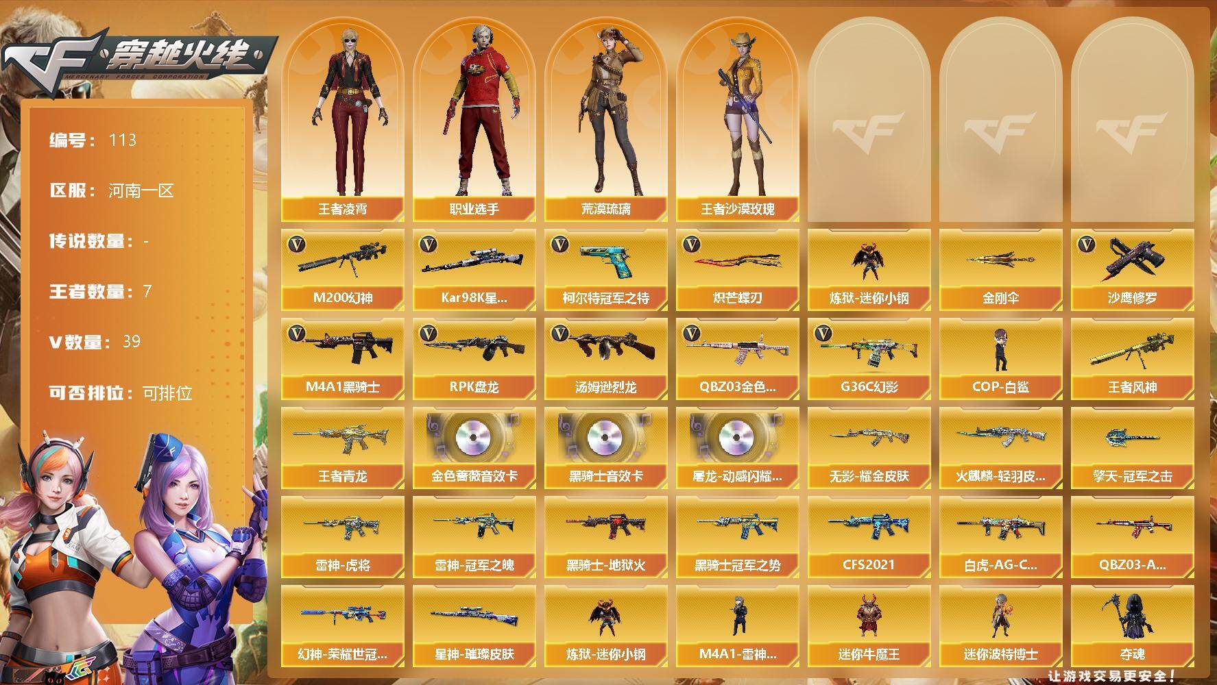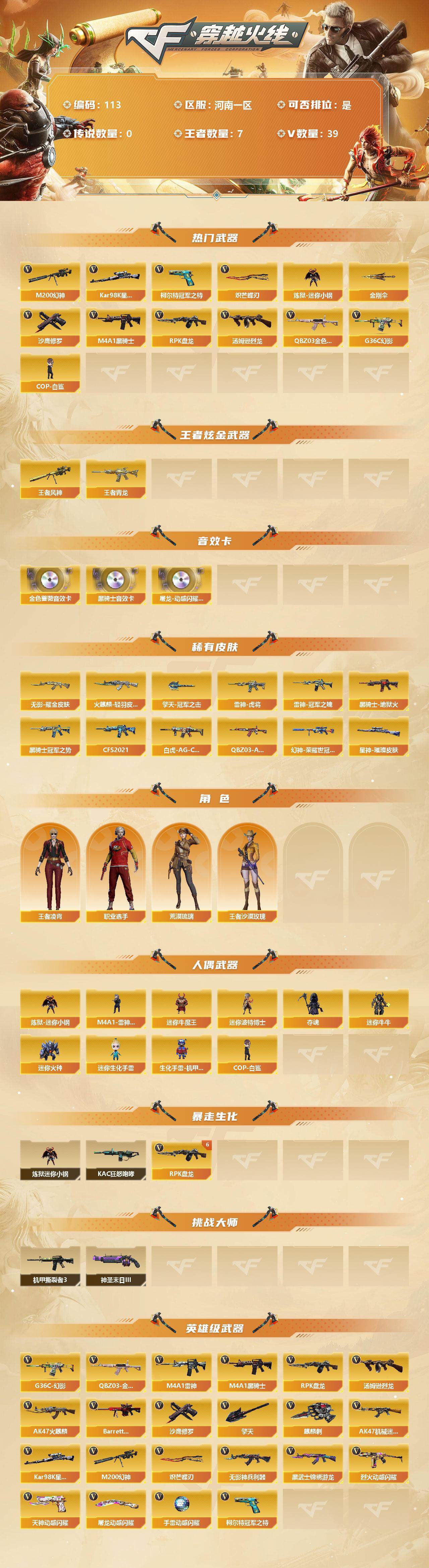 [12714321]河南一区-39V-7王者-0炫金 【热门武器】:G36C-幻影,QBZ03-金色蔷薇,M200-幻神,柯尔特-冠军之特,Kar98K-星神,炼狱-迷你小钢,M4A1-黑骑士,汤姆逊-烈龙*2,RPK-盘龙*6,COP-白鲨,沙鹰-修罗*3,炽芒蝶刃,金刚伞 【王者炫金武器】:王者青龙,王者风神 【音效卡】:屠龙-动感闪耀 音效卡,M4A1-黑骑士音效卡,QBZ03-金色蔷薇音效卡 【稀有皮肤】:M200-幻神-荣耀世冠白鲨,星神-璀璨皮肤,白虎-AG-CFPLS20冠军,QBZ03-AG-CFPLS19冠军,雷神-虎将*2,雷神-冠军之魄,火麒麟-轻羽皮肤,黑骑士-冠军之势,黑骑士-地狱火,黑骑士-CFS2021,无影耀金皮肤,擎天-冠军之击 【角色】:王者凌霄,王者沙漠玫瑰,荒漠琉璃,职业选手 【人偶武器】:COP-白鲨,M4A1-雷神-精英刀锋,炼狱-迷你小钢,迷你牛魔王,迷你波特博士,夺魂,迷你牛牛,迷你火种,迷你生化手雷,生化手雷-机甲核心 【暴走生化】:炼狱-迷你小钢,KAC-狂怒咆哮 【挑战大师】:机甲撕裂者III,神圣爆裂者-末日III*2 【英雄级武器】:烈火-动感闪耀,天神-动感闪耀,屠龙-动感闪耀,手雷-动感闪耀,G36C-幻影,QBZ03-金色蔷薇,无影-神兵利器,M4A1-雷神,M4A1-黑骑士,RPK-盘龙*6,汤姆逊-烈龙*2,AK47-火麒麟,Barrett-极光,AK47-机械迷城,Kar98K-星神,M200-幻神,黑武士-锦绣游龙,柯尔特-冠军之特,沙鹰-修罗*3,炽芒蝶刃,麒麟刺*2,擎天 【特殊枪械】:1黑骑士,2烈龙,6盘龙