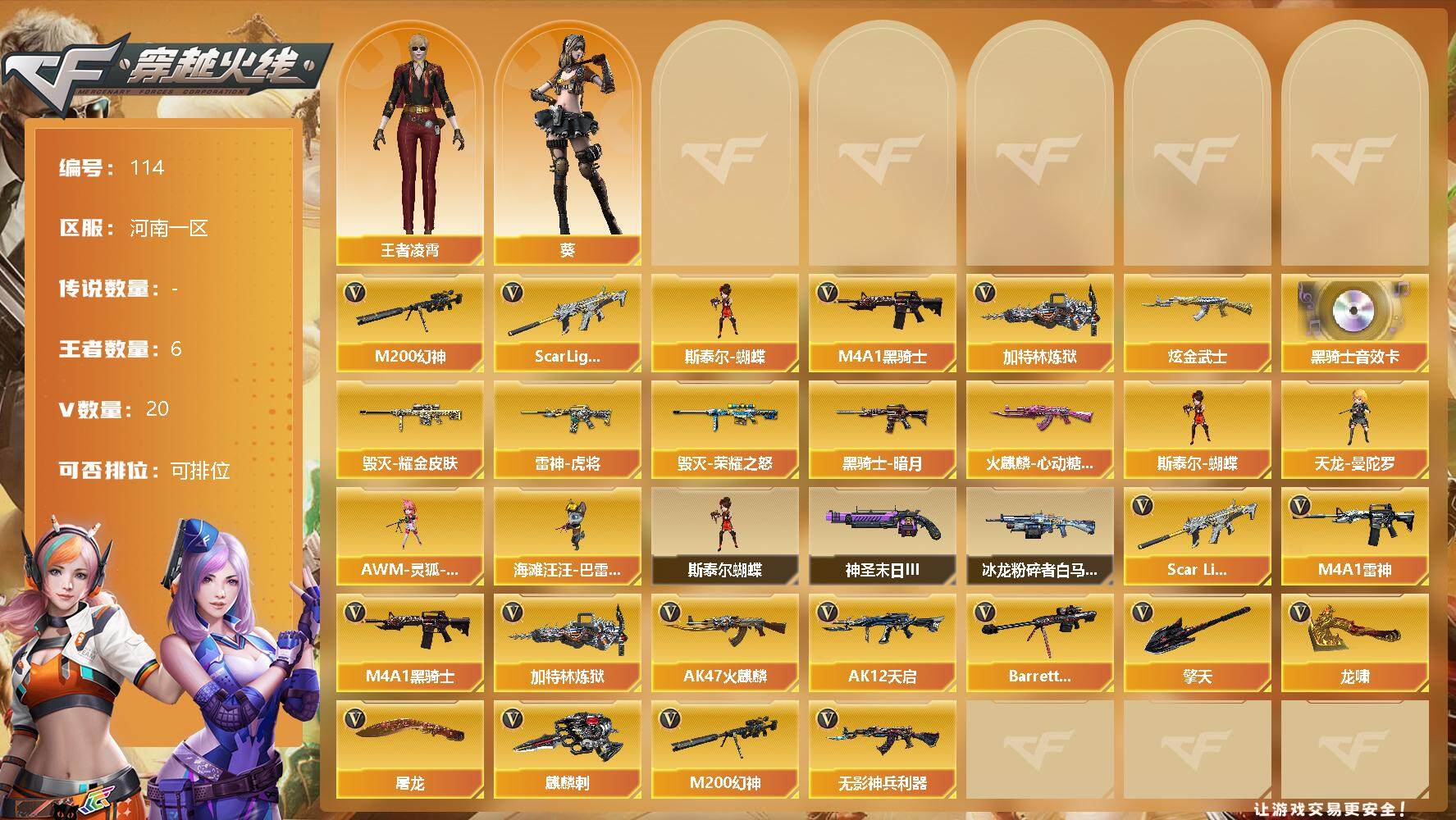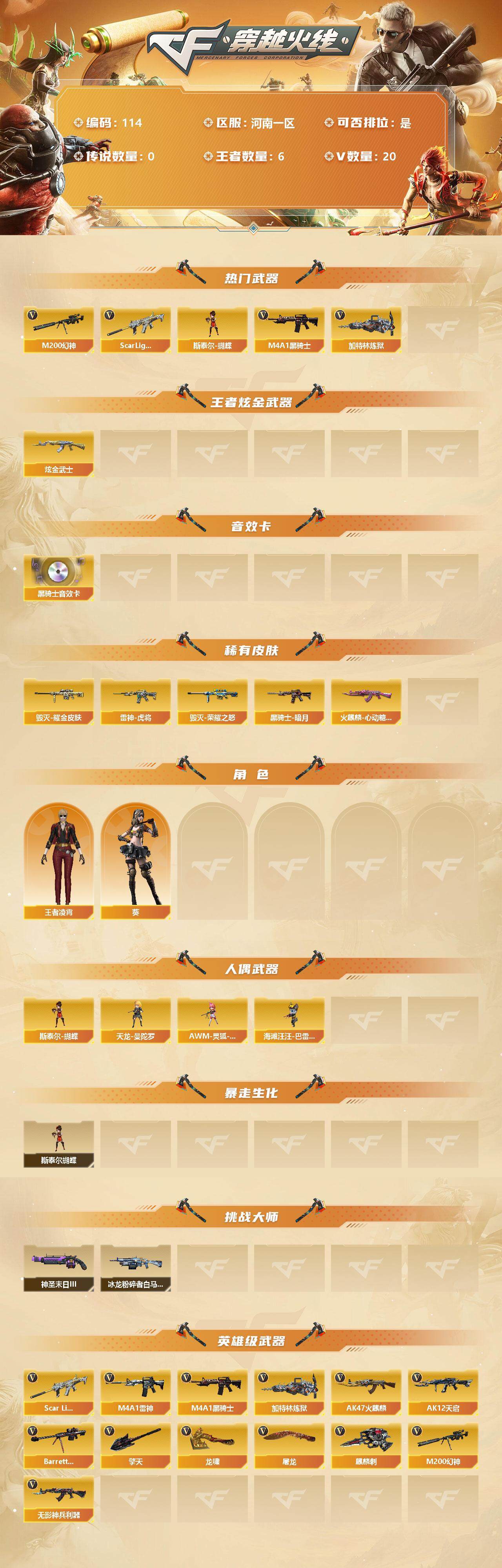 [12714373]河南一区-20V-6王者-1炫金 【热门武器】:Scar Light-白虎,M200-幻神,M4A1-黑骑士,加特林-炼狱,斯泰尔-蝴蝶 【王者炫金武器】:炫金武士 【音效卡】:M4A1-黑骑士音效卡 【稀有皮肤】:雷神-虎将,火麒麟-心动糖果,黑骑士-暗月,毁灭-荣耀之怒,毁灭耀金皮肤 【角色】:王者凌霄,葵 【人偶武器】:斯泰尔-蝴蝶,天龙-曼陀罗,AWM-灵狐-15周年嘉年华,海滩汪汪-巴雷特 【暴走生化】:斯泰尔-蝴蝶 【挑战大师】:神圣爆裂者-末日III,冰龙粉碎者-白马银枪 【英雄级武器】:Scar Light-白虎,无影-神兵利器,M4A1-雷神*4,M4A1-黑骑士,加特林-炼狱,AK47-火麒麟,AK12-天启,Barrett-毁灭,M200-幻神,麒麟刺,擎天,龙啸,屠龙 【特殊枪械】:蝴蝶斯泰尔+0烈龙,1白虎,1黑骑士,1炼狱,1蝴蝶斯泰尔