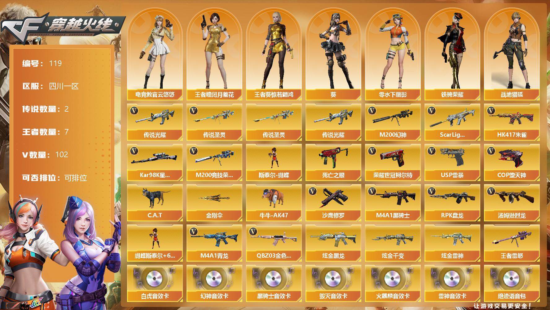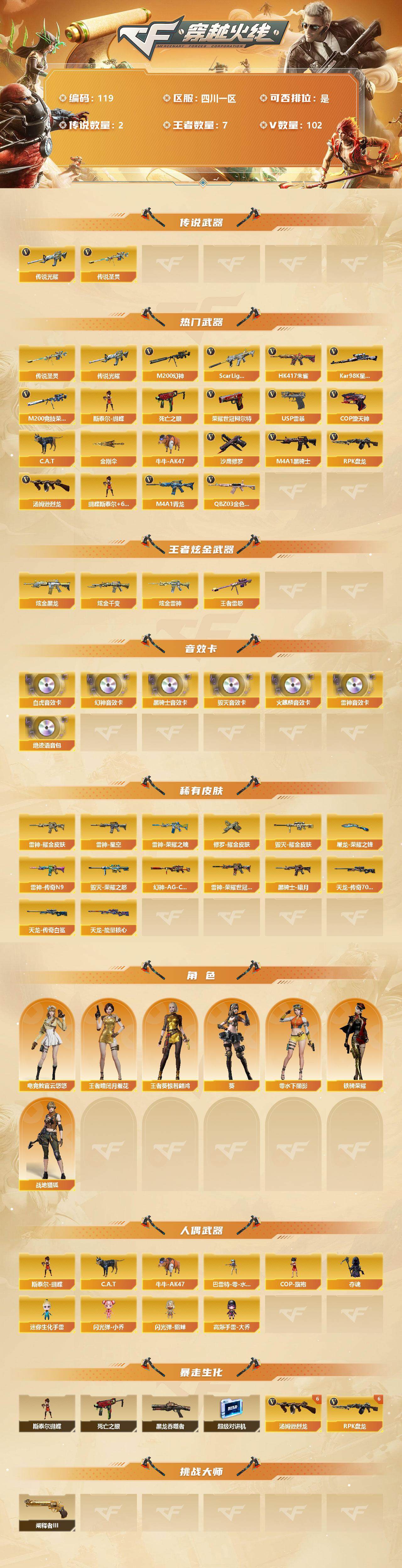 [12714689]四川一区-102V-7王者-3炫金 【传说武器】:传说光耀,传说圣灵 【热门武器】:传说光耀,传说圣灵,QBZ03-金色蔷薇,Scar Light-白虎,HK417-朱雀,M4A1-青龙,M200-幻神,M200-竞技荣光,死亡之眼*2,荣耀世冠-柯尔特*2,Kar98K-星神,C.A.T,牛牛-AK47,M4A1-黑骑士,汤姆逊-烈龙*6,RPK-盘龙*6,斯泰尔-蝴蝶,USP-雷暴*2,COP-堕天神,沙鹰-修罗*4,金刚伞 【王者炫金武器】:炫金黑龙,炫金千变,炫金雷神,王者雷怒 【音效卡】:M200-幻神音效卡,AK47-火麒麟音效卡*2,M4A1-雷神音效卡,M4A1-黑骑士音效卡,Barrett-毁灭音效卡,Scar Light-白虎音效卡,绝迹语音包 【稀有皮肤】:幻神-AG-CFPLS17冠军,雷神-荣耀之魄,雷神-星空,雷神-耀金皮肤,雷神-传奇N9,雷神-荣耀世冠AG,黑骑士-暗月,毁灭-荣耀之怒,毁灭耀金皮肤,天龙-能量核心,AWM-天龙-传奇70KG*2,AWM-天龙-传奇白鲨,修罗耀金皮肤,屠龙-荣耀之锋 【角色】:王者-瞳-闭月羞花,王者葵-惊若翩鸿,零-水下丽影,葵,电竞教官-云悠悠,战地猎狐,铁骑荣耀 【人偶武器】:斯泰尔-蝴蝶,巴雷特-零-水下丽影*2,COP-旗袍,C.A.T,牛牛-AK47,夺魂*2,迷你生化手雷,闪光弹-小乔,闪光弹-貂蝉,高爆手雷-大乔 【暴走生化】:斯泰尔-蝴蝶,死亡之眼*2,黑龙吞噬者,超级对讲机 【挑战大师】:阐释者III 【英雄级武器】:M200-竞技荣光,柯尔特-竞技荣光,擎天-竞技荣光,高爆手雷-竞技荣光,烟雾弹-竞技荣光,闪光弹-竞技荣光,COP-堕天神,麒麟刺-堕天神*3,龙啸-堕天神*3,USP-雷暴*2,斩神刀-雷暴,M4A1-武圣,荣耀世冠-柯尔特*2,QBZ03-金色蔷薇,Scar Light-白虎,HK417-朱雀,M4A1-青龙,M4A1-雷神*2,M4A1-黑骑士,RPK-盘龙*6,汤姆逊-烈龙*6,AK47-无影,AK47-火麒麟*2,AK47-黑武士,AK12-天启,AWM-天龙,Barrett-毁灭*2,AWM-裁决,Kar98K-星神,M200-幻神,AK-47-猩红传说*2,AK47-B-常胜将军,AWM-昌龙,M4A1-赤狱骑士,沙鹰-天神,沙鹰-修罗*4,麒麟刺*