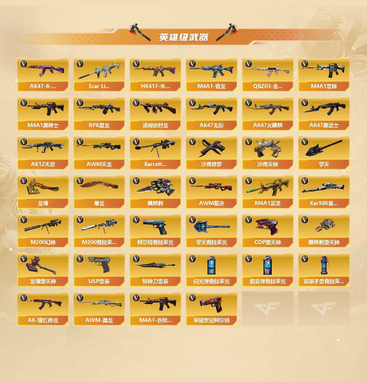 【英雄级武器】:M200-竞技荣光,柯尔特-竞技荣光,擎天-竞技荣光,高爆手雷-竞技荣光,烟雾弹-竞技荣光,闪光弹-竞技荣光,COP-堕天神,麒麟刺-堕天神*3,龙啸-堕天神*3,USP-雷暴*2,斩神刀-雷暴,M4A1-武圣,荣耀世冠-柯尔特*2,QBZ03-金色蔷薇,Scar Light-白虎,HK417-朱雀,M4A1-青龙,M4A1-雷神*2,M4A1-黑骑士,RPK-盘龙*6,汤姆逊-烈龙*6,AK47-无影,AK47-火麒麟*2,AK47-黑武士,AK12-天启,AWM-天龙,Barrett-毁灭*2,AWM-裁决,Kar98K-星神,M200-幻神,AK-47-猩红传说*2,AK47-B-常胜将军,AWM-昌龙,M4A1-赤狱骑士,沙鹰-天神,沙鹰-修罗*4,麒麟刺*