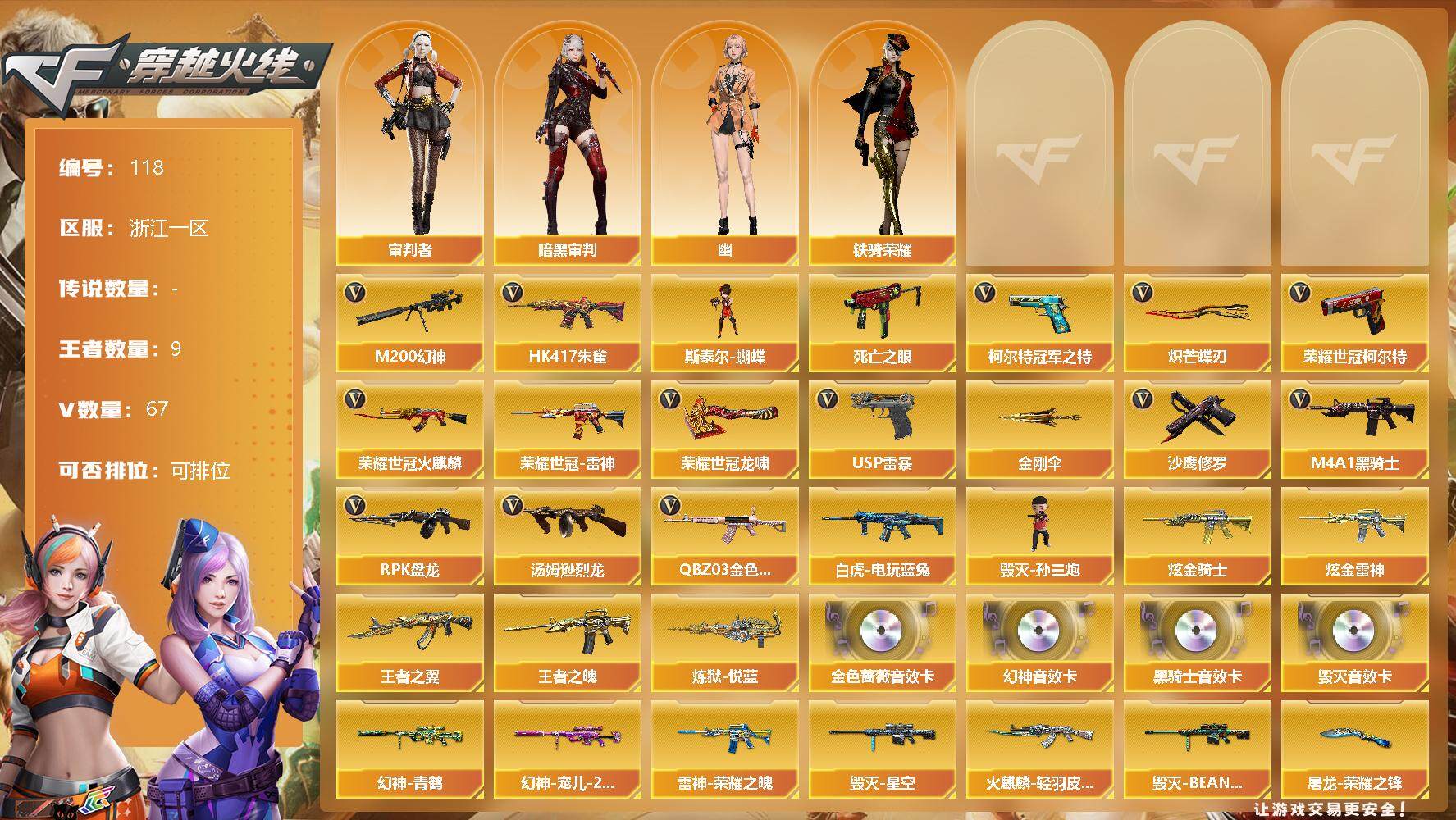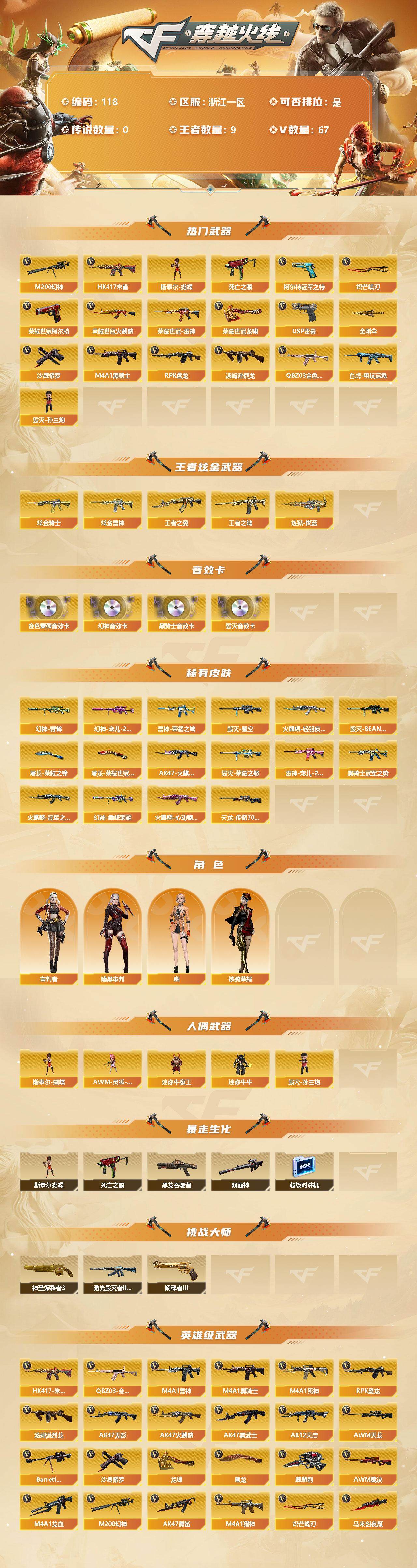 [12714573]浙江一区-67V-9王者-2炫金 【热门武器】:QBZ03-金色蔷薇,HK417-朱雀,M200-幻神,死亡之眼,荣耀世冠-火麒麟,荣耀世冠-雷神,白虎-电玩蓝兔,柯尔特-冠军之特,荣耀世冠-柯尔特*2,M4A1-黑骑士,汤姆逊-烈龙*2,RPK-盘龙,斯泰尔-蝴蝶,毁灭-孙三炮,USP-雷暴,沙鹰-修罗*3,炽芒蝶刃,荣耀世冠-龙啸,金刚伞 【王者炫金武器】:炫金骑士,炫金雷神,炼狱-悦蓝,王者之翼,王者之魄 【音效卡】:M200-幻神音效卡,M4A1-黑骑士音效卡,Barrett-毁灭音效卡,QBZ03-金色蔷薇音效卡 【稀有皮肤】:幻神-青鹤,幻神-宠儿-2021MVP,幻神-巅峰荣耀,雷神-荣耀之魄,雷神-宠儿-2019MVP,火麒麟-冠军之心,AK47-火麒麟-传奇EVEN,火麒麟-轻羽皮肤,火麒麟-心动糖果,黑骑士-冠军之势,毁灭-荣耀之怒,毁灭-星空,毁灭-BEAN-2020MVP,AWM-天龙-传奇70KG,屠龙-荣耀之锋,屠龙-荣耀世冠AG 【角色】:审判者,幽,铁骑荣耀,暗黑审判 【人偶武器】:毁灭-孙三炮,斯泰尔-蝴蝶,AWM-灵狐-15周年嘉年华,迷你牛魔王,迷你牛牛 【暴走生化】:斯泰尔-蝴蝶,死亡之眼,黑龙吞噬者,双面神,超级对讲机 【挑战大师】:神圣爆裂者III,阐释者III,激光毁灭者III-白马银枪 【英雄级武器】:马来剑-夜魔,USP-雷暴,斩神刀-雷暴,荣耀世冠-火麒麟,荣耀世冠-雷神,荣耀世冠-柯尔特*2,荣耀世冠-龙啸,烈火-动感闪耀,天神-动感闪耀,屠龙-动感闪耀,手雷-动感闪耀,QBZ03-金色蔷薇,HK417-朱雀,白虎-电玩蓝兔,无影-神兵利器,M4A1-雷神,M4A1-黑骑士,M4A1-死神,RPK-盘龙,汤姆逊-烈龙*2,AK47-无影,AK47-火麒麟*2,AK47-黑武士,AK12-天启,AWM-天龙,Barrett-毁灭,AWM-裁决,M4A1-龙血,M200-幻神,AK47-黑鲨,M4A1-猎神,黑武士-锦绣游龙,黑骑士-海王,柯尔特-冠军之特,沙鹰-修罗*3,炽芒蝶刃,麒麟刺,龙啸*2,屠龙*3,屠龙-云海游龙 【特殊枪械】:蝴蝶斯泰尔+2烈龙,1黑骑士,2烈龙,1盘龙,1蝴蝶斯泰尔