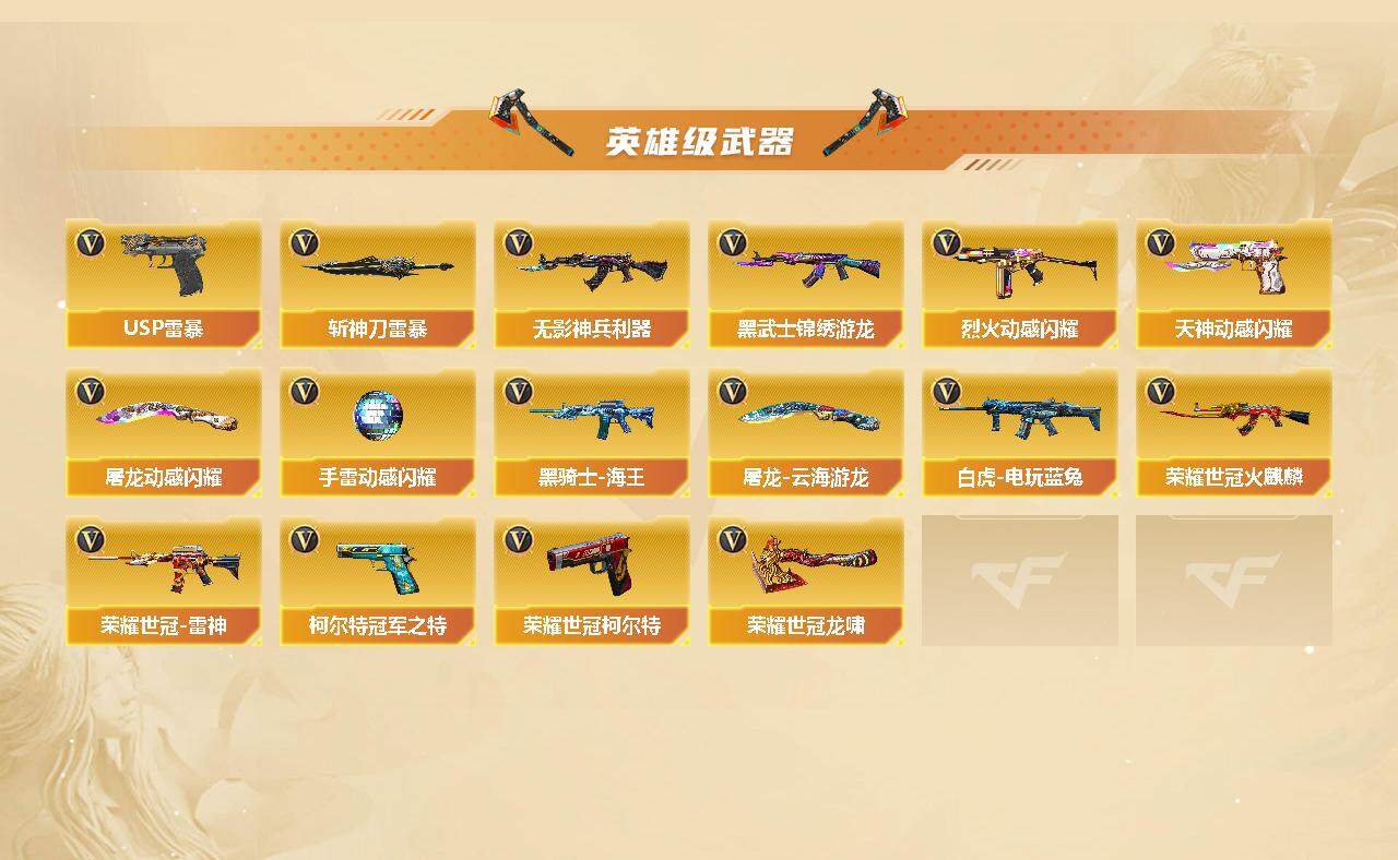 【英雄级武器】:马来剑-夜魔,USP-雷暴,斩神刀-雷暴,荣耀世冠-火麒麟,荣耀世冠-雷神,荣耀世冠-柯尔特*2,荣耀世冠-龙啸,烈火-动感闪耀,天神-动感闪耀,屠龙-动感闪耀,手雷-动感闪耀,QBZ03-金色蔷薇,HK417-朱雀,白虎-电玩蓝兔,无影-神兵利器,M4A1-雷神,M4A1-黑骑士,M4A1-死神,RPK-盘龙,汤姆逊-烈龙*2,AK47-无影,AK47-火麒麟*2,AK47-黑武士,AK12-天启,AWM-天龙,Barrett-毁灭,AWM-裁决,M4A1-龙血,M200-幻神,AK47-黑鲨,M4A1-猎神,黑武士-锦绣游龙,黑骑士-海王,柯尔特-冠军之特,沙鹰-修罗*3,炽芒蝶刃,麒麟刺,龙啸*2,屠龙*3,屠龙-云海游龙