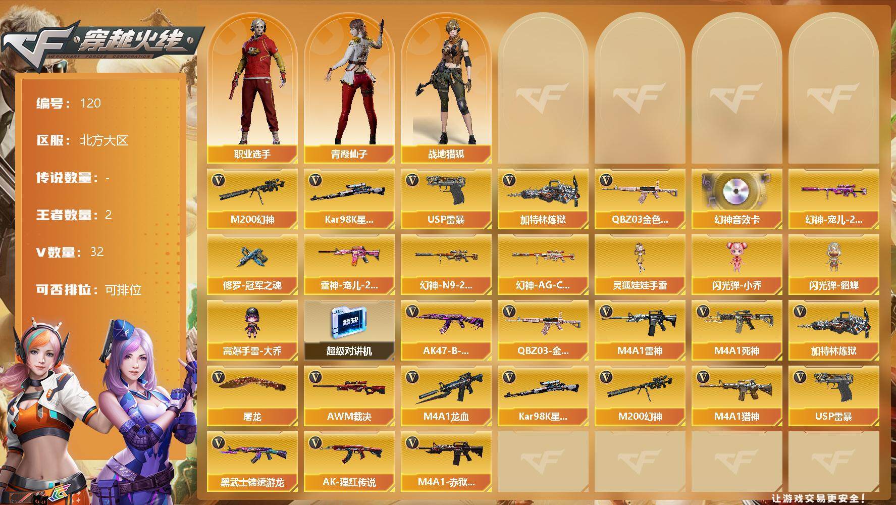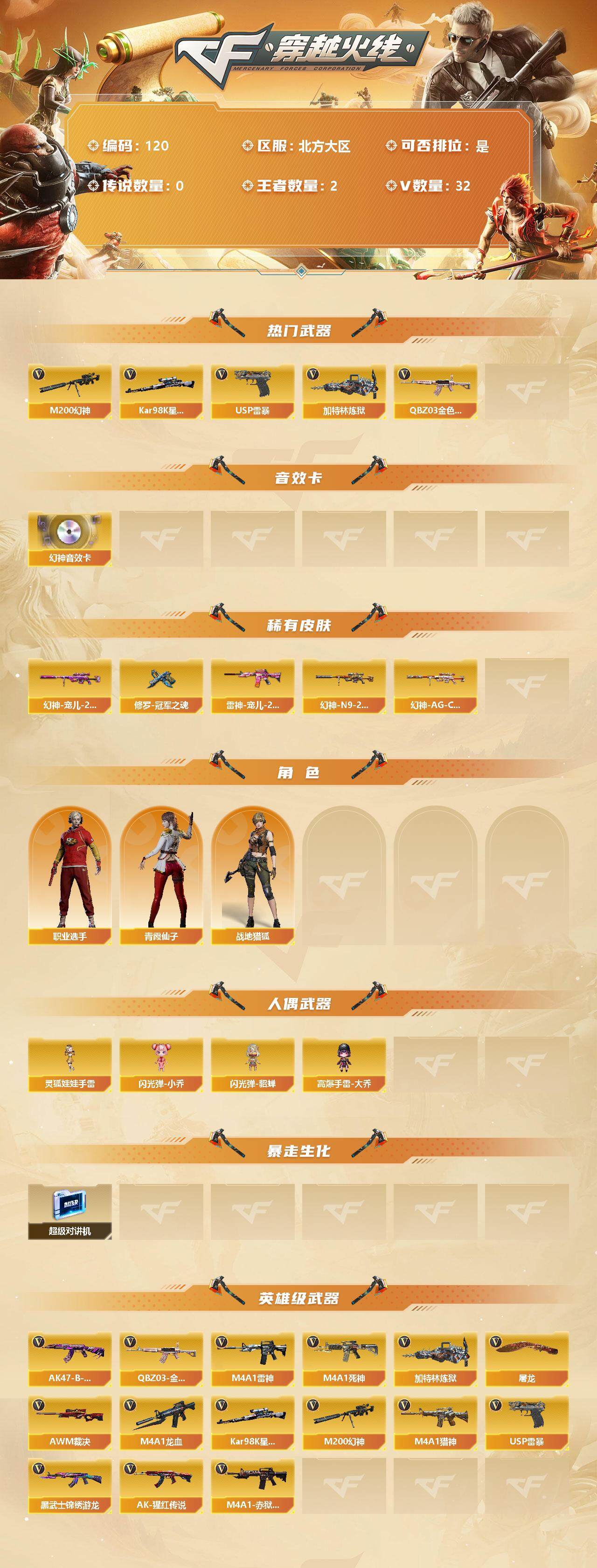 [12714774]北方大区-32V-2王者-0炫金 【热门武器】:QBZ03-金色蔷薇,M200-幻神,Kar98K-星神,加特林-炼狱,USP-雷暴 【音效卡】:M200-幻神音效卡 【稀有皮肤】:幻神-宠儿-2021MVP,M200-幻神-N9-2022MVP,幻神-AG-CFPL S24冠军 皮肤,雷神-宠儿-2019MVP,修罗-冠军之魂*2 【角色】:战地猎狐,职业选手,青霞仙子 【人偶武器】:灵狐娃娃手雷,闪光弹-小乔,闪光弹-貂蝉,高爆手雷-大乔 【暴走生化】:超级对讲机 【英雄级武器】:USP-雷暴,QBZ03-金色蔷薇,M4A1-雷神,M4A1-死神,加特林-炼狱,AWM-裁决,M4A1-龙血,Kar98K-星神,M200-幻神,M4A1-猎神,黑武士-锦绣游龙,AK-47-猩红传说,AK47-B-常胜将军,M4A1-赤狱骑士,屠龙 【特殊枪械】:1炼狱