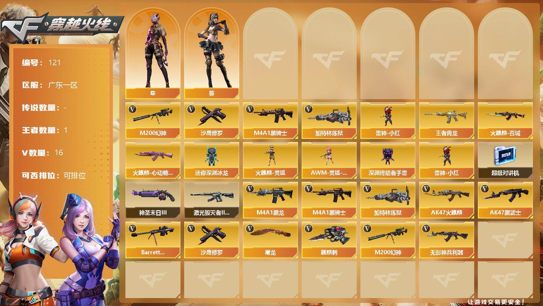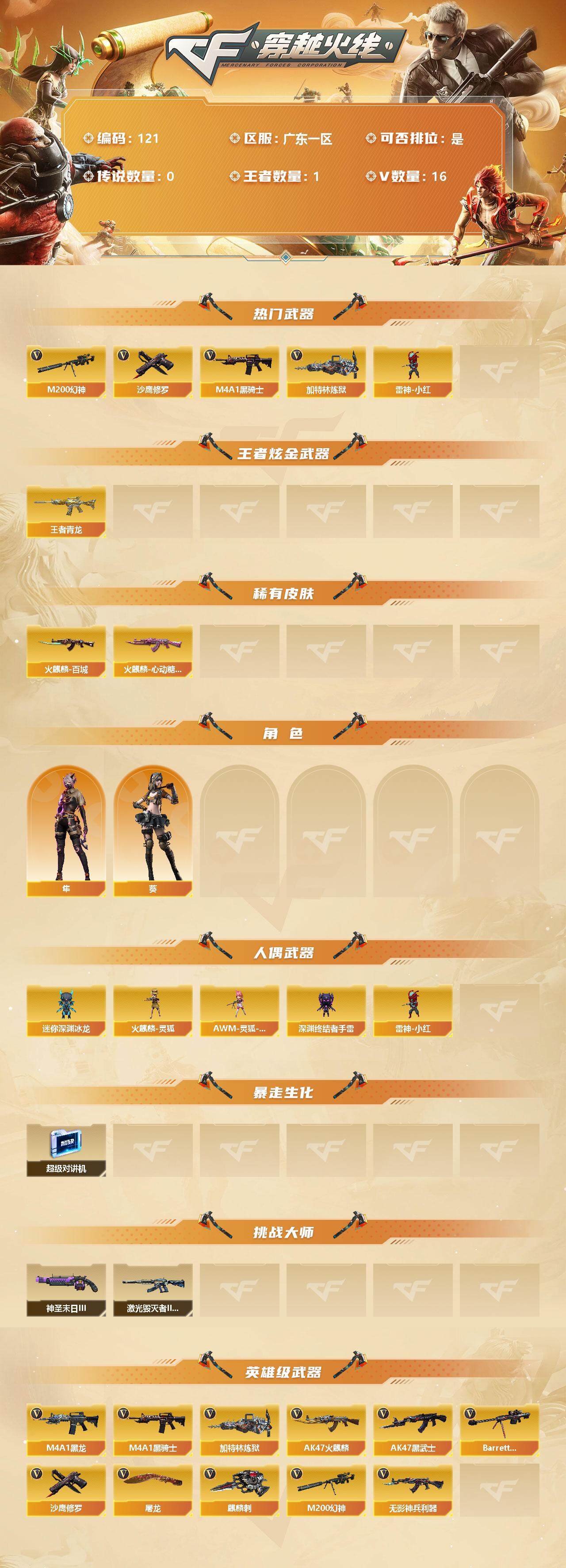 [12714926]广东一区-16V-1王者-0炫金 【热门武器】:M200-幻神,M4A1-黑骑士,加特林-炼狱,雷神-小红,沙鹰-修罗 【王者炫金武器】:王者青龙 【稀有皮肤】:火麒麟-百城,火麒麟-心动糖果 【角色】:葵,隼 【人偶武器】:雷神-小红,火麒麟-灵狐,AWM-灵狐-15周年嘉年华,迷你深渊冰龙*4,深渊终结者手雷 【暴走生化】:超级对讲机 【挑战大师】:神圣爆裂者-末日III,激光毁灭者III-白马银枪*2 【英雄级武器】:无影-神兵利器,M4A1-黑龙,M4A1-黑骑士,加特林-炼狱,AK47-火麒麟,AK47-黑武士,Barrett-毁灭,M200-幻神,沙鹰-修罗,麒麟刺,屠龙 【特殊枪械】:1黑骑士,1炼狱