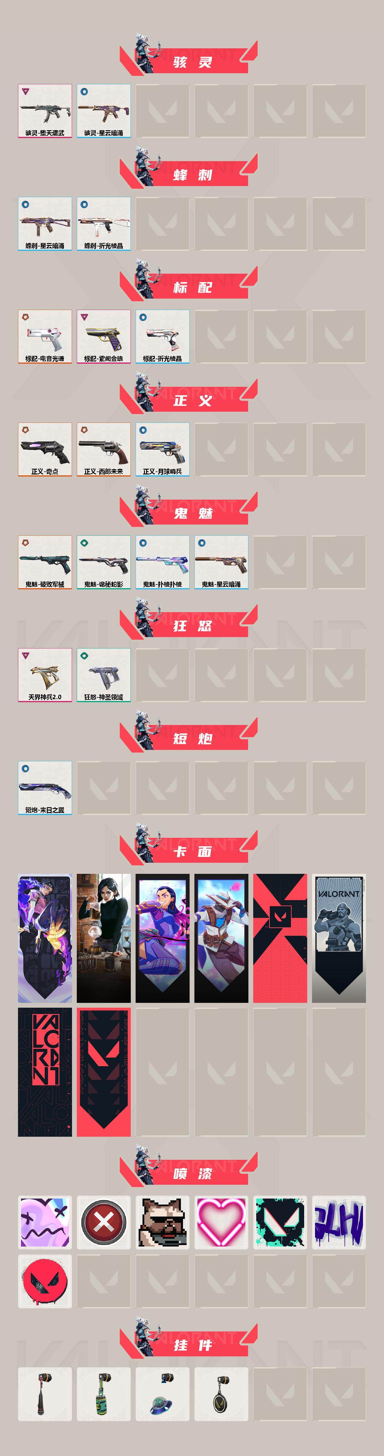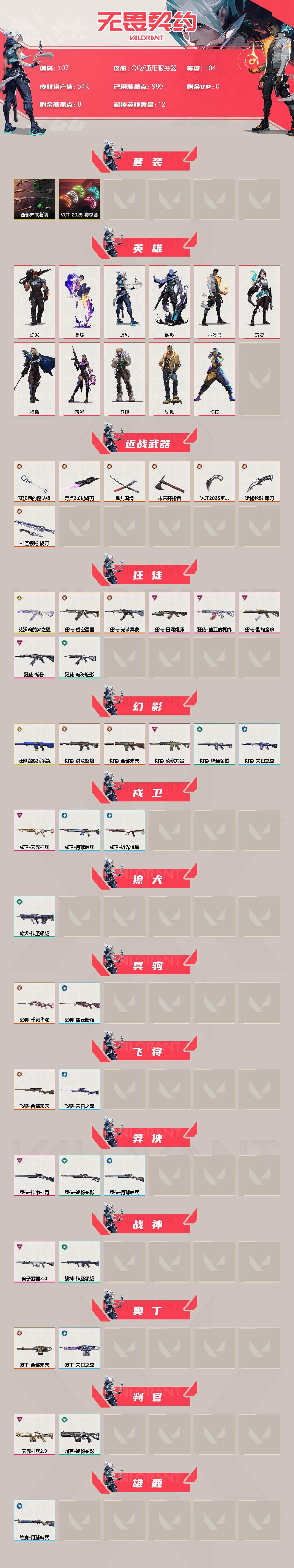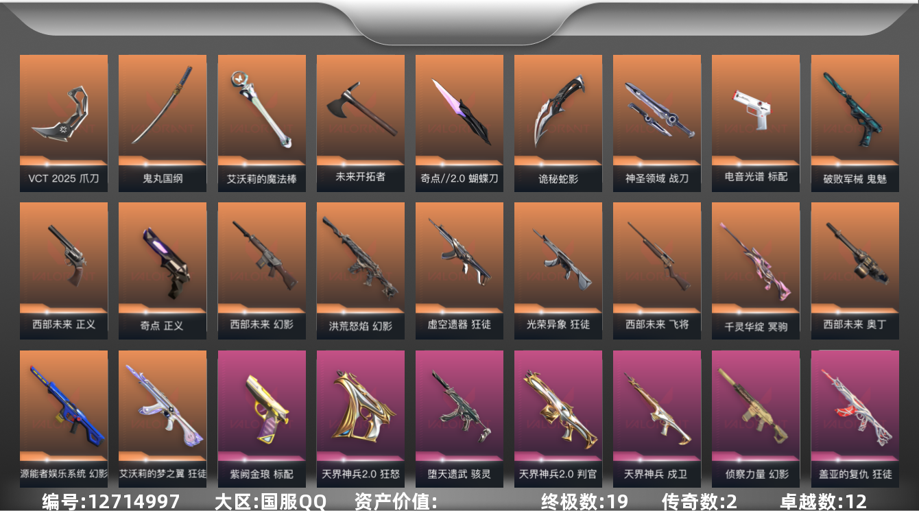[12714997]【套装】:VCT 2025 赛季套装,西部未来套装 【英雄】:幻棱,炼狱,暮蝶,钛狐,捷风,幽影,不死鸟,贤者,猎枭,芮娜,钢锁 【近战 武器】:近战武器-奇点//2.0 蝴蝶刀,近战武器-VCT 2025 爪刀,近战武器-艾沃莉的魔法棒,近战武器-鬼丸国纲,近战武器-未来开拓者,近战武器-诡秘蛇影 军刀,近战武器-神圣领域 战刀 【狂徒】:狂徒-艾沃莉的梦之翼,狂徒-虚空遗器,狂徒-光荣异象,狂徒-掠影,狂徒-盖亚的复仇,狂徒-日冕雄师,狂徒-紫阙金琅,狂徒-诡秘蛇影 【幻影】:幻影-源能者娱乐系统,幻影-洪荒怒焰,幻影-西部未来,幻影-侦察力量,幻影-神圣领域,幻影-末日之翼,幻影-西部未来 【戍卫】:戍卫-天界神兵,戍卫-月球哨兵,戍卫-折光棱晶 【獠犬】:獠犬-神圣领域 【冥驹】:冥驹-千灵华绽,冥驹-星云暗涌 【飞将】:飞将-西部未来,飞将-末日之翼 【莽侠】:莽侠-神中神罚,莽侠-诡秘蛇影,莽侠-月球哨兵 【战神】:战神-离子武器//2.0,战神-神圣领域 【奥丁】:奥丁-西部未来,奥丁-末日之翼 【判官】:判官-天界神兵//2.0,判官-诡秘蛇影 【雄鹿】:雄鹿-月球哨兵 【骇灵】:骇灵-堕天遗武,骇灵-星云暗涌 【蜂刺】:蜂刺-星云暗涌,蜂刺-折光棱晶 【标配】:标配-电音光谱,标配-紫阙金琅,标配-折光棱晶,标配-电音光谱 【正义】:正义-奇点,正义-西部未来,正义-月球哨兵 【鬼魅】:鬼魅-破败军械,鬼魅-诡秘蛇影,鬼魅-扑棱扑棱,鬼魅-星云暗涌 【狂怒】:狂怒-天界神兵//2.0,狂怒-神圣领域 【短炮】:短炮-末日之翼 【卡面】:无畏契约:暮蝶 卡面,虹吸式咖啡壶 卡面,无畏契约GO!第一卷:芮娜 卡面,无畏契约GO!第一卷:零 卡面,代号红色 卡面,新兵报到 卡面,V契约 卡面,无畏契约 卡面 【喷漆】:伤心心 喷漆,买装还是存钱 喷漆,关门放狗 喷漆,蕊形灯 喷漆,胜利属于无畏契约 喷漆,GLHF 喷漆,无畏契约 喷漆 【挂饰】:丢麦 挂饰,Z世代特饮 挂饰,天外飞客 挂饰,无畏契约 纪念币 挂饰