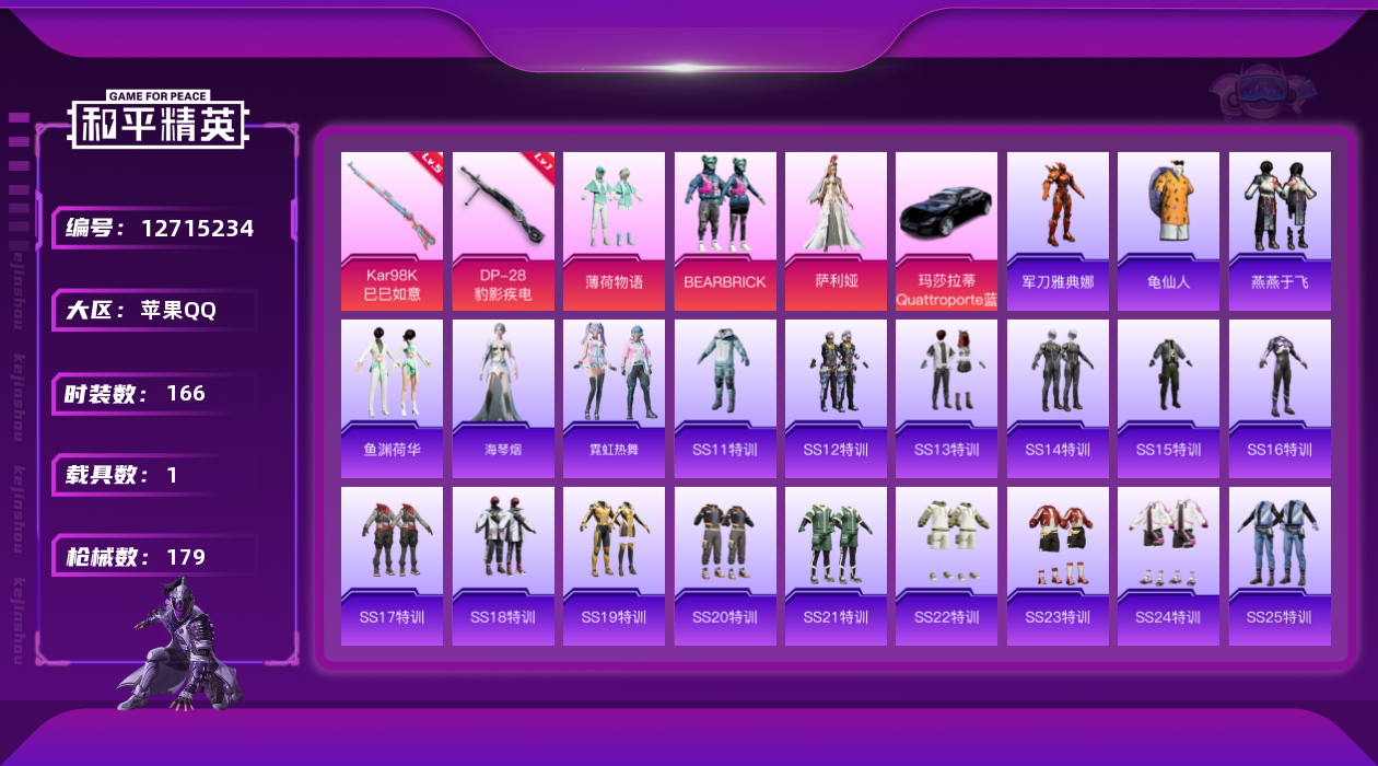 [12715234]苹果 手Q-3粉装-2特效枪-1载具-3粉色飞行器-5.9w热力值-18王牌印记-166套装-179枪皮【热门品类】:角色-军刀雅典娜,套装-龟仙人【粉色载具】:玛莎拉蒂Quattroporte(夜幕蓝)【粉色套装】:粉装-薄荷物语,粉装-BEARBRICK,角色-萨利娅【粉色枪皮等级】:Kar98K-巳巳如意(五级),DP-28-豹影疾电(一级)【粉色飞行器】:英伦信使飞行器,彩虹独角兽飞行器,墨金战记飞行器