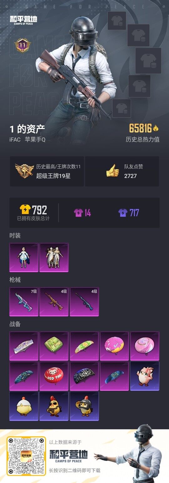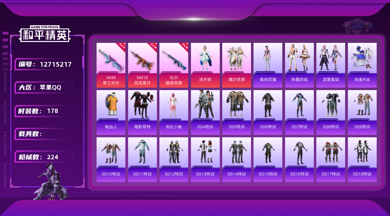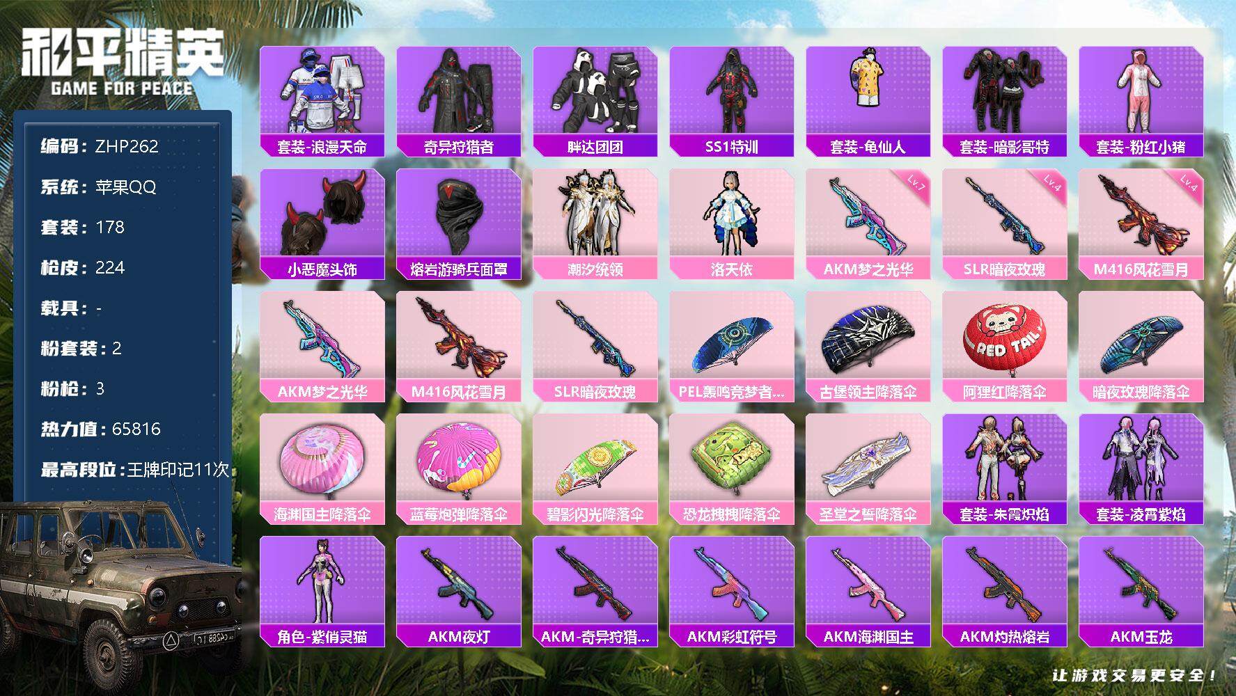 [12715217]苹果 手Q-2粉装-3特效枪-6.5w热力值-11王牌印记-178套装-224枪皮【热门品类】:套装-浪漫天命,套装-奇异狩猎者,套装-胖达团团,套装-SS1特训,套装-龟仙人,套装-暗影哥特,套装-粉红小猪,小恶魔头饰,熔岩游骑兵面罩【粉色套装】:粉装-潮汐统领,角色-洛天依【粉色枪皮等级】:AKM-梦之光华(七级),M416-风花雪月(四级),SLR-暗夜玫瑰(四级)