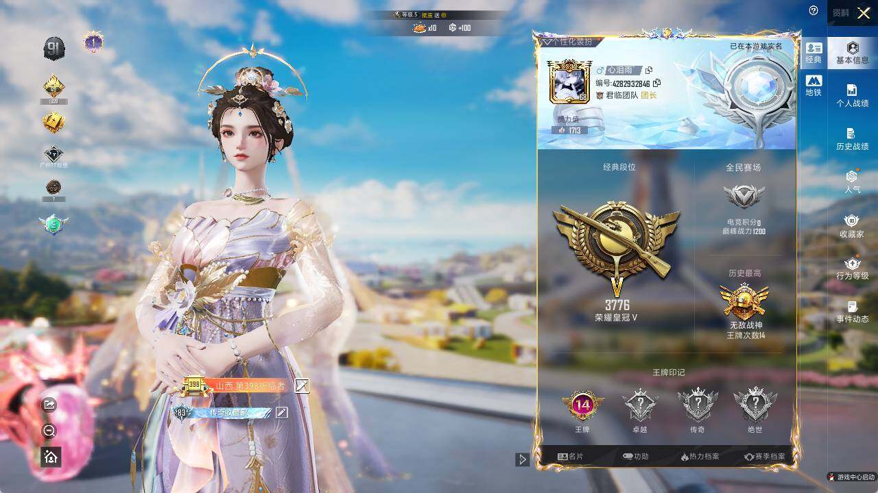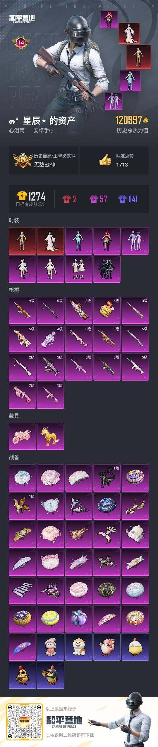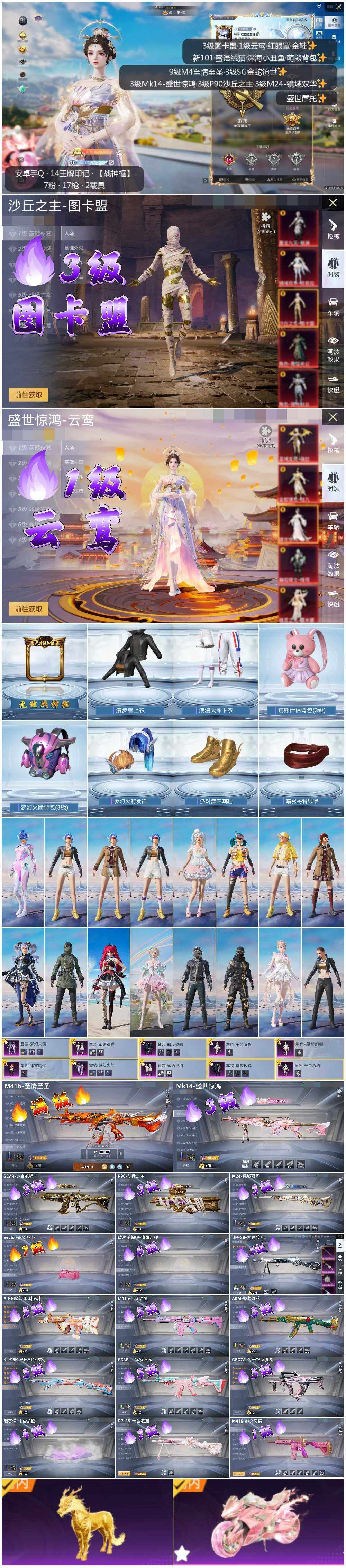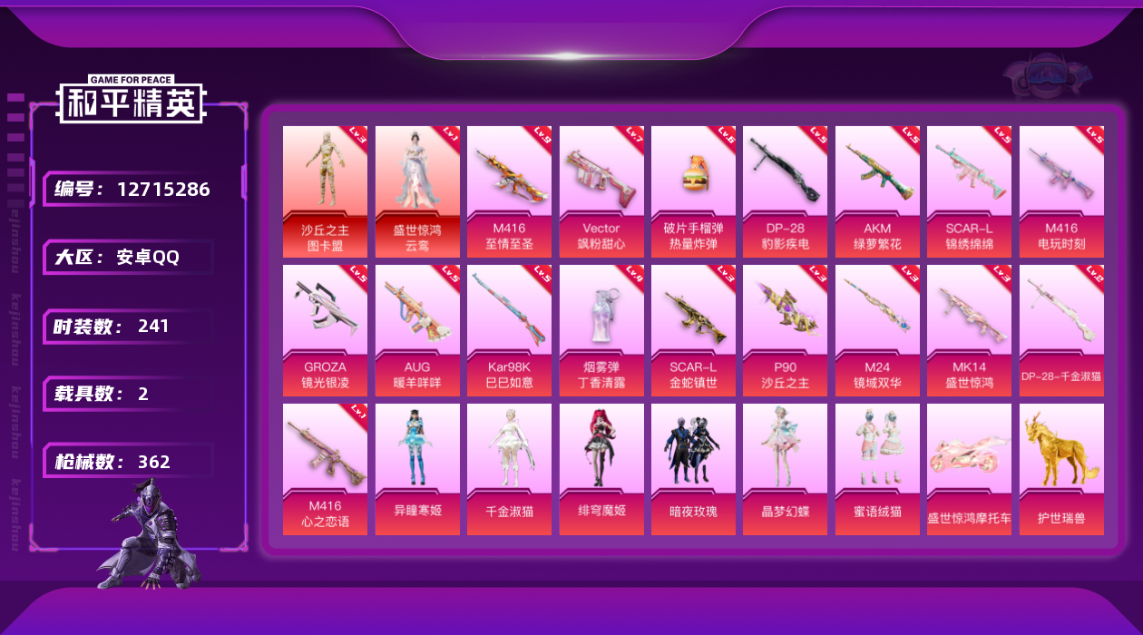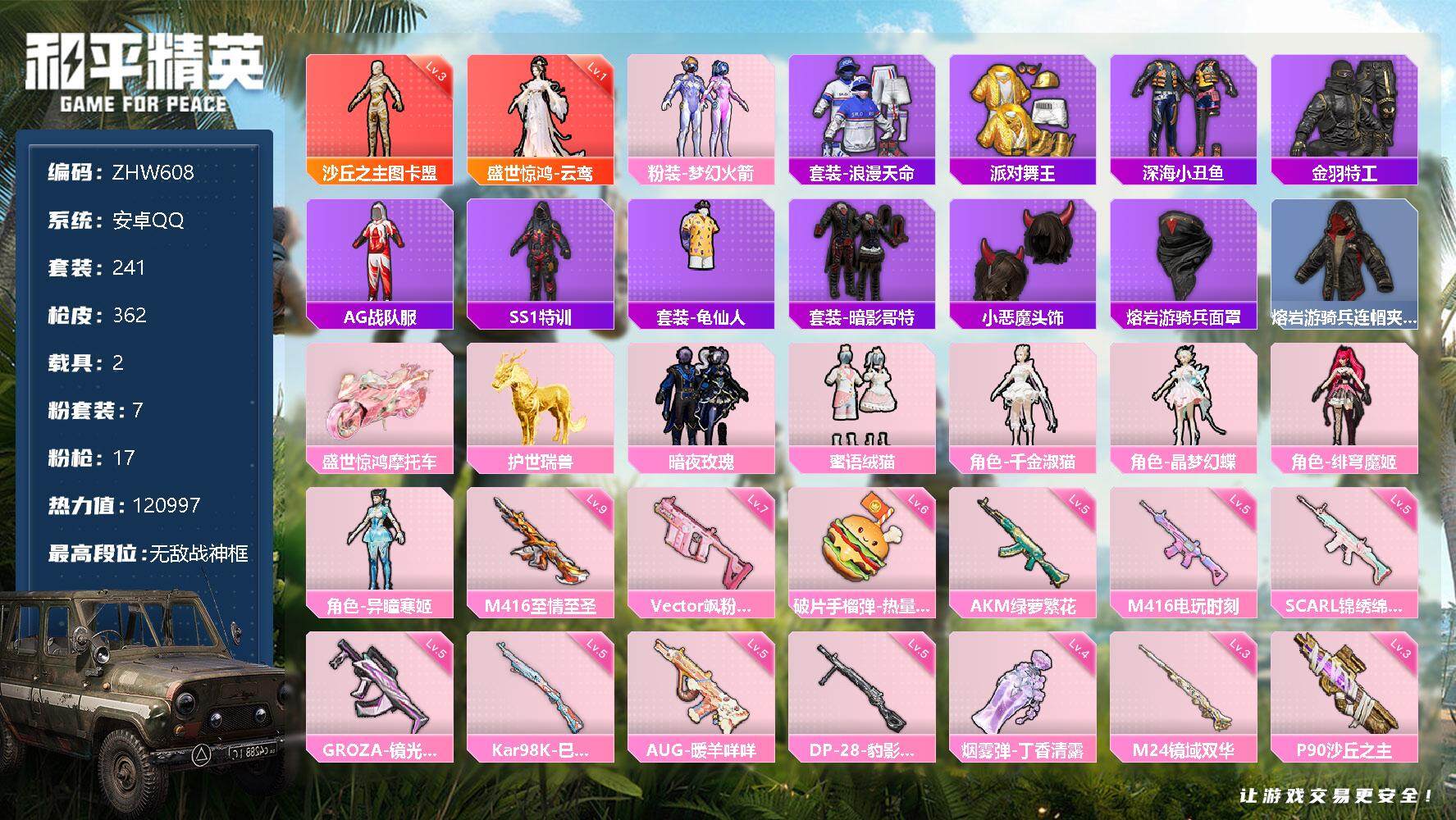 [12715286]素材身法号/无敌战神框1/地铁满天赋/M416-至情至圣(九级) 安卓 手Q-无敌战神框-2神装-7粉装-17特效枪-2载具-10粉色飞行器-12w热力值-14王牌印记-241套装-362枪皮【红色神装等级】:盛世惊鸿-云鸾(一级),沙丘之主-图卡盟(三级)【热门品类】:粉装-梦幻火箭,套装-浪漫天命,套装-派对舞王,套装-深海小丑鱼,套装-金羽特工,套装-AG战队服,套装-SS1特训,套装-龟仙人,套装-暗影哥特,小恶魔头饰,熔岩游骑兵面罩,熔岩游骑兵连帽夹克【粉色载具】:盛世惊鸿摩托车,护世瑞兽【粉色套装】:粉装-梦幻火箭,粉装-暗夜玫瑰,粉装-蜜语绒猫,角色-千金淑猫,角色-晶梦幻蝶,角色-绯穹魔姬,角色-异瞳寒姬【粉色枪皮等级】:AKM-绿萝繁花(五级),SCAR-L-锦绣绵绵(五级),SCAR-L-金蛇镇世(三级),M416-心之恋语(一级),M416-至情至圣(九级),M416-电玩时刻(五级),GROZA-镜光银凌(五级),AUG-暖羊咩咩(五级),Vector-飒粉甜心(七级),P90-沙丘之主(三级),Kar98K-巳巳如意(五级),M24-镜域双华(三级),Mk14-盛世惊鸿(三级),DP-28-千金淑猫(二级),DP-28-豹影疾电(五级),烟雾弹-丁香清露(四级),破片手榴弹-热量炸弹(六级)【粉色飞行器】:酣梦熊熊飞行器,沙丘之主天马,花傲天飞行器,镜域双华-灵镜之阶,鎏金朋克飞行器,龙翔九天飞行器,凤舞九天飞行器,万象金身飞行器,晶梦幻蝶飞行器