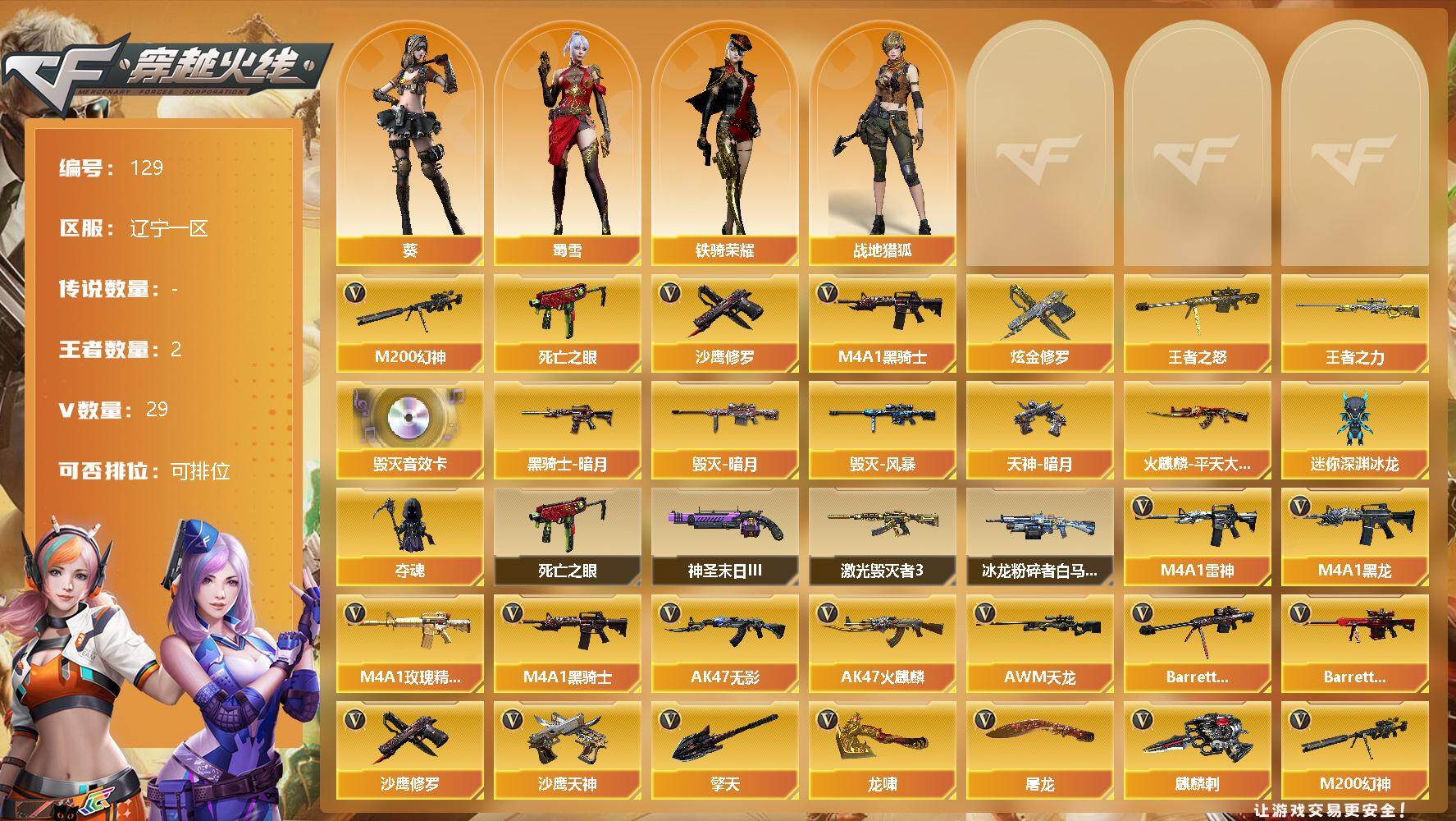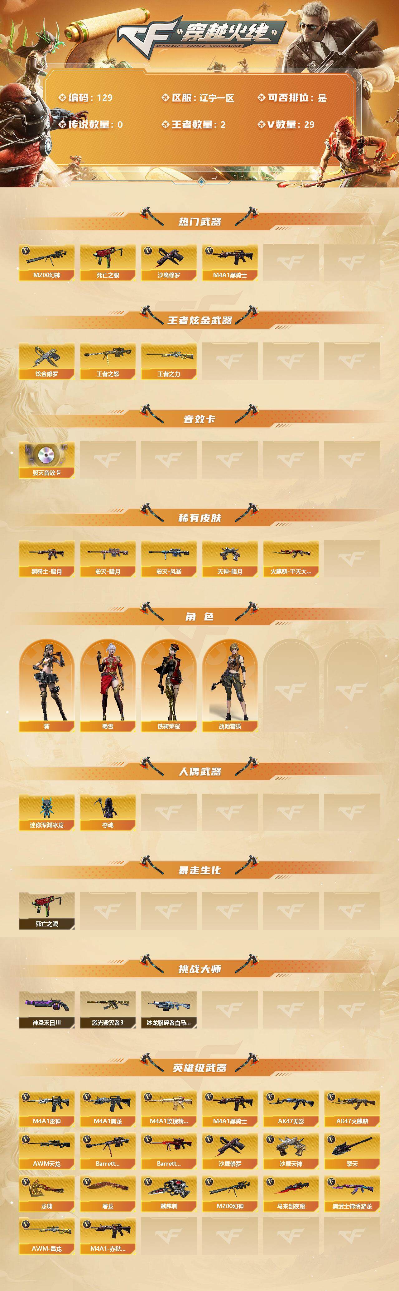 [12715337]辽宁一区-29V-2王者-1炫金 【热门武器】:M200-幻神,死亡之眼,M4A1-黑骑士,沙鹰-修罗*3 【王者炫金武器】:炫金修罗,王者之怒,王者之力 【音效卡】:Barrett-毁灭音效卡 【稀有皮肤】:火麒麟-平天大圣,黑骑士-暗月,毁灭-暗月*2,毁灭-风暴,天神-暗月 【角色】:葵,战地猎狐,蜀雪,铁骑荣耀 【人偶武器】:迷你深渊冰龙,夺魂 【暴走生化】:死亡之眼 【挑战大师】:神圣爆裂者-末日III,激光毁灭者III,冰龙粉碎者-白马银枪 【英雄级武器】:马来剑-夜魔,M4A1-雷神,M4A1-黑龙,M4A1-玫瑰精灵,M4A1-黑骑士,AK47-无影,AK47-火麒麟,AWM-天龙,Barrett-毁灭,Barrett-极光,M200-幻神,黑武士-锦绣游龙,AWM-昌龙,M4A1-赤狱骑士,沙鹰-天神,沙鹰-修罗*3,麒麟刺,擎天,龙啸,屠龙*2 【特殊枪械】:1黑骑士