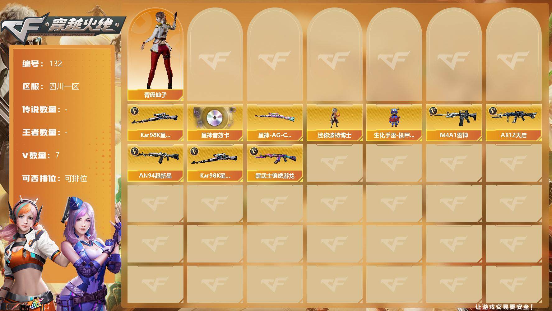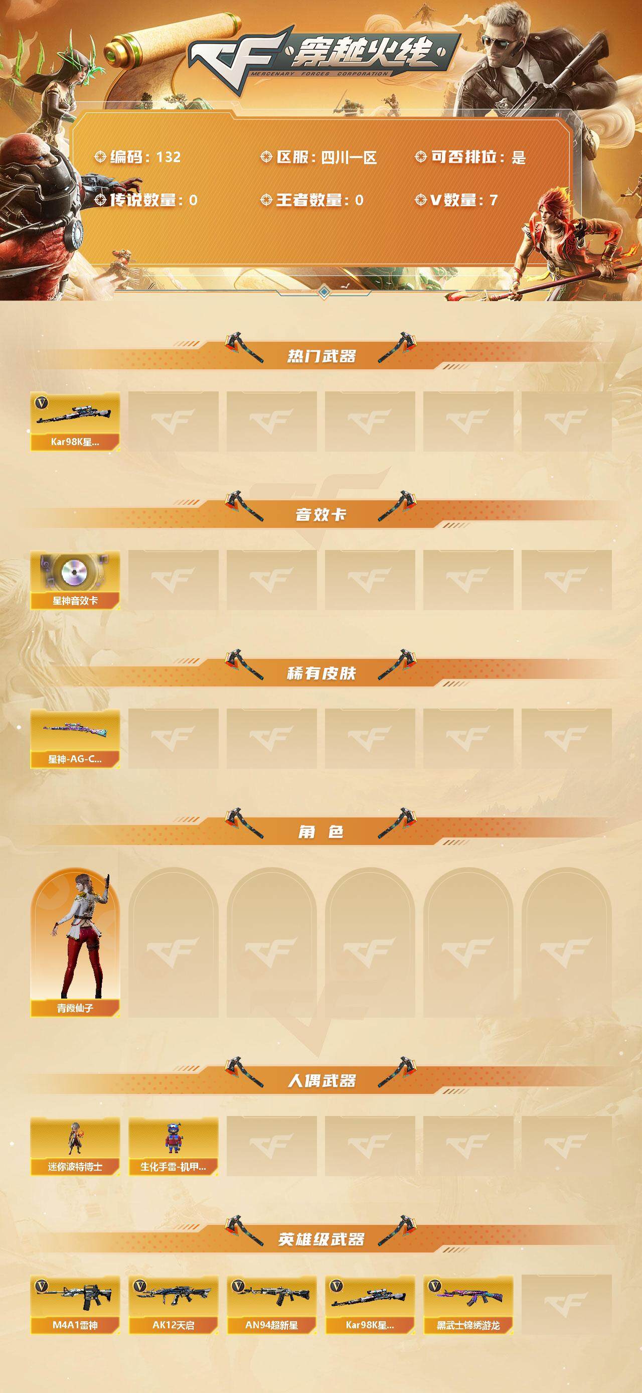 [12715601]四川一区-7V-0王者-0炫金 【热门武器】:Kar98K-星神 【音效卡】:Kar98K-星神音效卡 【稀有皮肤】:Kar98K-星神-AG-CFPLS21冠军皮肤 【角色】:青霞仙子 【人偶武器】:迷你波特博士,生化手雷-机甲核心 【英雄级武器】:M4A1-雷神,AK12-天启,AN94-超新星,Kar98K-星神,黑武士-锦绣游龙 【特殊枪械】:
