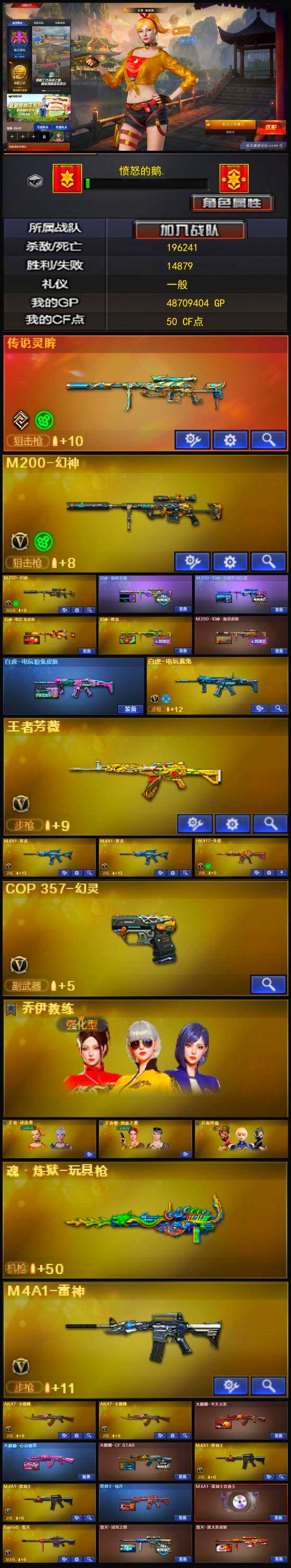 - [13237542]黑龙江区-52V-4王者-1炫金 【热门武器】:死亡之眼*2,M4A1-黑骑士,加特林-炼狱,COP-堕天神*2,沙鹰-修罗*2 【王者炫金武器】:王者之魄*2,王者之魂,炫金雷神 【皮肤】:雷神-星空,毁灭-星空,战神-紫绶金章皮肤*4,战神-流金岁月皮肤*2 【角色】:葵,樱,迷迭香,乔伊教练,空,暗夜-X,初恋灵狐,娟娟,龙儿,蜀雪,影武者-X 【人偶武器】:巴雷特-零-水下丽影*2,AWM-灵狐-15周年嘉年华,闪光弹-小乔 【暴走生化】:死亡之眼*2 【挑战大师】:激光毁灭者III-白马银枪,激光毁灭者III 【英雄级武器】:AK47-火麒麟,M4A1-雷神,M4A1-黑骑士,AK47-无影,M4A1-死神,M4A1-堕天神,AK-47-猩红传说*5,AK47-B-战神,Barrett-毁灭,AWM-裁决,Barrett-金色蔷薇,王者之怒-觉醒版,加特林-炼狱,沙鹰-修罗*2,COP-堕天神*2,屠龙*2,龙啸,麒麟刺-堕天神,麒麟刺,龙啸-堕天神,擎天-CF网剧冠军,高爆手雷-堕天神*6,闪光弹-堕天神*6,烟雾弹-堕天神*6 【特殊枪械】:1黑骑士,1炼狱