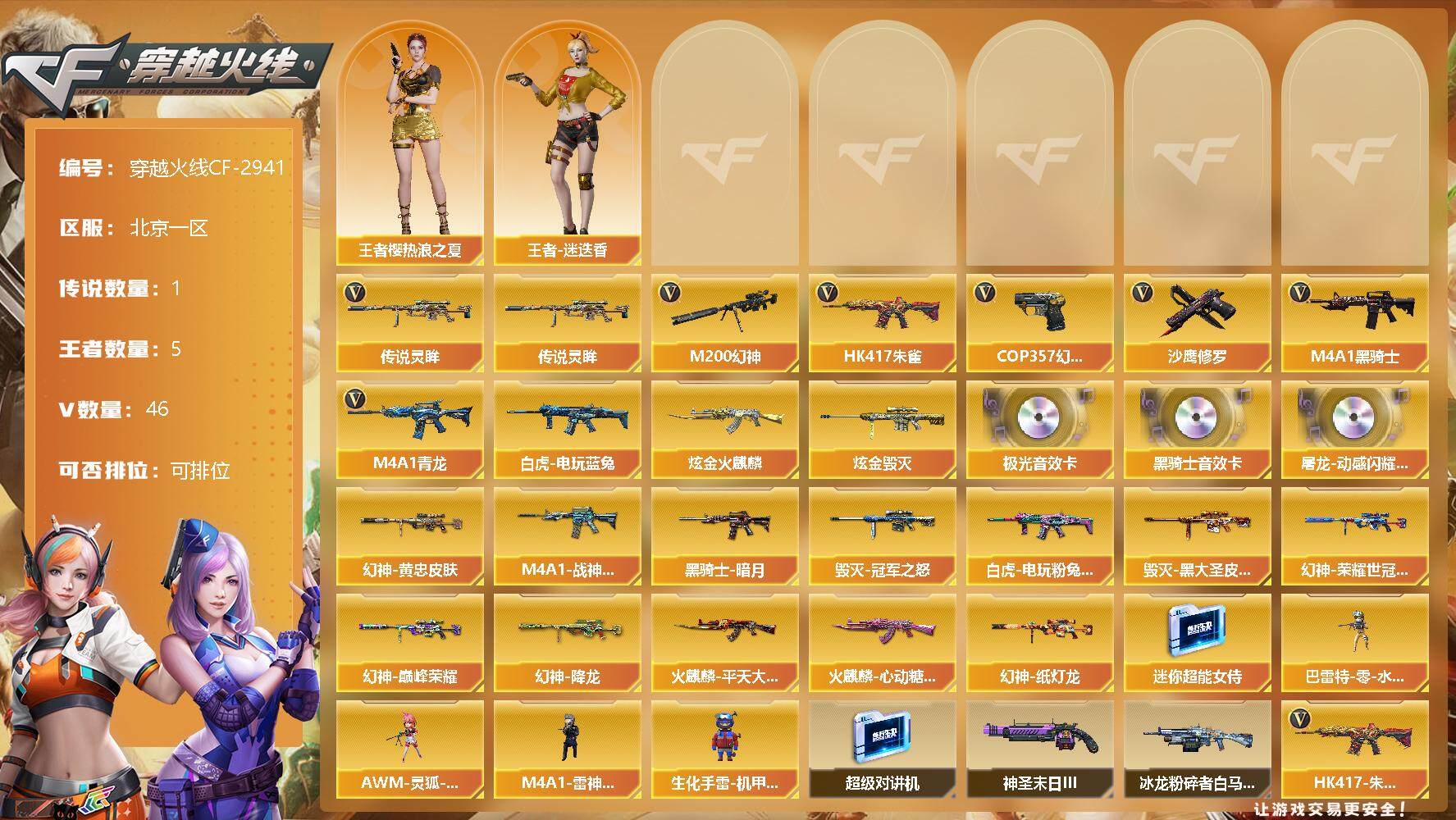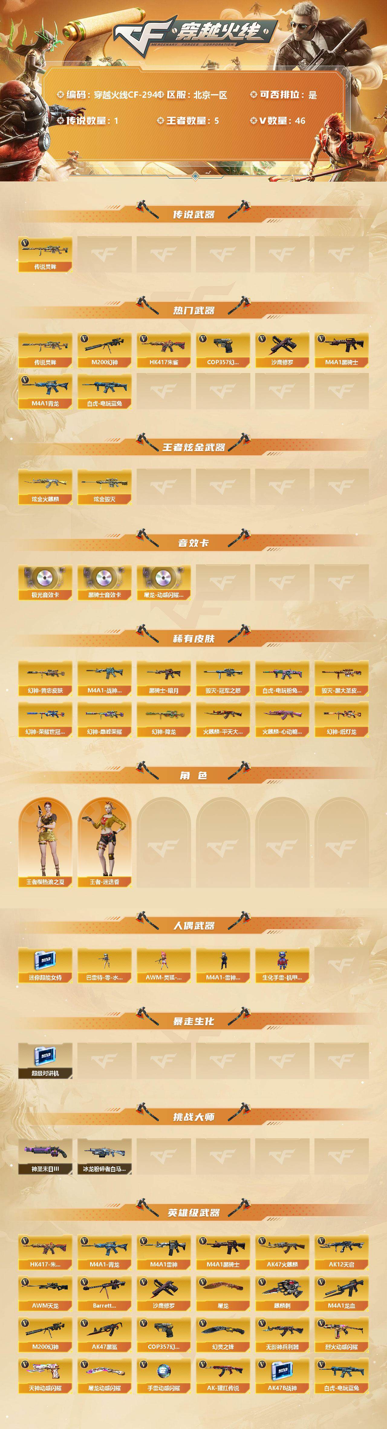 [12715606]北京一区-46V-5王者-2炫金 【传说武器】:传说灵眸 【热门武器】:传说灵眸,HK417-朱雀,M4A1-青龙*2,M200-幻神*2,白虎-电玩蓝兔,M4A1-黑骑士*2,COP 357-幻灵,沙鹰-修罗*2 【王者炫金武器】:炫金火麒麟,炫金毁灭 【音效卡】:屠龙-动感闪耀 音效卡,M4A1-黑骑士音效卡,Barrett-极光音效卡 【稀有皮肤】:M200-幻神-黄忠皮肤,幻神-巅峰荣耀,幻神-降龙,M200-幻神-荣耀世冠白鲨,幻神-纸灯龙皮肤,白虎-电玩粉兔皮肤,M4A1-战神赵云,火麒麟-平天大圣,火麒麟-心动糖果,黑骑士-暗月,毁灭-冠军之怒,毁灭-黑大圣皮肤 【角色】:王者樱-热浪之夏,王者-迷迭香 【人偶武器】:巴雷特-零-水下丽影,AWM-灵狐-15周年嘉年华,M4A1-雷神-精英刀锋,迷你超能女侍,生化手雷-机甲核心 【暴走生化】:超级对讲机 【挑战大师】:神圣爆裂者-末日III,冰龙粉碎者-白马银枪 【英雄级武器】:COP 357-幻灵,幻灵之锋,烈火-动感闪耀,天神-动感闪耀,屠龙-动感闪耀,手雷-动感闪耀,HK417-朱雀,M4A1-青龙*2,白虎-电玩蓝兔,无影-神兵利器,M4A1-雷神,M4A1-黑骑士*2,AK47-火麒麟*2,AK12-天启,AWM-天龙,Barrett-毁灭,M4A1-龙血,M200-幻神*2,AK47-黑鲨,AK-47-猩红传说*2,AK47-B-战神,沙鹰-修罗*2,麒麟刺*3,屠龙 【特殊枪械】:2黑骑士