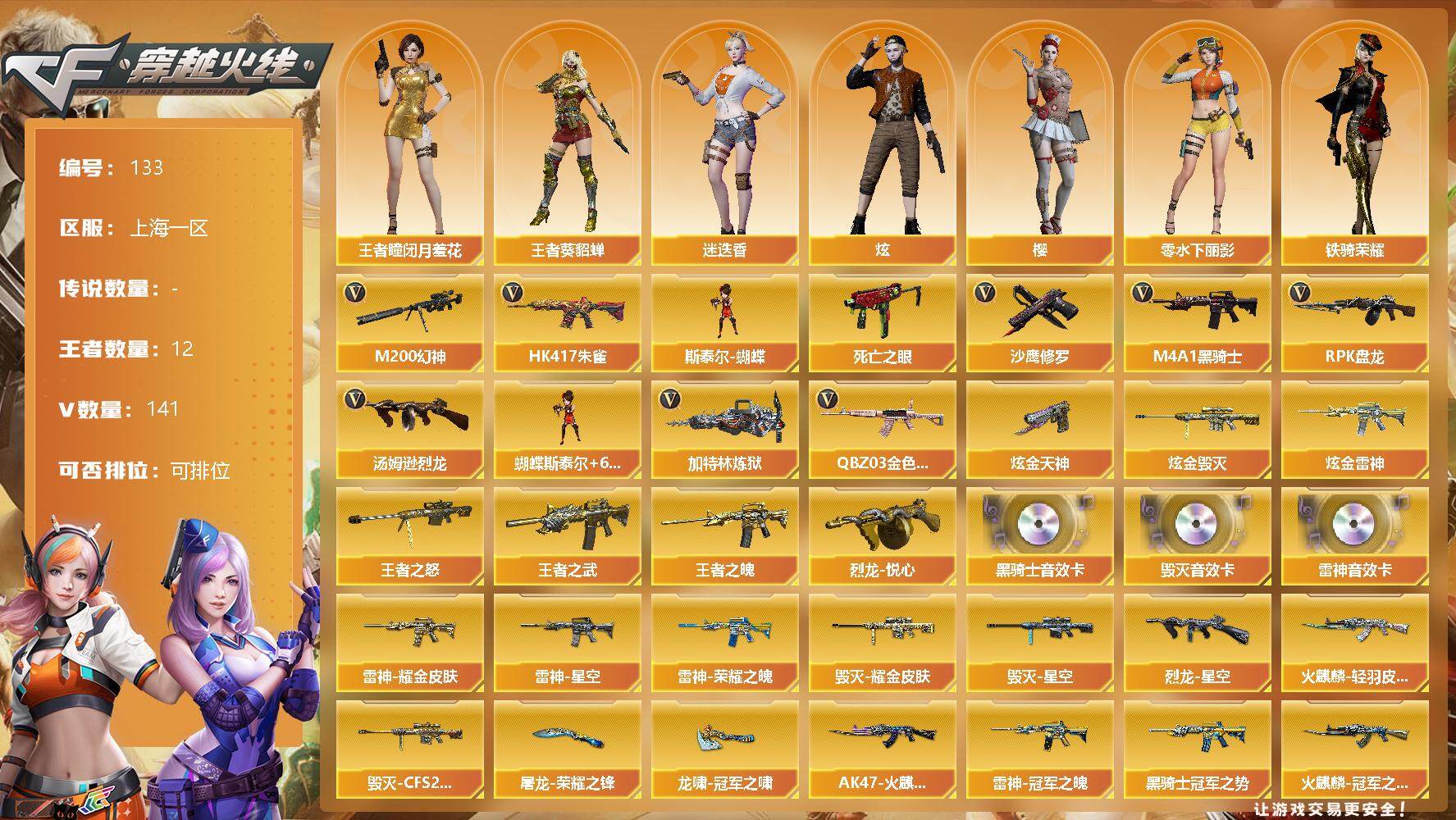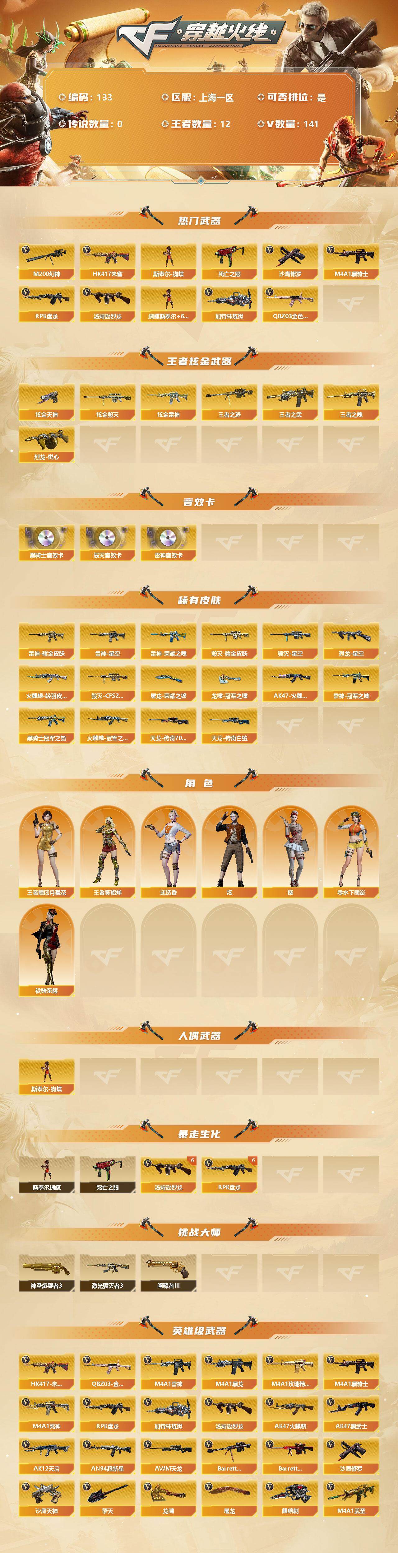 [12715659]上海一区-141V-12王者-6炫金 【热门武器】:QBZ03-金色蔷薇*3,HK417-朱雀,M200-幻神,死亡之眼,M4A1-黑骑士*2,汤姆逊-烈龙*9,RPK-盘龙*6,加特林-炼狱*4,斯泰尔-蝴蝶,沙鹰-修罗*5 【王者炫金武器】:炫金天神*4,炫金毁灭,炫金雷神,烈龙-悦心,王者之武,王者之怒,王者之魄*2 【音效卡】:M4A1-雷神音效卡,M4A1-黑骑士音效卡,Barrett-毁灭音效卡 【稀有皮肤】:雷神-荣耀之魄,雷神-星空,雷神-耀金皮肤,雷神-冠军之魄,火麒麟-冠军之心,AK47-火麒麟-传奇EVEN,火麒麟-轻羽皮肤,黑骑士-冠军之势,毁灭耀金皮肤,毁灭-星空,毁灭-CFS2020,AWM-天龙-传奇70KG*2,AWM-天龙-传奇白鲨*3,烈龙-星空,屠龙-荣耀之锋,龙啸-冠军之啸 【角色】:王者-瞳-闭月羞花,王者-葵-貂蝉,零-水下丽影,樱,炫,迷迭香,铁骑荣耀 【人偶武器】:斯泰尔-蝴蝶 【暴走生化】:斯泰尔-蝴蝶,死亡之眼 【挑战大师】:神圣爆裂者III,阐释者III,激光毁灭者III 【英雄级武器】:M4A1-夜魔,马来剑-夜魔,斩神刀-雷暴,M4A1-雷霆*2,M4A1-武圣*3,QBZ03-金色蔷薇*3,HK417-朱雀,M4A1-雷神*2,M4A1-黑龙*3,M4A1-玫瑰精灵*2,M4A1-黑骑士*2,M4A1-死神,RPK-盘龙*6,加特林-炼狱*4,汤姆逊-烈龙*9,AK47-火麒麟*2,AK47-黑武士*3,AK12-天启,AN94-超新星,AWM-天龙*3,Barrett-毁灭*2,Barrett-极光,M200-幻神,AK47-黑鲨,AK-47-猩红传说*22,AK47-B-战神,沙鹰-天神,沙鹰-修罗*5,麒麟刺*4,擎天*3,龙啸*4,屠龙 【特殊枪械】:蝴蝶斯泰尔+6烈龙,2黑骑士,6烈龙,6盘龙,4炼狱,1蝴蝶斯泰尔