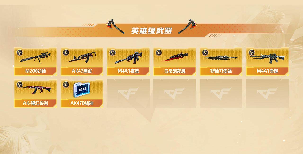 【英雄级武器】:M4A1-夜魔,马来剑-夜魔,斩神刀-雷暴,M4A1-雷霆*2,M4A1-武圣*3,QBZ03-金色蔷薇*3,HK417-朱雀,M4A1-雷神*2,M4A1-黑龙*3,M4A1-玫瑰精灵*2,M4A1-黑骑士*2,M4A1-死神,RPK-盘龙*6,加特林-炼狱*4,汤姆逊-烈龙*9,AK47-火麒麟*2,AK47-黑武士*3,AK12-天启,AN94-超新星,AWM-天龙*3,Barrett-毁灭*2,Barrett-极光,M200-幻神,AK47-黑鲨,AK-47-猩红传说*22,AK47-B-战神,沙鹰-天神,沙鹰-修罗*5,麒麟刺*4,擎天*3,龙啸*4,屠龙