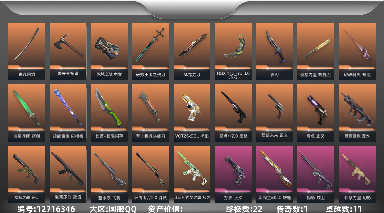 - [12260847]12橙皮 1金皮 39皮肤 27英雄 64卡面 535已用源晶 未定级 优质装备:狂徒-艾沃莉的梦之翼,爪刀-RGX 11z Pro 3.0,神圣领域 战刀,源始幻刃,诡秘蛇影 亮点皮肤:幻影-2022全球冠军赛,2022全球冠军赛 蝴蝶刀 套装:2022全球冠军赛,虚空遗器 佩枪皮肤:正义-虚空遗器,正义-西部未来 霰弹枪皮肤:判官-虚空遗器 步枪皮肤:幻影-虚空遗器,狂徒-噬影者,狂徒-虚空遗器