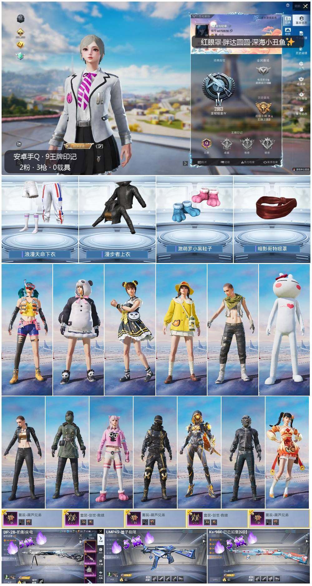 [12716515]安卓 手Q-2粉装-3特效枪-7.5w热力值-9王牌印记-229套装-255枪皮【热门品类】:套装-浪漫天命,套装-深海小丑鱼,套装-胖达圆圆,套装-金羽特工,套装-动感兔斯基人偶服,套装-潮萌小黄鸭,套装-暗影哥特,套装-浪漫波比【粉色套装】:粉装-葫芦兄弟,套装-创世·救赎【粉色枪皮等级】:UMP45-量子极限(五级),Kar98K-巳巳如意(五级),DP-28-豹影疾电(五级)