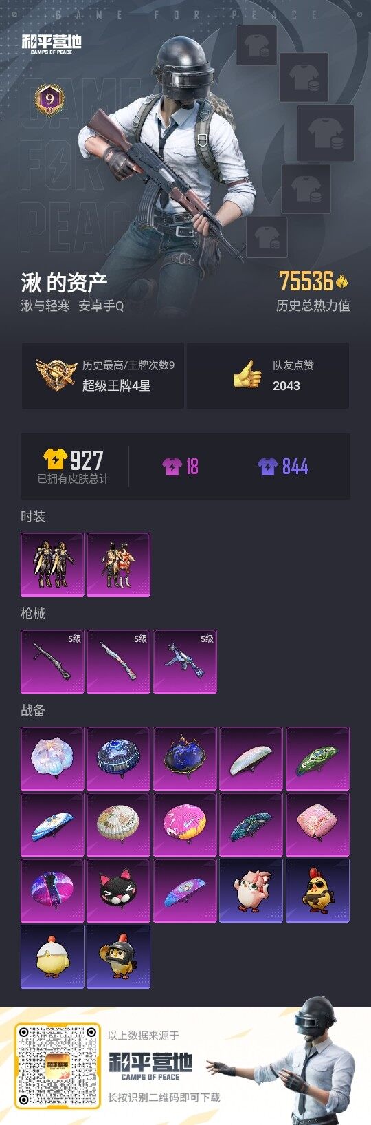 - [13301072]安卓 手Q-5粉装-11特效枪-0载具-3粉色飞行器-46510热力值-4王牌印记-77套装-160枪皮 【热门品类】:粉装-梦幻火箭,套装-龟仙人,角色-8号机 【粉色套装】:粉装-梦幻火箭,角色-千金淑猫,角色-萨利娅,角色-智耀战神,粉装-星穹咏叹调 【粉色枪皮等级】:M416-电玩时刻(五级),GROZA-镜光银凌(五级),AUG-暖羊咩咩(五级),M762-青锋波束(五级),UMP45-量子极限(五级),Vector-最终圣卫者(三级),AKS-74U-星穹咏叹调(五级),Kar98K-巳巳如意(五级),Mk14-甜梦熊击(五级),DP-28-豹影疾电(五级),爆炸猎弓-拳皇·狂花道(四级) 【粉色枪皮】:M416-电玩时刻,GROZA-镜光银凌,AUG-暖羊咩咩,M762-青锋波束,UMP45-量子极限,Vector-最终圣卫者,AKS-74U-星穹咏叹调,Kar98K-巳巳如意,Mk14-甜梦熊击,DP-28-豹影疾电,爆炸猎弓-拳皇·狂花道 【粉色飞行器】:梦幻火箭飞行器,圣域金龙飞行器,雀灵庇佑飞行器 【粉色降落伞】:莲影清波降落伞,沙丘之主降落伞,精灵梦叶罗丽降落伞,墨龙九天降落伞,金丰海韵降落伞,英伦信使降落伞,动力核心降落伞,赛博古神降落伞,圣域龙灵降落伞,星穹咏叹调降落伞,最终圣卫者降落伞,冷漠罗丽降落伞,绯穹魔姬降落伞,喜羊羊与灰太狼降落伞 【稀有套装】:套装-龟仙人,套装-巳巳如意,套装-荒原牛仔,套装-雏菊兔兔,套装-萝兰蝴蝶,角色-米开朗基罗,套装-糖糖葫芦,套装-青团波波,角色-俏兔智灵,套装-燕燕于飞,套装-鱼渊荷华,角色-风玲,套装-闪电轻猫,角色-糖霜甜心,套装-樱梦幻音,套装-粉恋花,套装-紫幽梦,套装-蓝冰羽,套装-星渊小夜曲,套装-霓虹热舞,套装-云朵鹅,套装-雪绒豹,角色-绛羽幽主,套装-朱霞炽焰,套装-凌霄紫焰 【稀有枪皮】:AKM-缤纷海域,AKM-龙的传人,M16A4-莲影清波,SCAR-L-红色方程式,M416-糯团青竹,AUG-耀粉歌者,AUG-月影灵韵,QBZ-绒兔团圆,M762-天降萌叽,M762-奇异狩猎者,M762-云朵鹅,M762-幻影飞狐,G36C-星穹咏叹调,AC-VAL-快闪甜心,蜜獾-天降萌叽,ARX-凌霄紫焰,UZI-桃源时光,UZI-月影灵韵,UMP45-夜灯,UMP45-生命誓言,