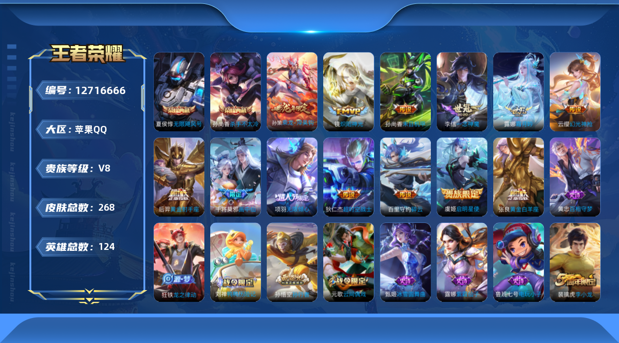 [12716666]苹果Q-V8-最强王者段位-124英雄-268皮肤-2典藏-0珍品无双-0无双-0珍品传说-13传说-75史诗