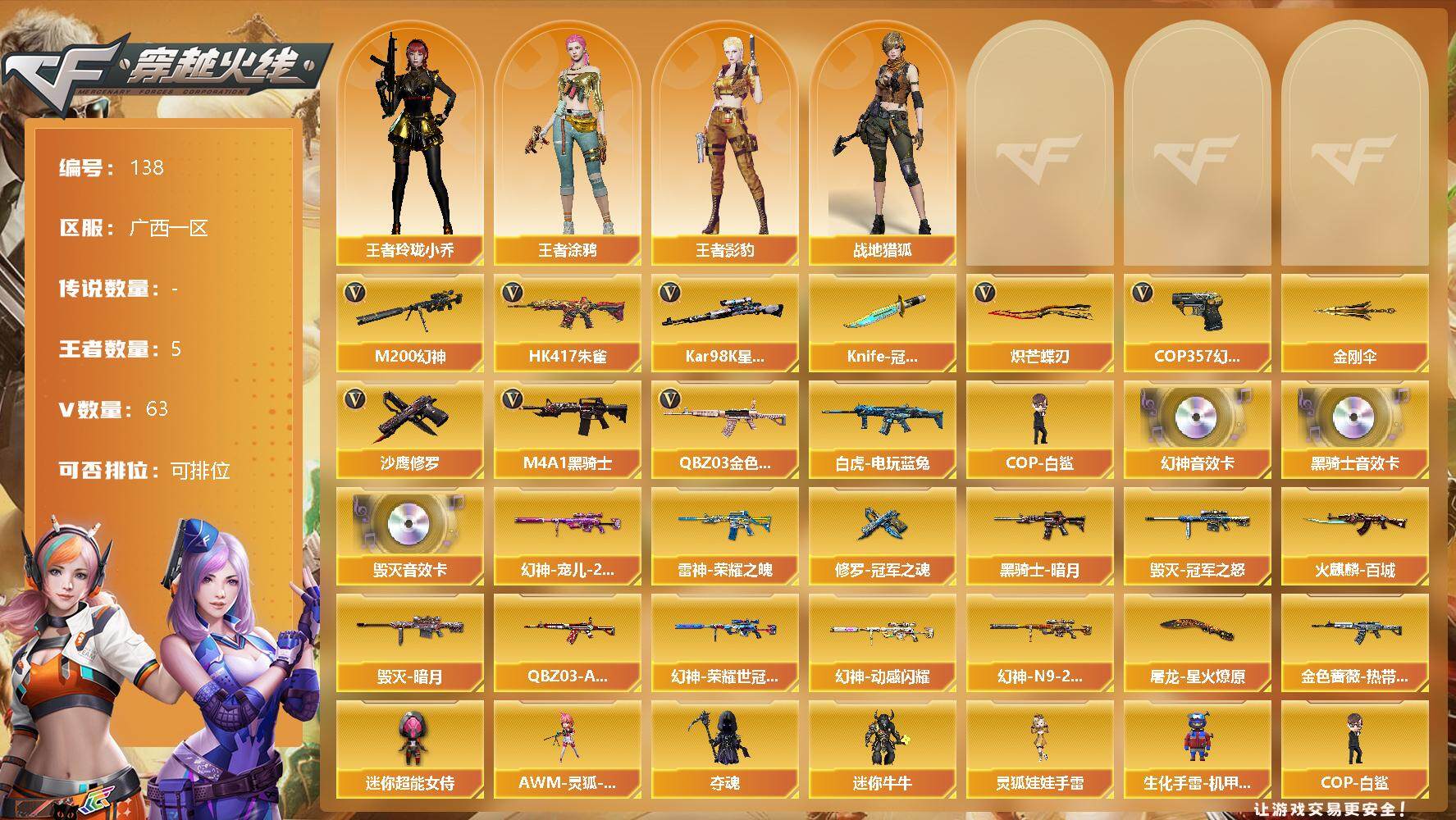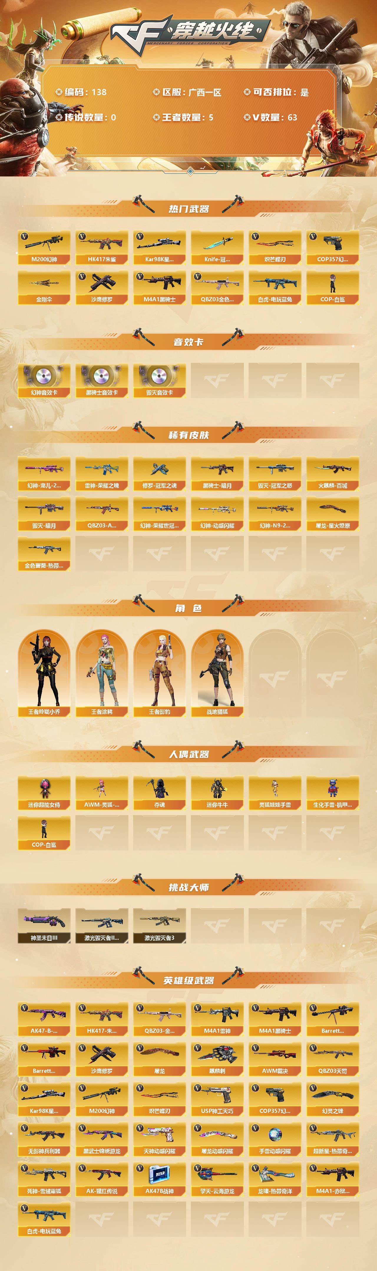 [12717089]广西一区-63V-5王者-0炫金 【热门武器】:QBZ03-金色蔷薇,HK417-朱雀,M200-幻神,白虎-电玩蓝兔,Kar98K-星神,M4A1-黑骑士,COP-白鲨,COP 357-幻灵*2,沙鹰-修罗*2,Knife-冠军之刃,炽芒蝶刃,金刚伞 【音效卡】:M200-幻神音效卡,M4A1-黑骑士音效卡,Barrett-毁灭音效卡 【稀有皮肤】:幻神-宠儿-2021MVP,M200-幻神-荣耀世冠白鲨,M200-幻神-N9-2022MVP,幻神-动感闪耀 皮肤,QBZ03-AG-CFPLS19冠军,金色蔷薇-热带奇洋 皮肤,雷神-荣耀之魄,火麒麟-百城*2,黑骑士-暗月,毁灭-暗月,毁灭-冠军之怒,修罗-冠军之魂,屠龙-星火燎原 【角色】:王者涂鸦,王者影豹,王者玲珑-小乔,战地猎狐 【人偶武器】:COP-白鲨,AWM-灵狐-15周年嘉年华,迷你超能女侍,夺魂,迷你牛牛,灵狐娃娃手雷,生化手雷-机甲核心*2 【挑战大师】:神圣爆裂者-末日III,激光毁灭者III*2,激光毁灭者III-白马银枪 【英雄级武器】:USP-神工天巧,COP 357-幻灵*2,幻灵之锋*2,天神-动感闪耀,屠龙-动感闪耀,手雷-动感闪耀,QBZ03-金色蔷薇,HK417-朱雀,白虎-电玩蓝兔,无影-神兵利器,M4A1-雷神,M4A1-黑骑士,Barrett-毁灭,Barrett-极光,AWM-裁决,QBZ03-天罚,Kar98K-星神,M200-幻神,黑武士-锦绣游龙,超新星-热带奇洋,死神-雪域霜狐,AK-47-猩红传说*2,AK47-B-战神,AK47-B-常胜将军,M4A1-赤狱骑士,沙鹰-修罗*2,炽芒蝶刃,麒麟刺,屠龙,擎天-云海游龙,龙啸-热带奇洋 【特殊枪械】:1黑骑士