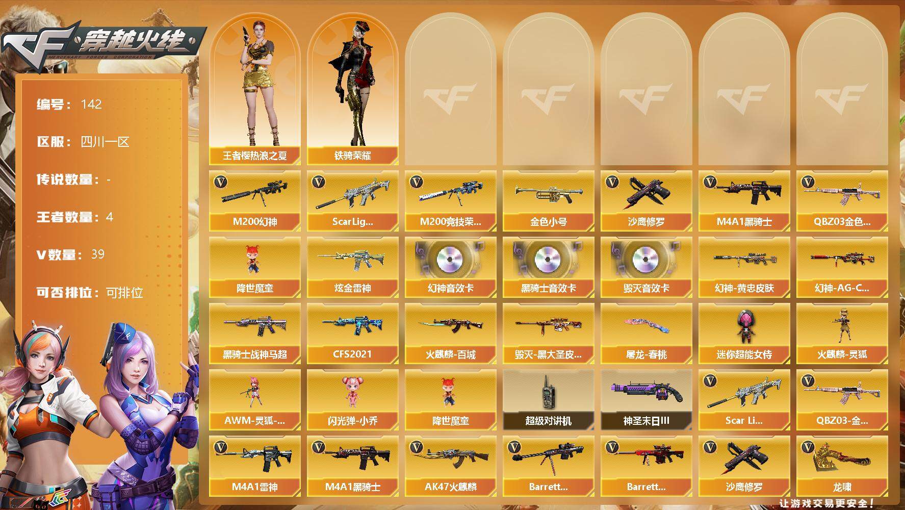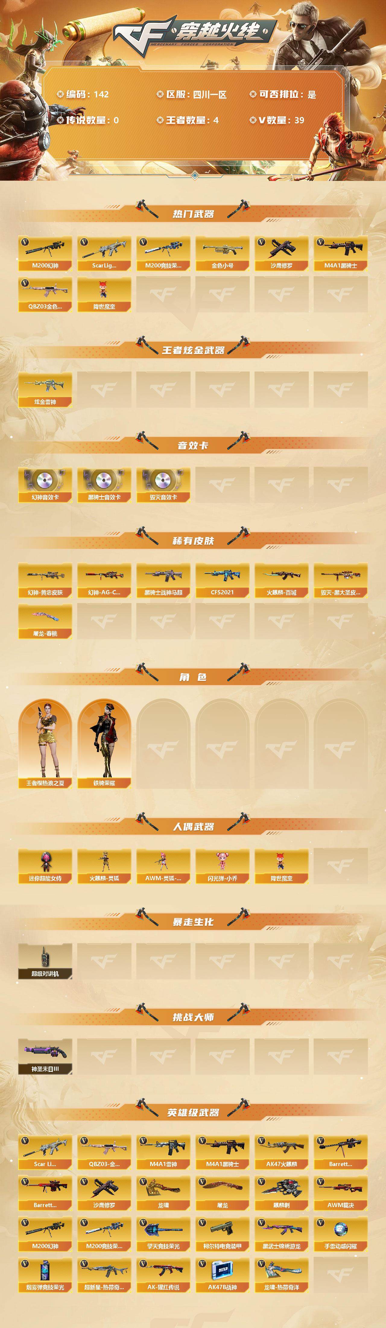 [12717883]四川一区-39V-4王者-1炫金 【热门武器】:QBZ03-金色蔷薇,Scar Light-白虎,M200-幻神*2,M200-竞技荣光,金色小号,M4A1-黑骑士,降世魔童,沙鹰-修罗*3 【王者炫金武器】:炫金雷神 【音效卡】:M200-幻神音效卡,M4A1-黑骑士音效卡,Barrett-毁灭音效卡 【稀有皮肤】:M200-幻神-黄忠皮肤,幻神-AG-CFPLS17冠军,火麒麟-百城,黑骑士-战神马超,黑骑士-CFS2021,毁灭-黑大圣皮肤,屠龙-春桃 皮肤 【角色】:王者樱-热浪之夏,铁骑荣耀 【人偶武器】:降世魔童,火麒麟-灵狐,AWM-灵狐-15周年嘉年华,迷你超能女侍,闪光弹-小乔 【暴走生化】:超级对讲机 【挑战大师】:神圣爆裂者-末日III 【英雄级武器】:M200-竞技荣光,擎天-竞技荣光,烟雾弹-竞技荣光,柯尔特-电竞装甲,手雷-动感闪耀,QBZ03-金色蔷薇,Scar Light-白虎,M4A1-雷神,M4A1-黑骑士,AK47-火麒麟,Barrett-毁灭,Barrett-极光,AWM-裁决,M200-幻神*2,黑武士-锦绣游龙,超新星-热带奇洋,AK-47-猩红传说*10,AK47-B-战神*2,沙鹰-修罗*3,麒麟刺,龙啸,屠龙,龙啸-热带奇洋 【特殊枪械】:1白虎,1黑骑士