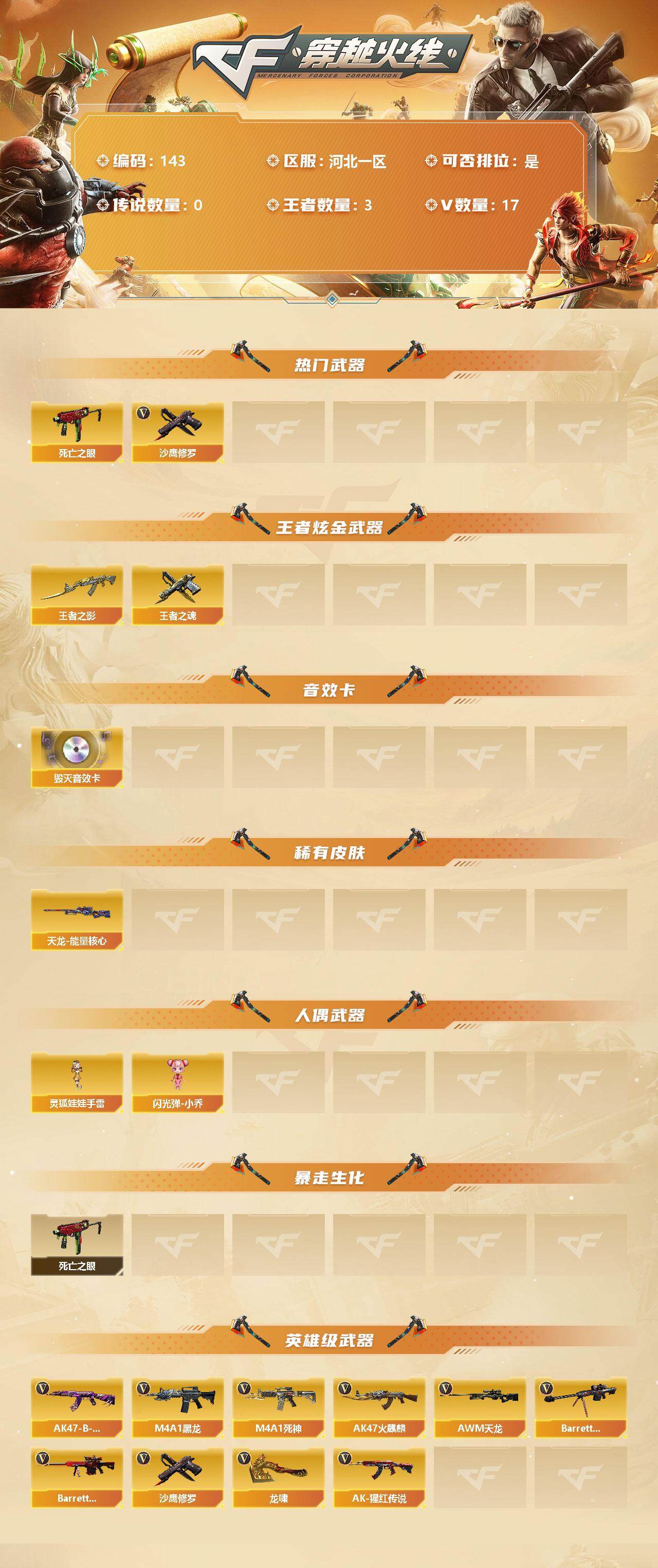 [12717971]河北一区-17V-3王者-0炫金 【热门武器】:死亡之眼*2,沙鹰-修罗*4 【王者炫金武器】:王者之影,王者之魂 【音效卡】:Barrett-毁灭音效卡 【稀有皮肤】:天龙-能量核心 【人偶武器】:灵狐娃娃手雷,闪光弹-小乔 【暴走生化】:死亡之眼*2 【英雄级武器】:M4A1-黑龙,M4A1-死神,AK47-火麒麟,AWM-天龙,Barrett-毁灭,Barrett-极光,AK-47-猩红传说,AK47-B-常胜将军,沙鹰-修罗*4,龙啸 【特殊枪械】: