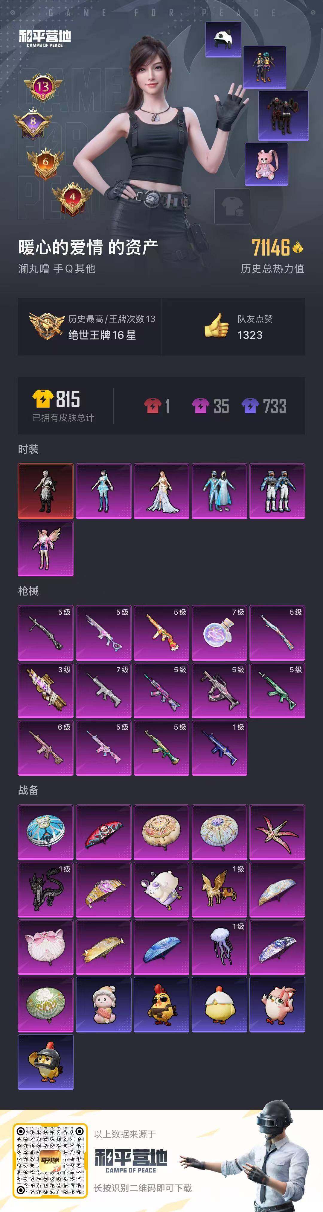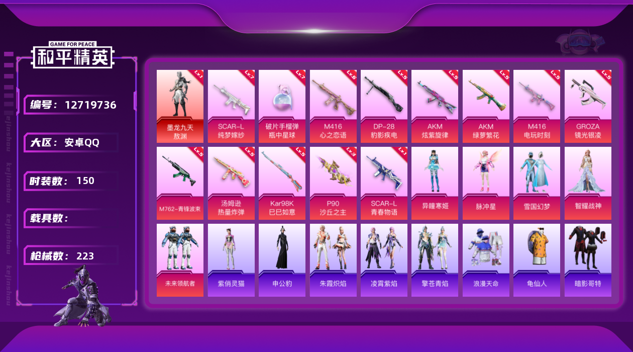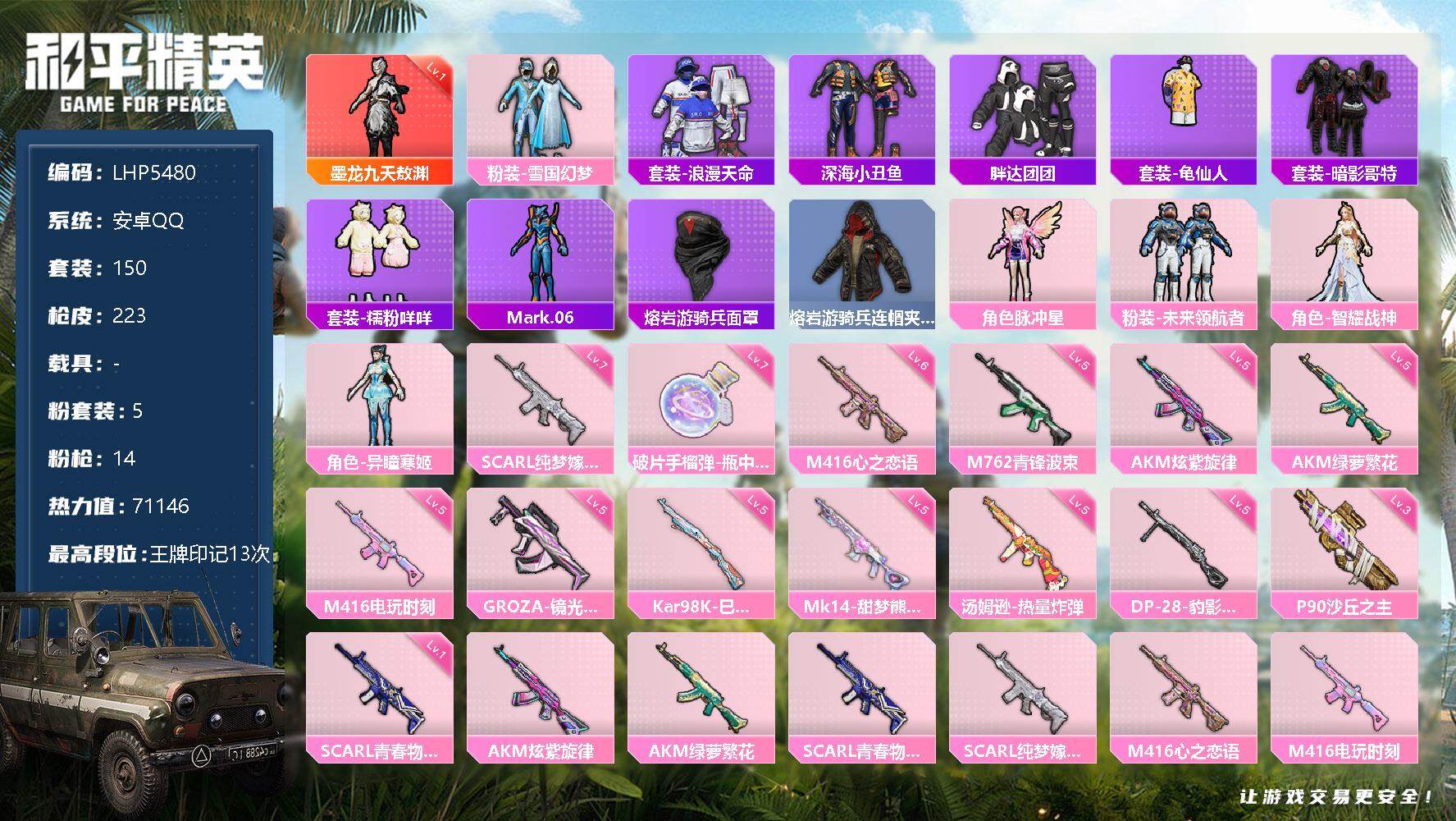 [12719736]地铁满天赋/安卓 手Q-1神装-5粉装-14特效枪-0载具-5粉色飞行器-71146热力值-13王牌印记-150套装-223枪皮【红色神装等级】:墨龙九天-敖渊(一级)【红色角色神装】:墨龙九天-敖渊【热门品类】:粉装-雪国幻梦,套装-浪漫天命,套装-深海小丑鱼,套装-胖达团团,套装-龟仙人,套装-暗影哥特,套装-糯粉咩咩,角色-Mark.06,熔岩游骑兵面罩,熔岩游骑兵连帽夹克【粉色套装】:粉装-雪国幻梦,角色-脉冲星,粉装-未来领航者,角色-智耀战神,角色-异瞳寒姬【粉色枪皮等级】:AKM-炫紫旋律(五级),AKM-绿萝繁花(五级),SCAR-L-青春物语(一级),SCAR-L-纯梦嫁纱(七级),M416-心之恋语(六级),M416-电玩时刻(五级),GROZA-镜光银凌(五级),M762-青锋波束(五级),汤姆逊-热量炸弹(五级),P90-沙丘之主(三级),Kar98K-巳巳如意(五级),Mk14-甜梦熊击(五级),DP-28-豹影疾电(五级),破片手榴弹-瓶中星球(七级)【粉色枪皮】:AKM-炫紫旋律,AKM-绿萝繁花,SCAR-L-青春物语,SCAR-L-纯梦嫁纱,M416-心之恋语,M416-电玩时刻,GROZA-镜光银凌,M762-青锋波束,汤姆逊-热量炸弹,P90-沙丘之主,Kar98K-巳巳如意,Mk14-甜梦熊击,DP-28-豹影疾电,破片手榴弹-瓶中星球【粉色飞行器】:酣梦熊熊飞行器,沙丘之主天马,龙翔九天飞行器,幻海精灵飞行器