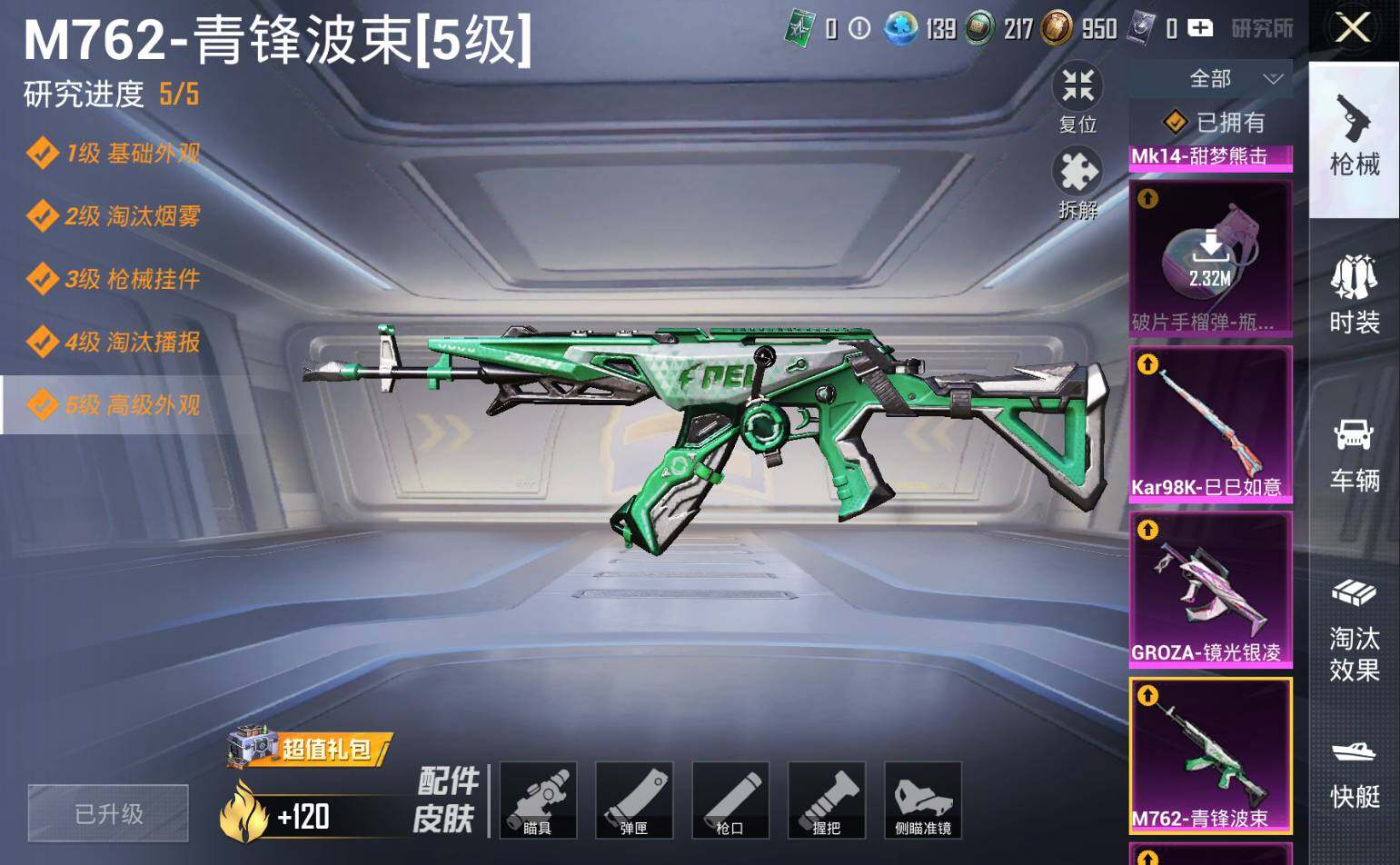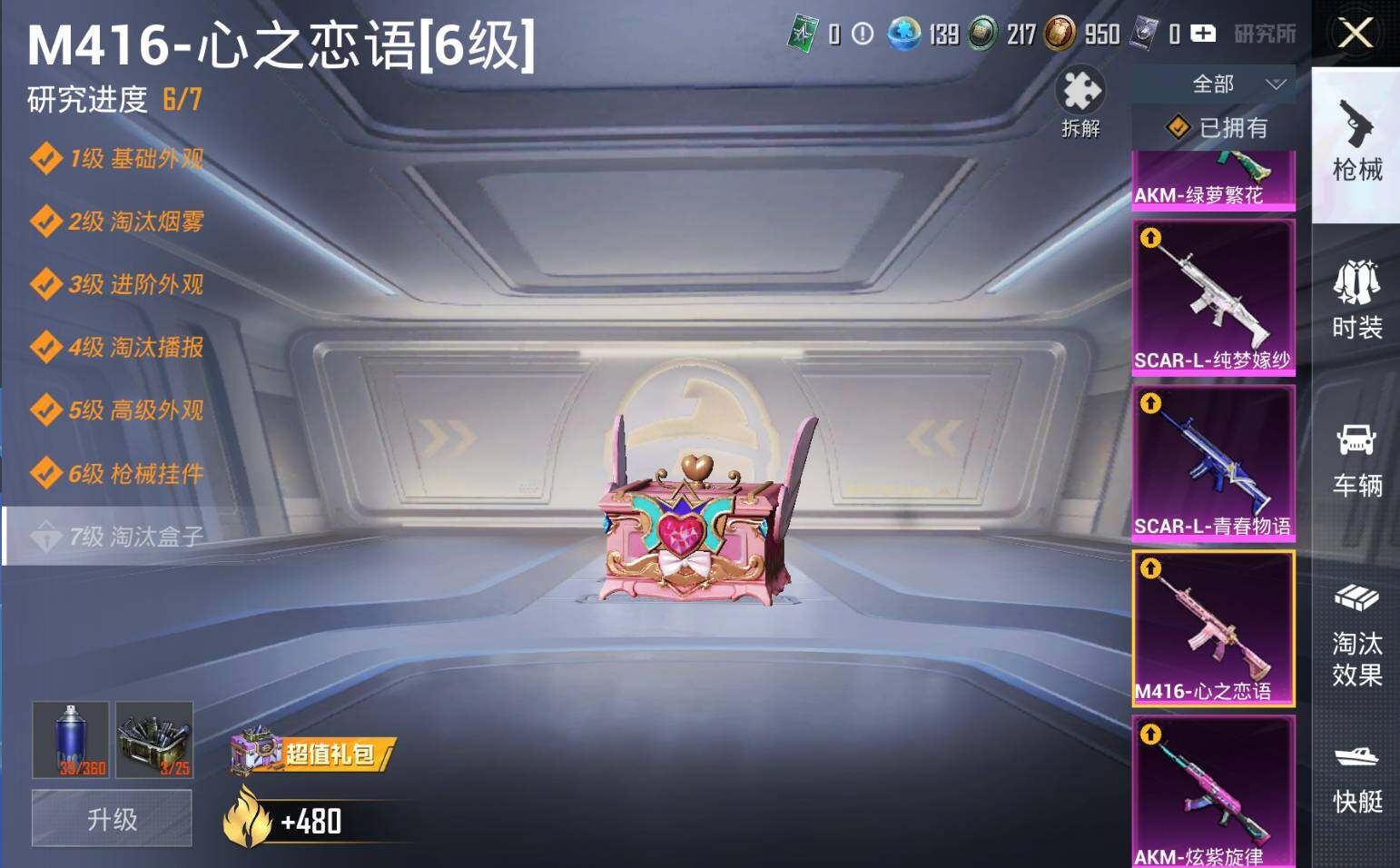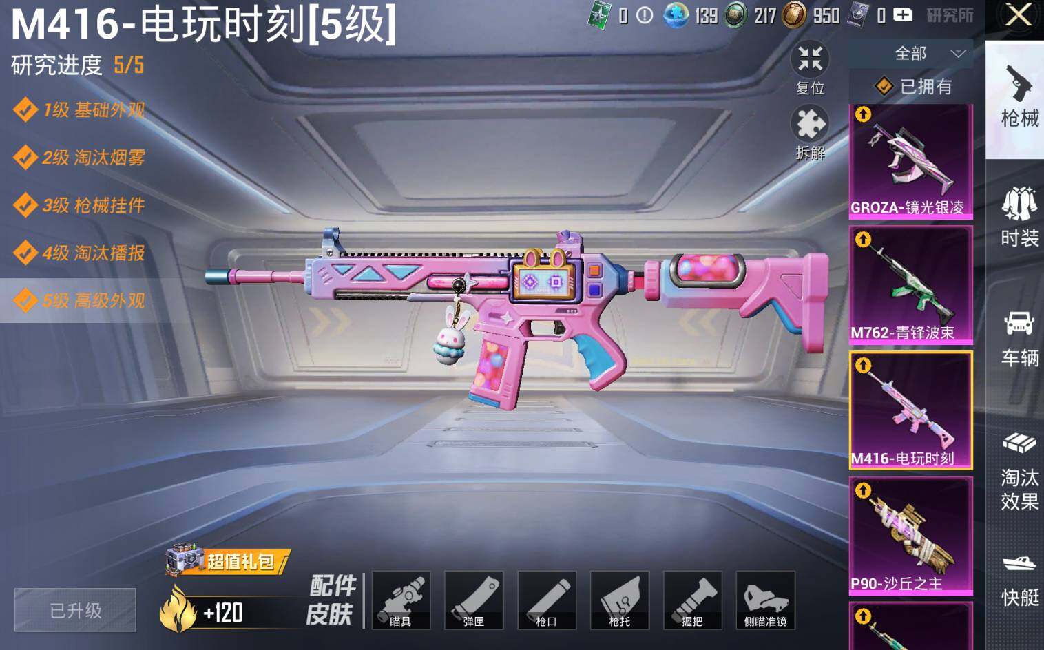 AKM-炫紫旋律,AKM-绿萝繁花,SCAR-L-青春物语,SCAR-L-纯梦嫁纱,M416-心之恋语,M416-电玩时刻,GROZA-镜光银凌,M762-青锋波束,P90-沙丘之主,Kar98K-巳巳如意