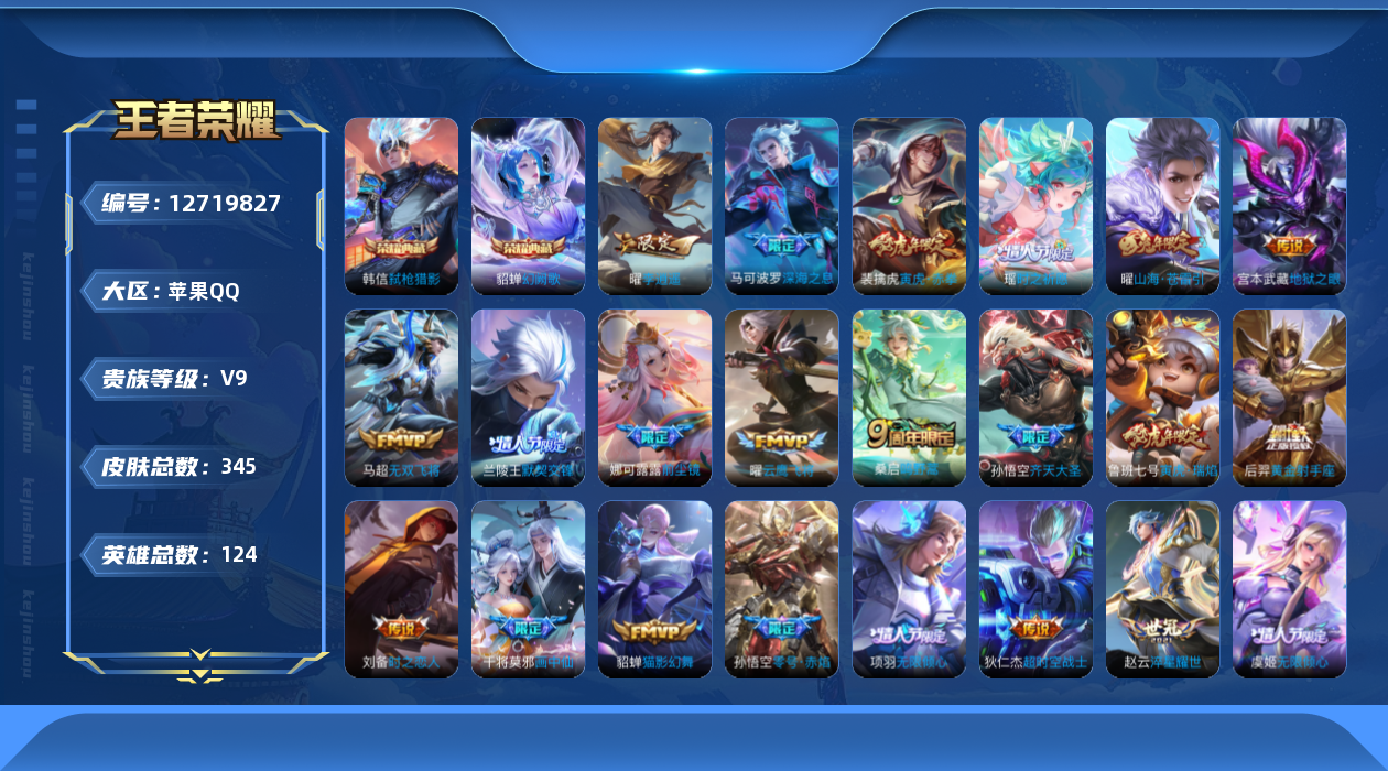 [12719827]苹果Q-V9-永恒钻石V段位-124英雄-345皮肤-2典藏-0珍品无双-0无双-0珍品传说-37传说-98史诗 【荣耀典藏】:貂蝉幻阙歌,韩信弑枪猎影 【内测皮肤】:艾琳女武神,狂铁特工战影 【传说皮肤】:狄仁杰超时空战士,孙悟空地狱火,宫本武藏地狱之眼,后羿黄金射手座,梦奇胖达荣荣,花木兰冠军飞将,虞姬云霓雀翎,貂蝉猫影幻舞,刘备时之恋人,曜云鹰飞将,孙悟空零号赤焰,虞姬启明星使,铠绛天战甲,兰陵王默契交锋,曜李逍遥 ,王昭君乞巧织情,赵云淬星耀世,鲁班七号寅虎瑞焰,裴擒虎寅虎赤拳,瑶时之祈愿,孙策挚爱之约,马超无双飞将,后羿无尽星芒,马可波罗深海之息,孙尚香音你闪耀,娜可露露前尘镜,曜山海苍雷引,孙悟空齐天大圣,伽罗炽翼辉光,项羽无限倾心,虞姬无限倾心,干将莫邪画中仙,张飞百相守梦,安琪拉追逃游戏,亚瑟追逃游戏,东皇太一灼幽烈阳,桑启鸣野蒿 【限定皮肤】:蔡文姬夏日便利店,虞姬夏日便利店,姜子牙天穹之誓,狄仁杰阴阳师,赵云皇家上将,鲁班七号寅虎瑞焰,钟无艳超时空战士,孙膑天狼运算者,扁鹊奇幻香踪,白起夜都怪侠,芈月幻夜卜梦,元歌无心,夏侯惇匿光决锋者,甄姬落雪兰心,马可波罗深海之息,马可波罗山海玄木吟,狄仁杰魔术师,达摩沙漠行僧,项羽海滩派对,项羽无限倾心,关羽百相守梦,安琪拉追逃游戏,韩信傲雪梅枪,王昭君凤凰于飞,王昭君午后时光,兰陵王默契交锋,兰陵王金庭之子,花木兰默契交锋,娜可露露前尘镜,亚瑟追逃游戏,孙悟空至尊宝,孙悟空零号赤焰,孙悟空孙行者,孙悟空齐天大圣,后羿辉光之辰,后羿无尽星芒,刘备百相守梦,张飞百相守梦,李元芳云中旅人,虞姬启明星使,虞姬无限倾心,钟馗神迹守卫,杨戬潮玩骑兵,干将莫邪画中仙,雅典娜黎明之约,鬼谷子原初探秘者,鬼谷子五谷丰年,黄忠烈魂,黄忠火炮绅士,铠青龙志,苏烈玄武志,百里玄策原初追逐者,弈星混沌棋,梦奇顽趣,公孙离玉兔公主,沈梦溪大漠名商,沈梦溪匿光破解者,明世隐疑决卦,明世隐吟游魔法,裴擒虎寅虎赤拳,裴擒虎擒涛扼浪,狂铁电玩高手,米莱狄御霄,瑶时之祈愿,瑶山海碧波行,伽罗炽翼辉光,孙策挚爱之约,上官婉儿梁祝,嫦娥暖冬兔眠,曜李逍遥 ,曜山海苍雷引,西施玲珑珍味,鲁班大师探海日志,桑启海盐诗旅,暃星界游侠,戈娅驭风魔法,艾琳女武神,艾琳流音漫舞,司空震地狱燃心,阿古朵江河有灵,张良古海寻踪,蒙恬荣光圣徽,高渐离燃音魔法,妲