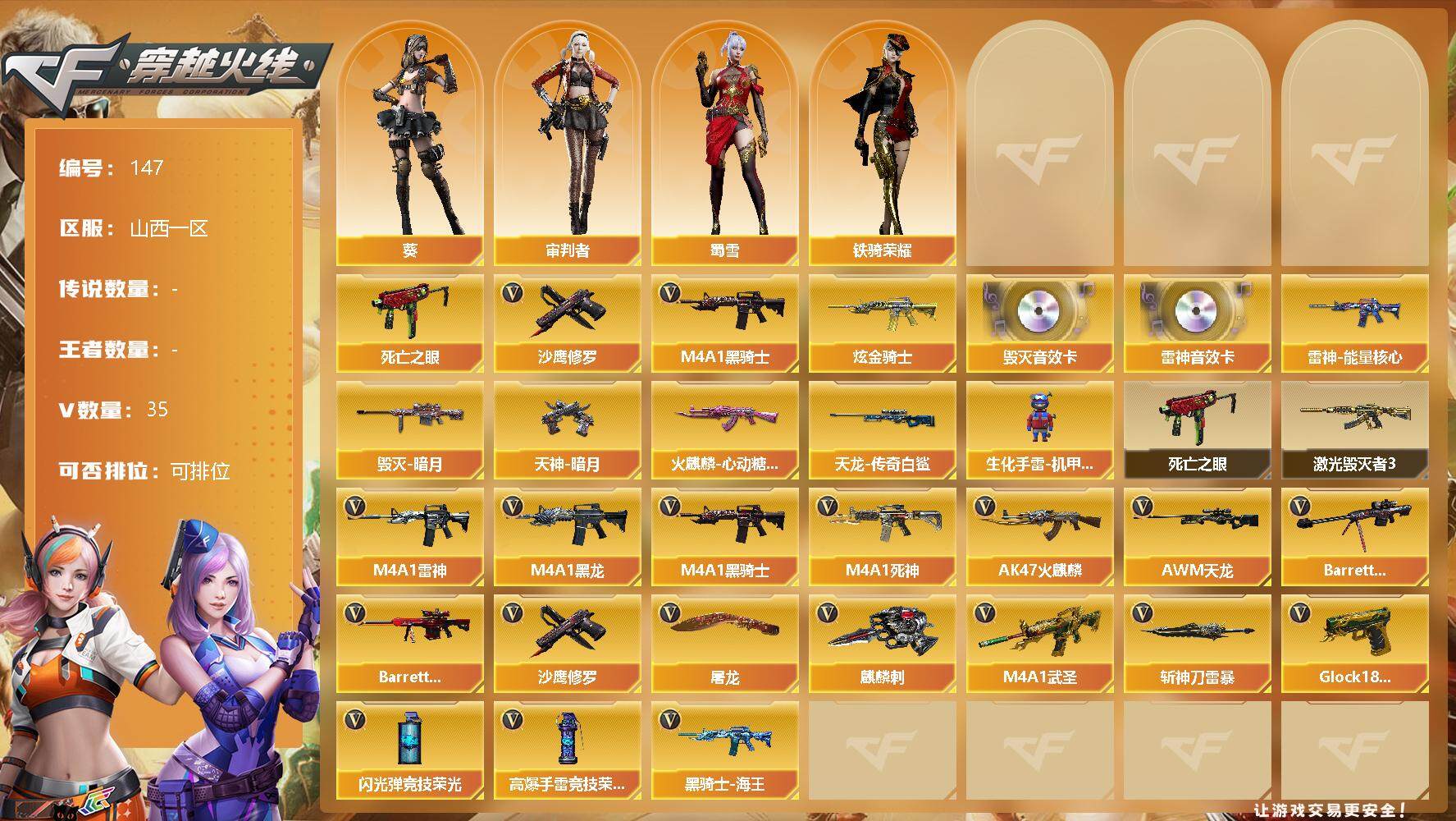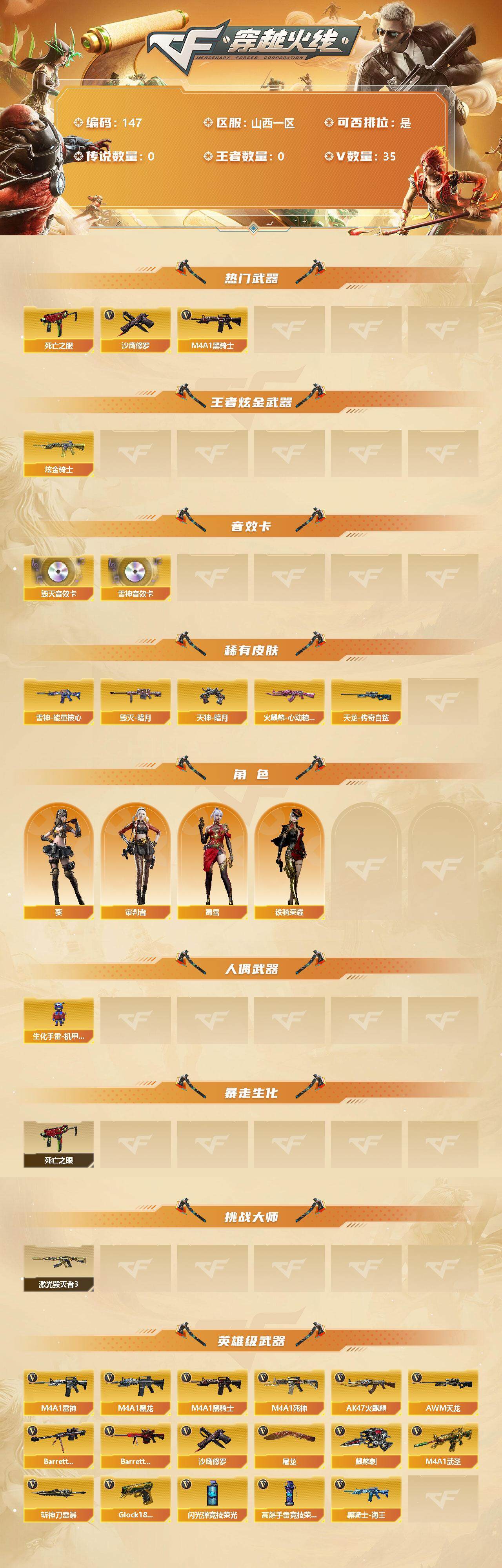 [12720583]山西一区-35V-0王者-1炫金 【热门武器】:死亡之眼,M4A1-黑骑士,沙鹰-修罗*6 【王者炫金武器】:炫金骑士 【音效卡】:M4A1-雷神音效卡,Barrett-毁灭音效卡 【稀有皮肤】:雷神-能量核心,火麒麟-心动糖果,毁灭-暗月,AWM-天龙-传奇白鲨,天神-暗月 【角色】:审判者,葵,蜀雪,铁骑荣耀 【人偶武器】:生化手雷-机甲核心 【暴走生化】:死亡之眼 【挑战大师】:激光毁灭者III 【英雄级武器】:高爆手雷-竞技荣光,闪光弹-竞技荣光,斩神刀-雷暴,M4A1-武圣,Glock18-武圣,M4A1-雷神*2,M4A1-黑龙,M4A1-黑骑士,M4A1-死神,AK47-火麒麟*2,AWM-天龙,Barrett-毁灭*2,Barrett-极光,黑骑士-海王*2,沙鹰-修罗*6,麒麟刺,屠龙*5 【特殊枪械】:1黑骑士