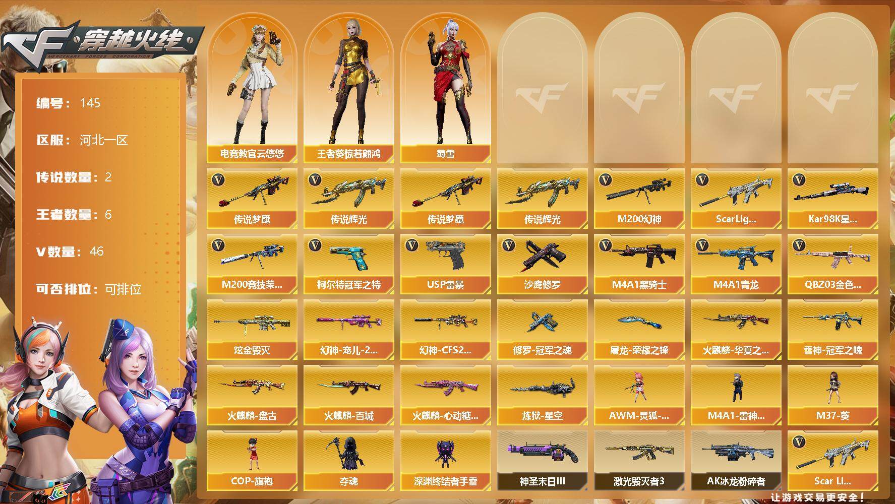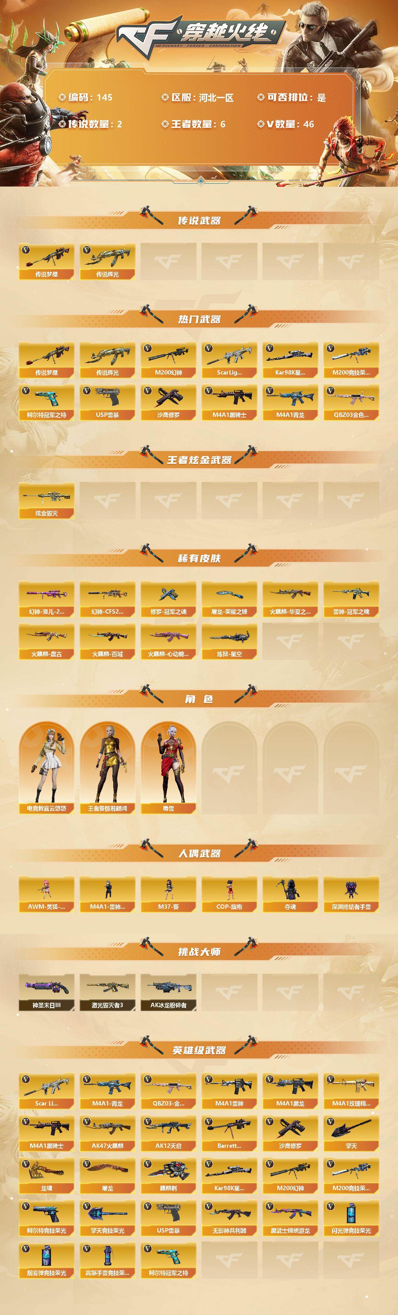 [12720406]河北一区-46V-6王者-1炫金 【传说武器】:传说梦魇,传说辉光 【热门武器】:传说梦魇,传说辉光,QBZ03-金色蔷薇,Scar Light-白虎,M4A1-青龙,M200-幻神,M200-竞技荣光,柯尔特-冠军之特,Kar98K-星神,M4A1-黑骑士,USP-雷暴,沙鹰-修罗*4 【王者炫金武器】:炫金毁灭 【稀有皮肤】:幻神-宠儿-2021MVP,幻神-CFS2022,雷神-冠军之魄,火麒麟-华夏之心,火麒麟-盘古,火麒麟-百城,火麒麟-心动糖果,炼狱-星空,修罗-冠军之魂*2,屠龙-荣耀之锋 【角色】:王者葵-惊若翩鸿,电竞教官-云悠悠,蜀雪 【人偶武器】:AWM-灵狐-15周年嘉年华,M4A1-雷神-精英刀锋,M37-葵,COP-旗袍,夺魂,深渊终结者手雷 【挑战大师】:神圣爆裂者-末日III,激光毁灭者III,AK47-冰龙粉碎者 【英雄级武器】:M200-竞技荣光,柯尔特-竞技荣光,擎天-竞技荣光,高爆手雷-竞技荣光*5,烟雾弹-竞技荣光*3,闪光弹-竞技荣光*3,USP-雷暴,QBZ03-金色蔷薇,Scar Light-白虎,M4A1-青龙,无影-神兵利器,M4A1-雷神*2,M4A1-黑龙,M4A1-玫瑰精灵,M4A1-黑骑士,AK47-火麒麟,AK12-天启,Barrett-毁灭,Kar98K-星神,M200-幻神,黑武士-锦绣游龙,柯尔特-冠军之特,沙鹰-修罗*4,麒麟刺,擎天,龙啸,屠龙*2 【特殊枪械】:1白虎,1黑骑士