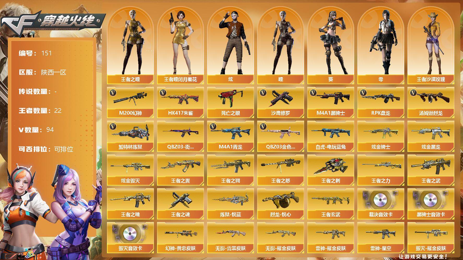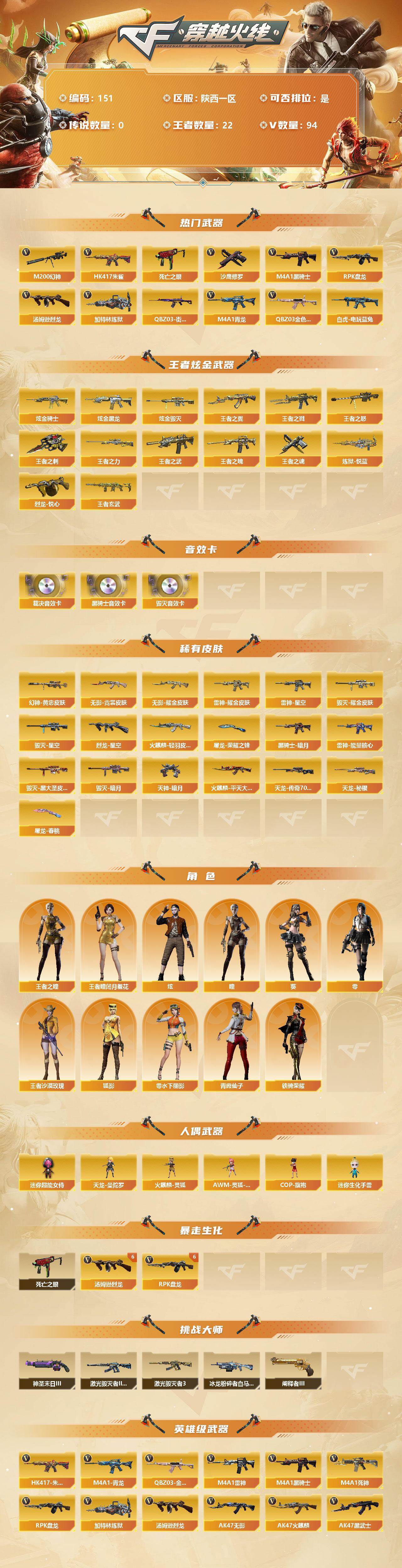 [12720873]陕西一区-94V-22王者-3炫金 【热门武器】:QBZ03-金色蔷薇,HK417-朱雀,M4A1-青龙,M200-幻神*2,死亡之眼*3,白虎-电玩蓝兔,QBZ03-街机,M4A1-黑骑士*2,汤姆逊-烈龙*6,RPK-盘龙*6,加特林-炼狱,沙鹰-修罗*4 【王者炫金武器】:炫金骑士,炫金黑龙,炫金毁灭,炼狱-悦蓝*2,烈龙-悦心,王者之戮,王者之翼,王者之武,王者之怒,王者之力,王者之魄,王者玄武,王者之魂,王者之刺*2 【音效卡】:M4A1-黑骑士音效卡,Barrett-毁灭音效卡,AWM-裁决音效卡 【稀有皮肤】:M200-幻神-黄忠皮肤,雷神-能量核心,雷神-星空,雷神-耀金皮肤,火麒麟-轻羽皮肤,火麒麟-平天大圣,黑骑士-暗月,毁灭-暗月*2,毁灭耀金皮肤,毁灭-星空*2,毁灭-黑大圣皮肤,天龙-秘银,AWM-天龙-传奇70KG,无影耀金皮肤,无影-霓裳皮肤,烈龙-星空,天神-暗月,屠龙-荣耀之锋,屠龙-春桃 皮肤 【角色】:王者-瞳-闭月羞花,王者之瞳,王者沙漠玫瑰,狐影,零-水下丽影,零,葵,瞳,炫,铁骑荣耀,青霞仙子 【人偶武器】:天龙-曼陀罗,火麒麟-灵狐,AWM-灵狐-15周年嘉年华,COP-旗袍,迷你超能女侍,迷你生化手雷 【暴走生化】:死亡之眼*3 【挑战大师】:神圣爆裂者-末日III,阐释者III,激光毁灭者III*3,激光毁灭者III-白马银枪,冰龙粉碎者-白马银枪 【英雄级武器】:M4A1-武圣,Glock18-武圣,QBZ03-金色蔷薇,HK417-朱雀,M4A1-青龙,白虎-电玩蓝兔,无影-神兵利器,M4A1-雷神*2,M4A1-黑骑士*2,M4A1-死神*4,RPK-盘龙*6,加特林-炼狱,汤姆逊-烈龙*6,AK47-无影*3,AK47-火麒麟*3,AK47-黑武士,AN94-超新星,AWM-天龙,Barrett-毁灭*2,Barrett-极光,AWM-裁决,AA-12-雷霆*4,M200-幻神*2,AK47-黑鲨*5,M4A1-猎神,M4A1-千变,黑骑士-海王,AK47-B-战神,沙鹰-天神*4,沙鹰-修罗*4,麒麟刺*3,擎天,龙啸*2,屠龙*2 【特殊枪械】:2黑骑士,6烈龙,6盘龙,1炼狱