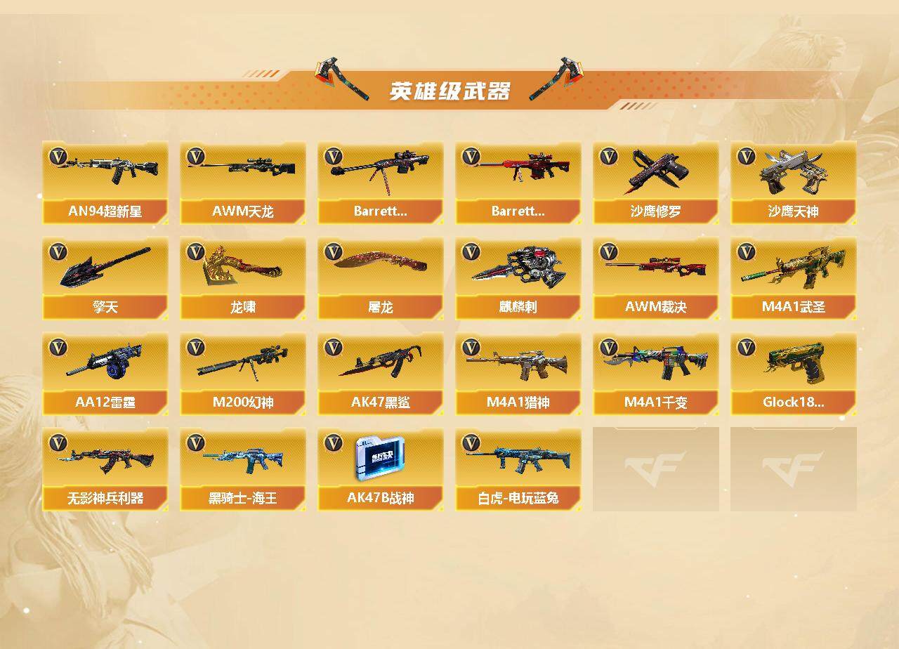 【英雄级武器】:M4A1-武圣,Glock18-武圣,QBZ03-金色蔷薇,HK417-朱雀,M4A1-青龙,白虎-电玩蓝兔,无影-神兵利器,M4A1-雷神*2,M4A1-黑骑士*2,M4A1-死神*4,RPK-盘龙*6,加特林-炼狱,汤姆逊-烈龙*6,AK47-无影*3,AK47-火麒麟*3,AK47-黑武士,AN94-超新星,AWM-天龙,Barrett-毁灭*2,Barrett-极光,AWM-裁决,AA-12-雷霆*4,M200-幻神*2,AK47-黑鲨*5,M4A1-猎神,M4A1-千变,黑骑士-海王,AK47-B-战神,沙鹰-天神*4,沙鹰-修罗*4,麒麟刺*3,擎天,龙啸*2,屠龙*2