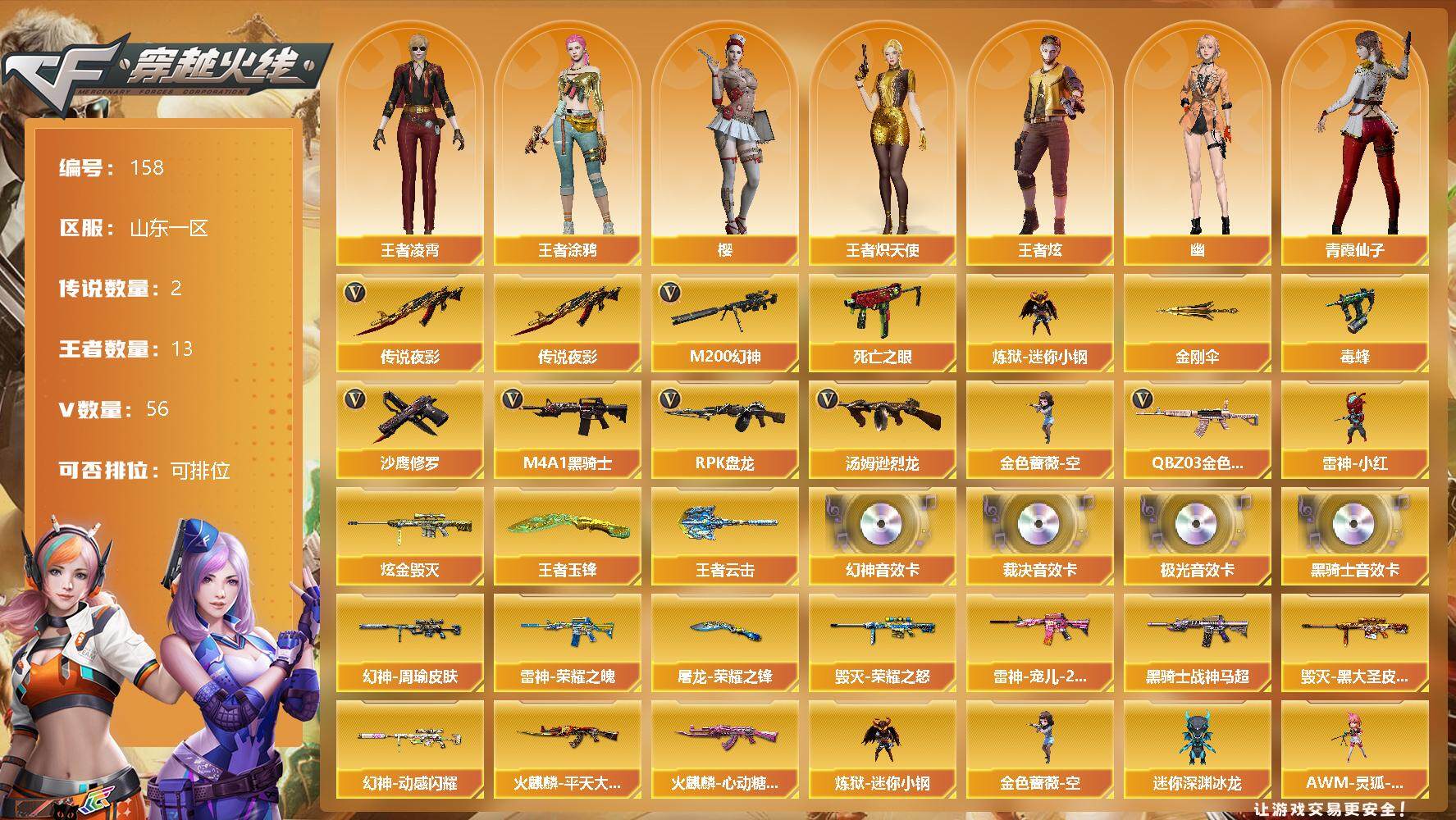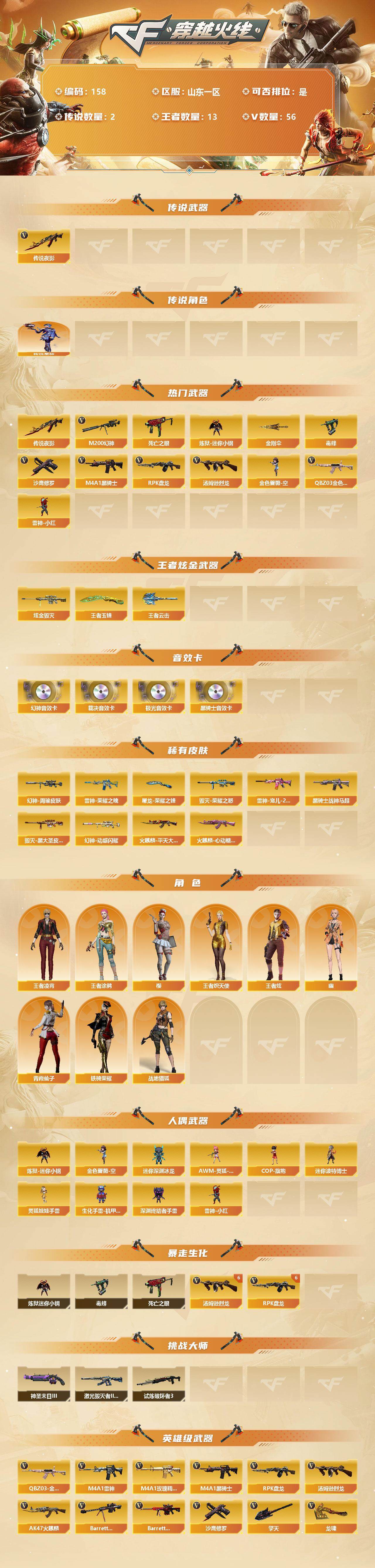 [12721344]山东一区-56V-13王者-1炫金 【传说武器】:传说夜影 【传说角色】:传说星骇 【热门武器】:传说夜影,QBZ03-金色蔷薇,M200-幻神,死亡之眼,炼狱-迷你小钢*3,毒蜂,M4A1-黑骑士*5,汤姆逊-烈龙*6,RPK-盘龙*6,金色蔷薇-空,雷神-小红,沙鹰-修罗*5,金刚伞*4 【王者炫金武器】:炫金毁灭,王者玉锋,王者云击 【音效卡】:M200-幻神音效卡,M4A1-黑骑士音效卡,Barrett-极光音效卡,AWM-裁决音效卡 【稀有皮肤】:幻神-周瑜皮肤,幻神-动感闪耀 皮肤,雷神-荣耀之魄,雷神-宠儿-2019MVP,火麒麟-平天大圣,火麒麟-心动糖果,黑骑士-战神马超,毁灭-荣耀之怒,毁灭-黑大圣皮肤,屠龙-荣耀之锋 【角色】:王者炫,王者凌霄,王者涂鸦,王者炽天使,樱,幽,战地猎狐,铁骑荣耀,青霞仙子 【人偶武器】:雷神-小红,金色蔷薇-空,AWM-灵狐-15周年嘉年华,COP-旗袍,炼狱-迷你小钢*3,迷你深渊冰龙,迷你波特博士,灵狐娃娃手雷,生化手雷-机甲核心,深渊终结者手雷 【暴走生化】:炼狱-迷你小钢*3,毒蜂,死亡之眼 【挑战大师】:神圣爆裂者-末日III,试炼破坏者III,激光毁灭者III-白马银枪*2 【英雄级武器】:烈火-动感闪耀,天神-动感闪耀,屠龙-动感闪耀,手雷-动感闪耀,QBZ03-金色蔷薇,无影-神兵利器,M4A1-雷神,M4A1-玫瑰精灵,M4A1-黑骑士*5,RPK-盘龙*6,汤姆逊-烈龙*6,AK47-火麒麟,Barrett-毁灭,Barrett-极光,AWM-裁决,AA-12-雷霆*2,M200-幻神,VSK-94-金蚀,黑武士-锦绣游龙,M4A1-赤狱骑士,沙鹰-修罗*5,麒麟刺,擎天*4,龙啸,屠龙 【特殊枪械】:5黑骑士,6烈龙,6盘龙