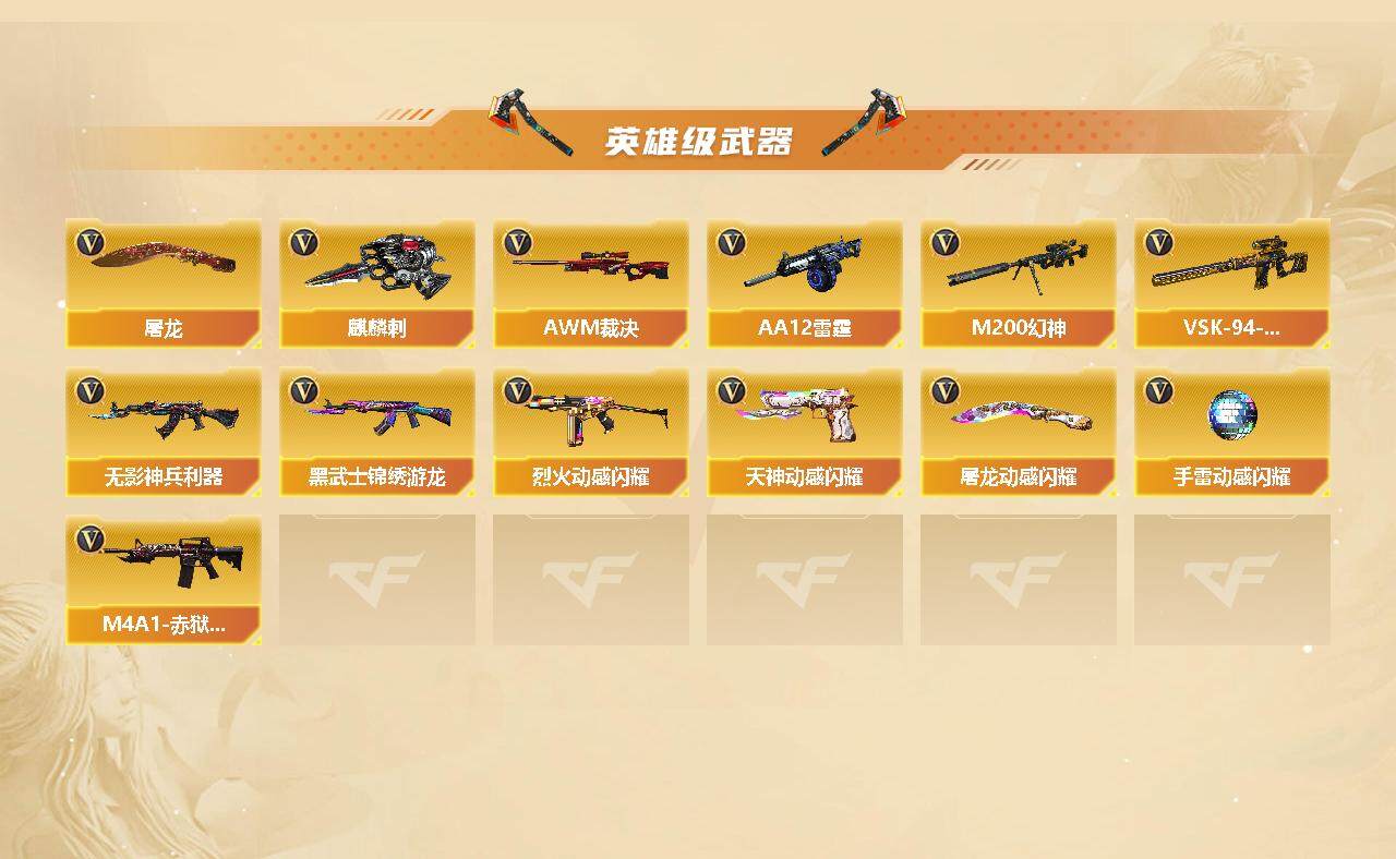 【英雄级武器】:烈火-动感闪耀,天神-动感闪耀,屠龙-动感闪耀,手雷-动感闪耀,QBZ03-金色蔷薇,无影-神兵利器,M4A1-雷神,M4A1-玫瑰精灵,M4A1-黑骑士*5,RPK-盘龙*6,汤姆逊-烈龙*6,AK47-火麒麟,Barrett-毁灭,Barrett-极光,AWM-裁决,AA-12-雷霆*2,M200-幻神,VSK-94-金蚀,黑武士-锦绣游龙,M4A1-赤狱骑士,沙鹰-修罗*5,麒麟刺,擎天*4,龙啸,屠龙