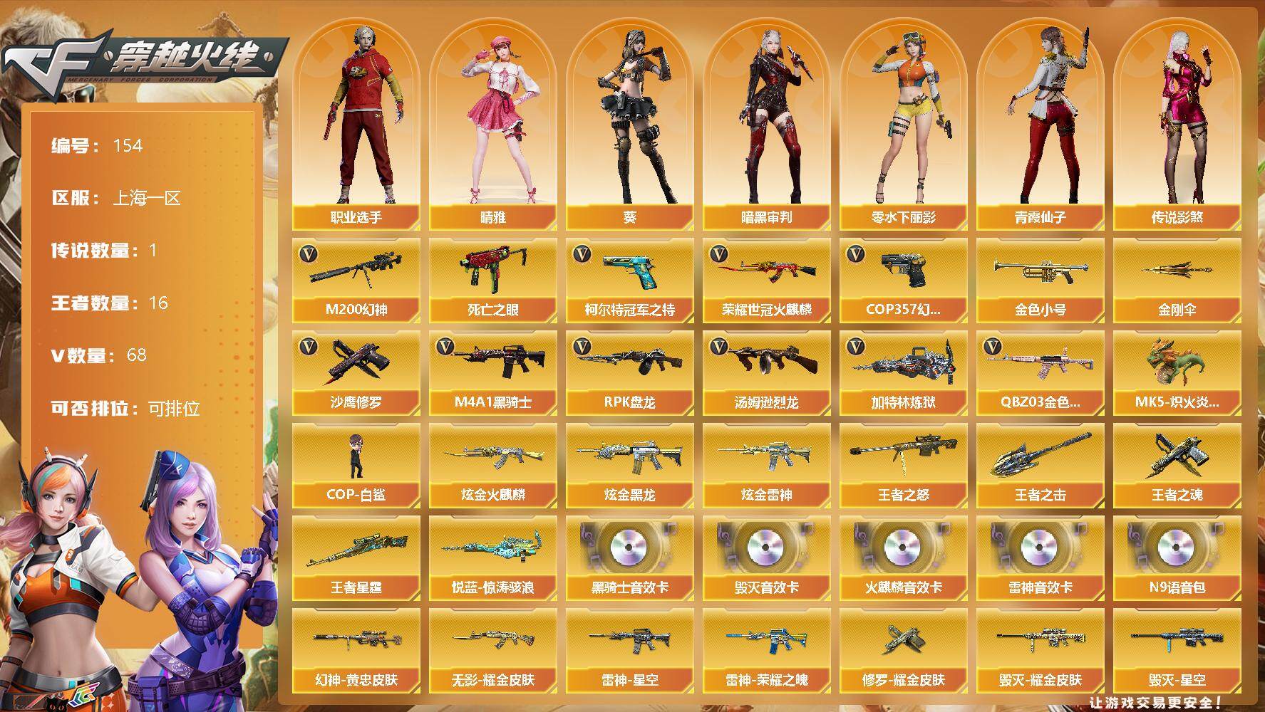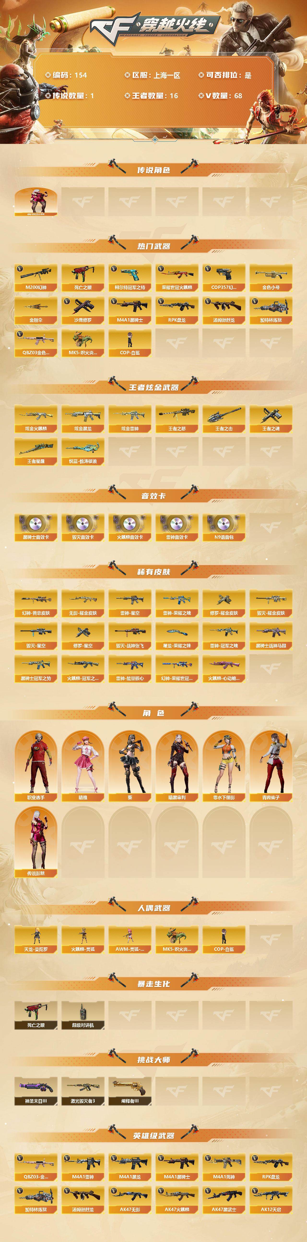 [12721208]上海一区-68V-16王者-3炫金 【传说角色】:传说影煞 【热门武器】:QBZ03-金色蔷薇,M200-幻神,死亡之眼,荣耀世冠-火麒麟,柯尔特-冠军之特,金色小号,M4A1-黑骑士,汤姆逊-烈龙,RPK-盘龙,加特林-炼狱*2,MK5-炽火炎龙,COP-白鲨,COP 357-幻灵,沙鹰-修罗*4,金刚伞 【王者炫金武器】:炫金火麒麟,炫金黑龙,炫金雷神,王者之怒,悦蓝-惊涛骇浪,王者星霆,王者之魂*2,王者之击 【音效卡】:AK47-火麒麟音效卡,M4A1-雷神音效卡,M4A1-黑骑士音效卡,Barrett-毁灭音效卡,N9语音包 【稀有皮肤】:M200-幻神-黄忠皮肤,M200-幻神-荣耀世冠白鲨,雷神-能量核心,雷神-荣耀之魄,雷神-星空,雷神-冠军之魄,火麒麟-冠军之心,火麒麟-心动糖果,黑骑士-冠军之势,黑骑士-战神马超,毁灭耀金皮肤,毁灭-星空,毁灭-战神张飞,无影耀金皮肤,修罗耀金皮肤,修罗-星空,屠龙-荣耀之锋*2 【角色】:传说影煞,零-水下丽影,葵,晴雅,职业选手,暗黑审判,青霞仙子 【人偶武器】:MK5-炽火炎龙,COP-白鲨,天龙-曼陀罗,火麒麟-灵狐,AWM-灵狐-15周年嘉年华 【暴走生化】:死亡之眼,超级对讲机 【挑战大师】:神圣爆裂者-末日III,阐释者III,激光毁灭者III 【英雄级武器】:QBZ03-云龙,唐刀-神工天巧,COP 357-幻灵,M4A1-武圣*2,Glock18-武圣,荣耀世冠-火麒麟,QBZ03-金色蔷薇,无影-神兵利器,M4A1-雷神*3,M4A1-黑龙*3,M4A1-黑骑士,M4A1-死神*2,RPK-盘龙,加特林-炼狱*2,汤姆逊-烈龙,AK47-无影,AK47-火麒麟*2,AK47-黑武士,AK12-天启,AN94-超新星,AWM-天龙,Barrett-毁灭*2,Barrett-极光,M4A1-龙血,AK47-机械迷城*2,AA-12-雷霆,M200-幻神,AK47-黑鲨,M4A1-千变,黑武士-锦绣游龙,AK-47-猩红传说,柯尔特-冠军之特,沙鹰-天神,沙鹰-修罗*4,擎天,龙啸*2,屠龙*4 【特殊枪械】:1黑骑士,1烈龙,1盘龙,2炼狱