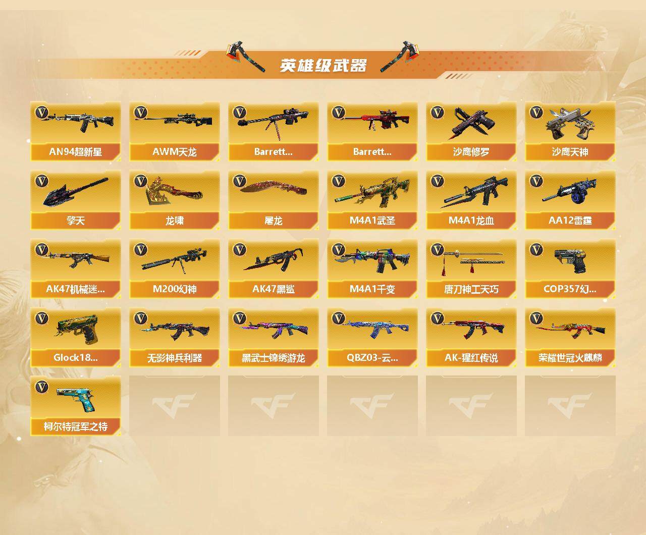 【英雄级武器】:QBZ03-云龙,唐刀-神工天巧,COP 357-幻灵,M4A1-武圣*2,Glock18-武圣,荣耀世冠-火麒麟,QBZ03-金色蔷薇,无影-神兵利器,M4A1-雷神*3,M4A1-黑龙*3,M4A1-黑骑士,M4A1-死神*2,RPK-盘龙,加特林-炼狱*2,汤姆逊-烈龙,AK47-无影,AK47-火麒麟*2,AK47-黑武士,AK12-天启,AN94-超新星,AWM-天龙,Barrett-毁灭*2,Barrett-极光,M4A1-龙血,AK47-机械迷城*2,AA-12-雷霆,M200-幻神,AK47-黑鲨,M4A1-千变,黑武士-锦绣游龙,AK-47-猩红传说,柯尔特-冠军之特,沙鹰-天神,沙鹰-修罗*4,擎天,龙啸*2,屠龙*4