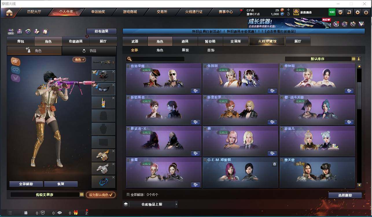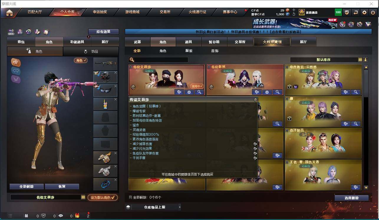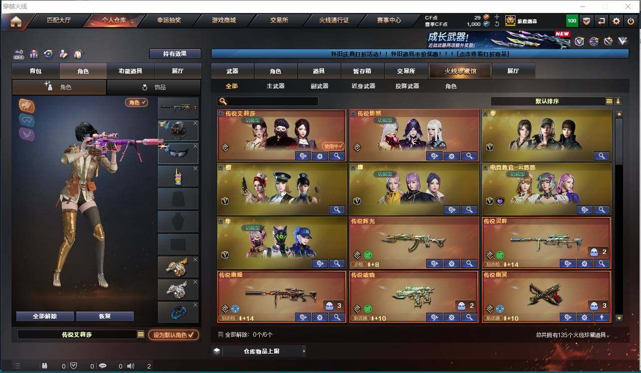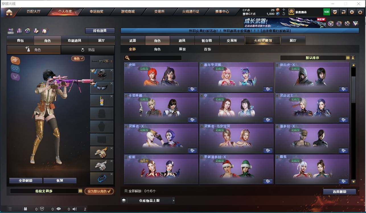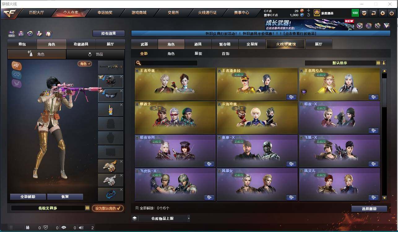 - [10744569]实名: 可修改 时装数: 111 枪械数: 50 战备数: 28 热门装扮: 霓裳武神,暗夜鎏金,纯珍童话 稀有枪皮: MG3洛神天依,M24翩跹演武