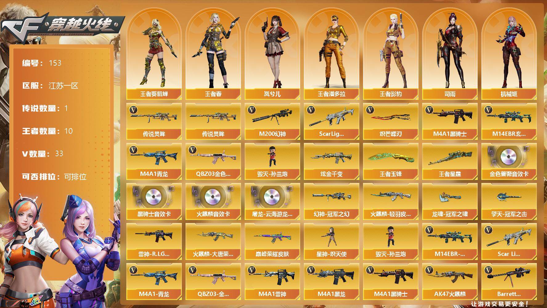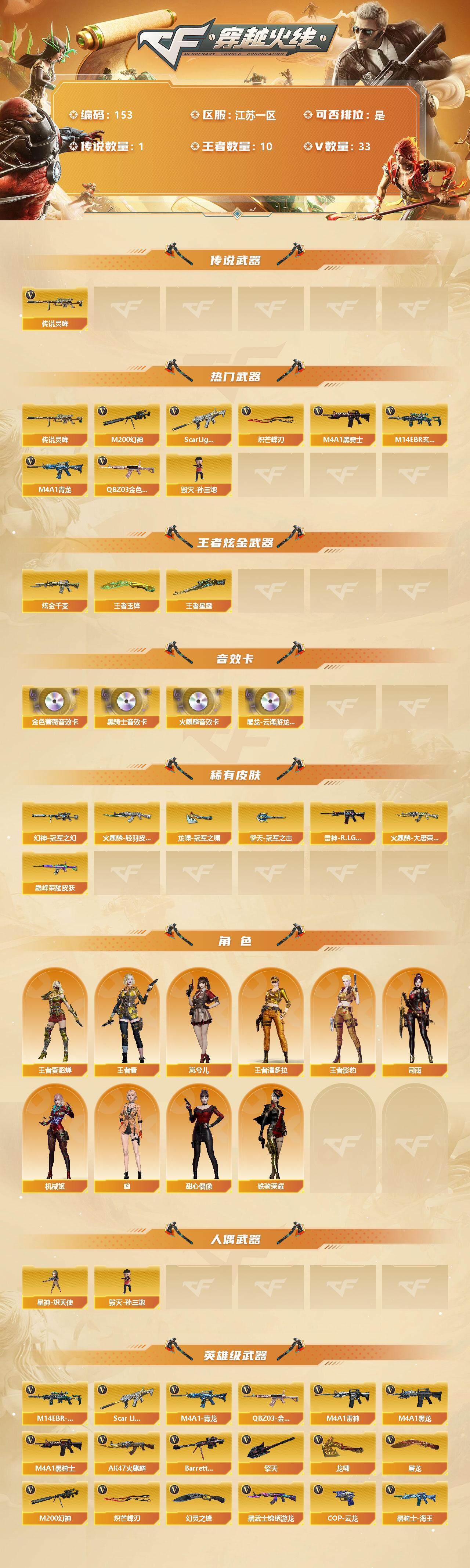 [12721029]江苏一区-33V-10王者-1炫金 【传说武器】:传说灵眸 【热门武器】:传说灵眸,QBZ03-金色蔷薇,M14EBR-玄武,Scar Light-白虎,M4A1-青龙,M200-幻神,M4A1-黑骑士,毁灭-孙三炮,炽芒蝶刃 【王者炫金武器】:炫金千变,王者星霆,王者玉锋 【音效卡】:屠龙-云海游龙音效卡,AK47-火麒麟音效卡,M4A1-黑骑士音效卡,QBZ03-金色蔷薇音效卡 【稀有皮肤】:幻神-冠军之幻,QBZ03-巅峰荣耀皮肤,雷神-R.LGD-CFPLS18冠军,火麒麟-轻羽皮肤,火麒麟-大唐荣光,擎天-冠军之击,龙啸-冠军之啸 【角色】:王者-葵-貂蝉,王者春,王者影豹,王者潘多拉,幽,岚兮儿,机械姬,司雨,铁骑荣耀,甜心偶像 【人偶武器】:毁灭-孙三炮,星神-炽天使 【英雄级武器】:COP 357-云龙,幻灵之锋,QBZ03-金色蔷薇,M14EBR-玄武,Scar Light-白虎,M4A1-青龙,M4A1-雷神,M4A1-黑龙,M4A1-黑骑士,AK47-火麒麟,Barrett-毁灭,M200-幻神,黑武士-锦绣游龙,黑骑士-海王,炽芒蝶刃,擎天,龙啸,屠龙*2 【特殊枪械】:1白虎,1黑骑士
